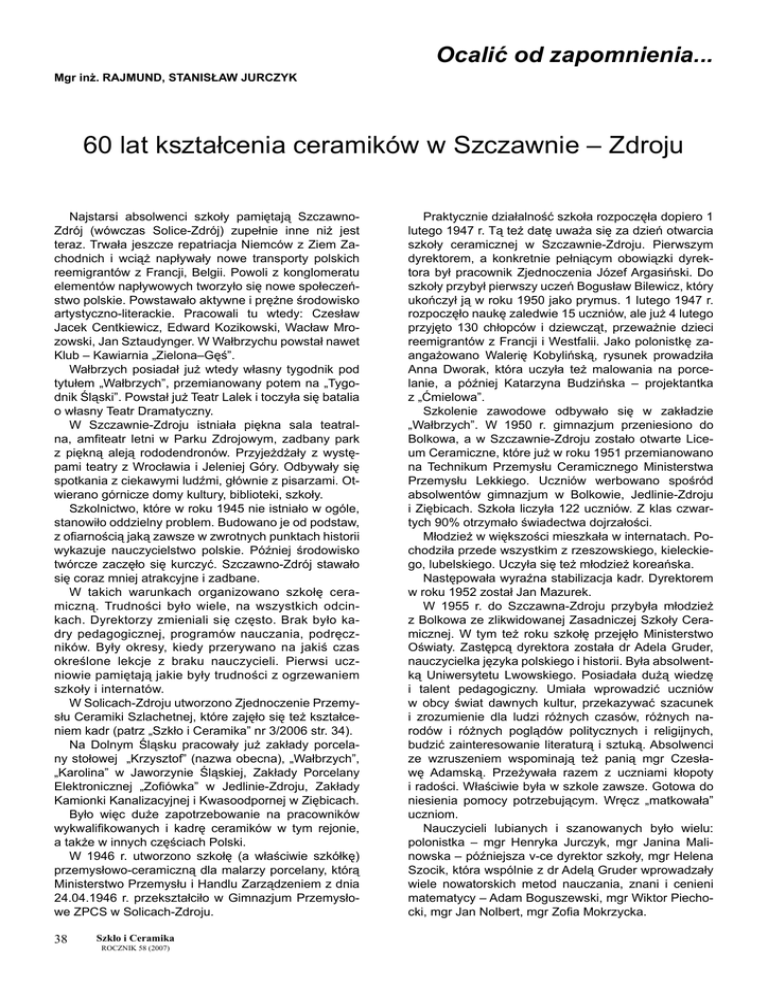Mgr inż. Rajmund, Stanisław Jurczyk Ocalić od zapomnienia... 60 lat kształcenia ceramików w Szczawnie – Zdroju Najstarsi absolwenci szkoły pamiętają SzczawnoZdrój (wówczas Solice-Zdrój) zupełnie inne niż jest teraz. Trwała jeszcze repatriacja Niemców z Ziem Zachodnich i wciąż napływały nowe transporty polskich reemigrantów z Francji, Belgii. Powoli z konglomeratu elementów napływowych tworzyło się nowe społeczeństwo polskie. Powstawało aktywne i prężne środowisko artystyczno-literackie. Pracowali tu wtedy: Czesław Jacek Centkiewicz, Edward Kozikowski, Wacław Mrozowski, Jan Sztaudynger. W Wałbrzychu powstał nawet Klub – Kawiarnia „Zielona–Gęś”. Wałbrzych posiadał już wtedy własny tygodnik pod tytułem „Wałbrzych”, przemianowany potem na „Tygodnik Śląski”. Powstał już Teatr Lalek i toczyła się batalia o własny Teatr Dramatyczny. W Szczawnie-Zdroju istniała piękna sala teatralna, amfiteatr letni w Parku Zdrojowym, zadbany park z piękną aleją rododendronów. Przyjeżdżały z występami teatry z Wrocławia i Jeleniej Góry. Odbywały się spotkania z ciekawymi ludźmi, głównie z pisarzami. Otwierano górnicze domy kultury, biblioteki, szkoły. Szkolnictwo, które w roku 1945 nie istniało w ogóle, stanowiło oddzielny problem. Budowano je od podstaw, z ofiarnością jaką zawsze w zwrotnych punktach historii wykazuje nauczycielstwo polskie. Później środowisko twórcze zaczęło się kurczyć. Szczawno-Zdrój stawało się coraz mniej atrakcyjne i zadbane. W takich warunkach organizowano szkołę ceramiczną. Trudności było wiele, na wszystkich odcinkach. Dyrektorzy zmieniali się często. Brak było kadry pedagogicznej, programów nauczania, podręczników. Były okresy, kiedy przerywano na jakiś czas określone lekcje z braku nauczycieli. Pierwsi uczniowie pamiętają jakie były trudności z ogrzewaniem szkoły i internatów. W Solicach-Zdroju utworzono Zjednoczenie Przemysłu Ceramiki Szlachetnej, które zajęło się też kształceniem kadr (patrz „Szkło i Ceramika” nr 3/2006 str. 34). Na Dolnym Śląsku pracowały już zakłady porcelany stołowej „Krzysztof” (nazwa obecna), „Wałbrzych”, „Karolina” w Jaworzynie Śląskiej, Zakłady Porcelany Elektronicznej „Zofiówka” w Jedlinie-Zdroju, Zakłady Kamionki Kanalizacyjnej i Kwasoodpornej w Ziębicach. Było więc duże zapotrzebowanie na pracowników wykwalifikowanych i kadrę ceramików w tym rejonie, a także w innych częściach Polski. W 1946 r. utworzono szkołę (a właściwie szkółkę) przemysłowo-ceramiczną dla malarzy porcelany, którą Ministerstwo Przemysłu i Handlu Zarządzeniem z dnia 24.04.1946 r. przekształciło w Gimnazjum Przemysłowe ZPCS w Solicach-Zdroju. 38 Szkło i Ceramika ROCZNIK 58 (2007) Praktycznie działalność szkoła rozpoczęła dopiero 1 lutego 1947 r. Tą też datę uważa się za dzień otwarcia szkoły ceramicznej w Szczawnie-Zdroju. Pierwszym dyrektorem, a konkretnie pełniącym obowiązki dyrektora był pracownik Zjednoczenia Józef Argasiński. Do szkoły przybył pierwszy uczeń Bogusław Bilewicz, który ukończył ją w roku 1950 jako prymus. 1 lutego 1947 r. rozpoczęło naukę zaledwie 15 uczniów, ale już 4 lutego przyjęto 130 chłopców i dziewcząt, przeważnie dzieci reemigrantów z Francji i Westfalii. Jako polonistkę zaangażowano Walerię Kobylińską, rysunek prowadziła Anna Dworak, która uczyła też malowania na porcelanie, a później Katarzyna Budzińska – projektantka z „Ćmielowa”. Szkolenie zawodowe odbywało się w zakładzie „Wałbrzych”. W 1950 r. gimnazjum przeniesiono do Bolkowa, a w Szczawnie-Zdroju zostało otwarte Liceum Ceramiczne, które już w roku 1951 przemianowano na Technikum Przemysłu Ceramicznego Ministerstwa Przemysłu Lekkiego. Uczniów werbowano spośród absolwentów gimnazjum w Bolkowie, Jedlinie-Zdroju i Ziębicach. Szkoła liczyła 122 uczniów. Z klas czwartych 90% otrzymało świadectwa dojrzałości. Młodzież w większości mieszkała w internatach. Pochodziła przede wszystkim z rzeszowskiego, kieleckiego, lubelskiego. Uczyła się też młodzież koreańska. Następowała wyraźna stabilizacja kadr. Dyrektorem w roku 1952 został Jan Mazurek. W 1955 r. do Szczawna-Zdroju przybyła młodzież z Bolkowa ze zlikwidowanej Zasadniczej Szkoły Ceramicznej. W tym też roku szkołę przejęło Ministerstwo Oświaty. Zastępcą dyrektora została dr Adela Gruder, nauczycielka języka polskiego i historii. Była absolwentką Uniwersytetu Lwowskiego. Posiadała dużą wiedzę i talent pedagogiczny. Umiała wprowadzić uczniów w obcy świat dawnych kultur, przekazywać szacunek i zrozumienie dla ludzi różnych czasów, różnych narodów i różnych poglądów politycznych i religijnych, budzić zainteresowanie literaturą i sztuką. Absolwenci ze wzruszeniem wspominają też panią mgr Czesławę Adamską. Przeżywała razem z uczniami kłopoty i radości. Właściwie była w szkole zawsze. Gotowa do niesienia pomocy potrzebującym. Wręcz „matkowała” uczniom. Nauczycieli lubianych i szanowanych było wielu: polonistka – mgr Henryka Jurczyk, mgr Janina Malinowska – późniejsza v-ce dyrektor szkoły, mgr Helena Szocik, która wspólnie z dr Adelą Gruder wprowadzały wiele nowatorskich metod nauczania, znani i cenieni matematycy – Adam Boguszewski, mgr Wiktor Piechocki, mgr Jan Nolbert, mgr Zofia Mokrzycka. Nauczyciel w.f. B. Bobeł (4 od prawej) z grupą koszykarzy Rok 1965. Grupa nauczycielek (od lewej): I. Kossowska, A. Gruder, L. Zalewska, H. Jurczyk, D. Babicka Bolków 1952 r. Rok 1969. Panie profesorki (od lewej): J. Malinowska, A. Gruder, A. Dworak, C. Adamska Uczniowie (od lewej): S.R. Jurczyk, S. Masternak, P. Szykuła W szkole była dobrze wyposażona biblioteka i czytelnia dla młodzieży i nauczycieli – ulubione „dziecko” bibliotekarki H. Jurczyk. Wielką popularnością cieszył się sport. Nauczyciel wychowa
