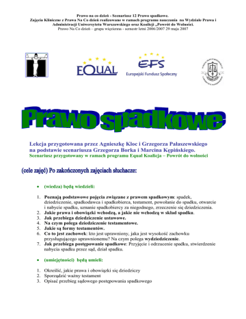 Prawo na co dzień - Scenariusz 12 Prawo spadkowe. Zajęcia Kliniczne z Prawa Na Co dzień realizowane w ramach programu nauczania na Wydziale Prawa i Administracji Uniwersytetu Warszawskiego oraz Koalicji „Powrót do Wolności. Prawo Na Co dzień – grupa więzienna - semestr letni 2006/2007 29 maja 2007 ssp Lekcja przygotowana przez Agnieszkę Kloc i Grzegorza Pałaszewskiego na podstawie scenariusza Grzegorza Borka i Marcina Kępińskiego. Scenariusz przygotowany w ramach programu Equal Koalicja – Powrót do wolności • (wiedza) będą wiedzieli: 1. Poznają podstawowe pojęcia związane z prawem spadkowym: spadek, dziedziczenie, spadkodawca i spadkobierca, testament, powołanie do spadku, otwarcie i nabycie spadku, uznanie spadkobiercy za niegodnego, zrzeczenie się dziedziczenia. 2. Jakie prawa i obowiązki wchodzą, a jakie nie wchodzą w skład spadku. 3. Jak przebiega dziedziczenie ustawowe. 4. Na czym polega dziedziczenie testamentowe. 5. Jakie są formy testamentów. 6. Co to jest zachowek: kto jest uprawniony, jaka jest wysokość zachowku przysługującego uprawnionemu? Na czym polega wydziedziczenie. 7. Jak przebiega postępowanie spadkowe: Przyjęcie i odrzucenie spadku, stwierdzenie nabycia spadku przez sąd, dział spadku. • (umiejętności) będą umieli: 1. Określić, jakie prawa i obowiązki się dziedziczy 2. Sporządzić waŜny testament 3. Opisać przebieg sądowego postępowania spadkowego Prawo na co dzień - Scenariusz 12 Prawo spadkowe. Zajęcia Kliniczne z Prawa Na Co dzień realizowane w ramach programu nauczania na Wydziale Prawa i Administracji Uniwersytetu Warszawskiego oraz Koalicji „Powrót do Wolności. Prawo Na Co dzień – grupa więzienna - semestr letni 2006/2007 29 maja 2007 • (wartości- cele wychowawcze) będą rozumieli, Ŝe: 1. W polskim systemie prawnym obowiązuje zasada swobody testowania z ustawowymi zabezpieczeniami dla osób najbliŜszych w formie zachowków. 2. Spadek moŜna przyjąć albo odrzucić, co, zwaŜywszy na składniki spadku moŜe okazać się najlepszą opcją dla spadkobiercy. 3. Tylko waŜnie sporządzony testament pozwala na zrealizowanie woli spadkodawcy w sposób pełny. 1. 2. 3. 4. Mini wykład Pytania do uczestników AŜurowa piła Kazusy . Pytania sprawdzające. NaleŜy przygotować: Plansze z pojęciami z zakresu prawa spadkowego Planszę z przykładową masą spadkową, by w sposób obrazowy przedstawić udziały w spadku (dziedziczenie testamentowe) 1. 2. 3. 4. 5. 6. 7. 8. Wprowadzenie, czyli, o co chodzi. Co wchodzi do spadku. ReŜimy spadkobrania Dziedziczenie ustawowe Dziedziczenie testamentowe Formy testamentów. Zachowek, wydziedziczenie. Postępowanie spadkowe. Bibliografia: 1. Drzewicki M., (2004), Spadek. Dziedziczenie. Testament. Wydawnictw Harmonia: Gdańsk 2. Skowrońska-Bocian E., (2003), Prawo spadkowe. (wyd.3) C.H. Beck: Warszawa 3. Kodeks Cywilny (Księga IV) art. 922-1088 Prawo na co dzień - Scenariusz 12 Prawo spadkowe. Zajęcia Kliniczne z Prawa Na Co dzień realizowane w ramach programu nauczania na Wydziale Prawa i Administracji Uniwersytetu Warszawskiego oraz Koalicji „Powrót do Wolności. Prawo Na Co dzień – grupa więzienna - semestr letni 2006/2007 29 maja 2007 4. Kodeks Postępowania Cywilnego (Część I, księga II, tytuł II, dział IV) art., 627691 Ad. 1 Wprowadzenie, czyli, o co chodzi. 10-15min (CO) (PO CO) (JAK) Krótki wstęp śeby osoby uczestniczące wiedziały, czego się spodziewać Wykład Przygotowujemy plansze z podstawowymi pojęciami, aby zwizualizować to, o czym będziemy mówić. Krótkie definicje przedstawianych pojęć. Na wstępie informujemy uczestników, Ŝe tematem zajęć będzie prawo spadkowe. Mówimy, iŜ prawo spadkowe normuje skutki prawne śmierci osoby fizycznej. Zapoznajemy uczestników ze źródłami prawa spadkowego i podstawowymi pojęciami związanymi z prawem spadkowym, aby stworzyć merytoryczne podstawy do kolejnych aktywności. Jakie przepisy prawne regulują problematykę dziedziczenia? Podstawowym aktem prawnym, który reguluje dziedziczenie i spadkobranie jest kodeks cywilny (art. 922-1088 KC). Księga czwarta tej ustawy zatytułowana „Spadki” zawiera kompleksową regulację tej problematyki. NaleŜy wspomnieć, Ŝe z dziedziczeniem związane są teŜ pewne obowiązki o charakterze publicznoprawnym, tj. obowiązki podatkowe. Spadkobierca jest zobowiązany do uiszczenia podatku, a kwestię tę reguluje ustawa z dnia 28 lipca 1983r. o podatku od spadków i darowizn (Dz. U. z 1997r., Nr 16, poz. 89, z późniejszymi zmianami). Przepisy dotyczące postępowania sądowego w sprawach spadkowych zawarte są w kodeksie postępowania cywilnego (art.627-691 KPC). Podkreślamy takŜe, iŜ sama Konstytucja stoi na straŜy dziedziczenia. Art. 21 pkt 1 Konstytucji („Rzeczpospolita Polska chroni własność i prawo dziedziczenia.”) Podstawowe pojęcia związane z prawem spadkowym. ŚMIERĆ OSOBY FIZYCZNEJ -chwilę śmierci (data, godzina, miejsce) oznacza się w decyzji administracyjnej zwanej „aktem zgonu”. Akt zgonu uzyskujemy w urzędzie stanu cywilnego. Jest on wystawiany na podstawie karty zgonu, które to zaświadczenie wystawia lekarz lub zakład słuŜby zdrowia, bądź teŜ na podstawie pisemnego zgłoszenia dokonanego przez organ prowadzący postępowanie co do okoliczności zgonu lub na podstawie orzeczenia sądu o uznaniu za zmarłego lub o stwierdzeniu zgonu. (z ustawy prawo o aktach stanu cywilnego) Śmierć osoby fizycznej jest zdarzeniem prawnym rodzącym skutki prawne w zakresie prawa spadkowego. Chwila śmierci jest chwilą otwarcia spadku. Spadkobierca nabywa spadek z chwilą jego otwarcia, tzn. Ŝe w chwili śmierci spadkodawcy spadkobierca nabywa spadek bez podejmowania jakichkolwiek czynności ze swojej strony. SPADKODAWCA –osoba fizyczna, po śmierci której jej majątek przechodzi na inne podmioty, tzn. spadkobierców. Prawo na co dzień - Scenariusz 12 Prawo spadkowe. Zajęcia Kliniczne z Prawa Na Co