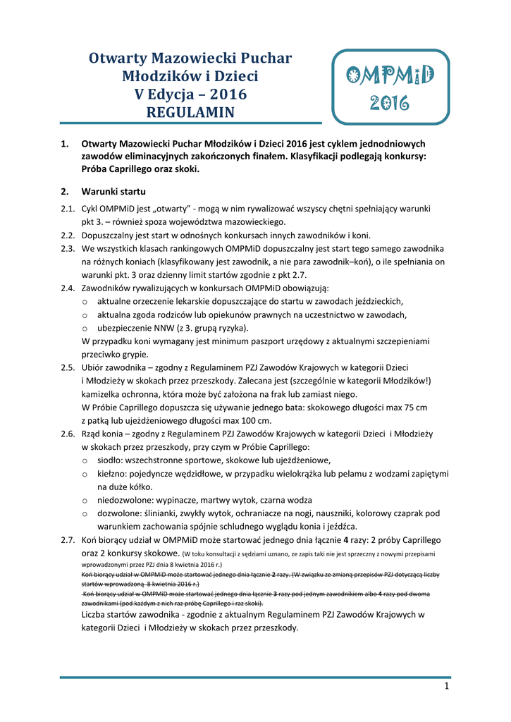 Otwarty Mazowiecki Puchar Młodzików i Dzieci V Edycja – 2016 REGULAMIN 1. Otwarty Mazowiecki Puchar Młodzików i Dzieci 2016 jest cyklem jednodniowych zawodów eliminacyjnych zakończonych finałem. Klasyfikacji podlegają konkursy: Próba Caprillego oraz skoki. 2. Warunki startu 2.1. Cykl OMPMiD jest „otwarty” - mogą w nim rywalizować wszyscy chętni spełniający warunki pkt 3. – również spoza województwa mazowieckiego. 2.2. Dopuszczalny jest start w odnośnych konkursach innych zawodników i koni. 2.3. We wszystkich klasach rankingowych OMPMiD dopuszczalny jest start tego samego zawodnika na różnych koniach (klasyfikowany jest zawodnik, a nie para zawodnik–koń), o ile spełniania on warunki pkt. 3 oraz dzienny limit startów zgodnie z pkt 2.7. 2.4. Zawodników rywalizujących w konkursach OMPMiD obowiązują: o aktualne orzeczenie lekarskie dopuszczające do startu w zawodach jeździeckich, o aktualna zgoda rodziców lub opiekunów prawnych na uczestnictwo w zawodach, o ubezpieczenie NNW (z 3. grupą ryzyka). W przypadku koni wymagany jest minimum paszport urzędowy z aktualnymi szczepieniami przeciwko grypie. 2.5. Ubiór zawodnika – zgodny z Regulaminem PZJ Zawodów Krajowych w kategorii Dzieci i Młodzieży w skokach przez przeszkody. Zalecana jest (szczególnie w kategorii Młodzików!) kamizelka ochronna, która może być założona na frak lub zamiast niego. W Próbie Caprillego dopuszcza się używanie jednego bata: skokowego długości max 75 cm z patką lub ujeżdżeniowego długości max 100 cm. 2.6. Rząd konia – zgodny z Regulaminem PZJ Zawodów Krajowych w kategorii Dzieci i Młodzieży w skokach przez przeszkody, przy czym w Próbie Caprillego: o siodło: wszechstronne sportowe, skokowe lub ujeżdżeniowe, o kiełzno: pojedyncze wędzidłowe, w przypadku wielokrążka lub pelamu z wodzami zapiętymi na duże kółko. o niedozwolone: wypinacze, martwy wytok, czarna wodza o dozwolone: ślinianki, zwykły wytok, ochraniacze na nogi, nauszniki, kolorowy czaprak pod warunkiem zachowania spójnie schludnego wyglądu konia i jeźdźca. 2.7. Koń biorący udział w OMPMiD może startować jednego dnia łącznie 4 razy: 2 próby Caprillego oraz 2 konkursy skokowe. (W toku konsultacji z sędziami uznano, ze zapis taki nie jest sprzeczny z nowymi przepisami wprowadzonymi przez PZJ dnia 8 kwietnia 2016 r.) Koń biorący udział w OMPMiD może startować jednego dnia łącznie 2 razy. (W związku ze zmianą przepisów PZJ dotyczącą liczby startów wprowadzoną 8 kwietnia 2016 r.) Koń biorący udział w OMPMiD może startować jednego dnia łącznie 3 razy pod jednym zawodnikiem albo 4 razy pod dwoma zawodnikami (pod każdym z nich raz próbę Caprillego i raz skoki). Liczba startów zawodnika - zgodnie z aktualnym Regulaminem PZJ Zawodów Krajowych w kategorii Dzieci i Młodzieży w skokach przez przeszkody. 1 3. Klasy rankingowe Kategoria Wiek zawodnika Koń Amator/Licencja PZJ Młodzik 9-11 lat Kuc do 148 cm Amator lub licencja Dziecko 11-14 lat Kuc lub koń minimum wstępna A, B (C) Open+ powyżej 12 lat Kuc D lub koń Uwaga! Wiek zawodnika określany jest wg roku urodzenia. 4. Kalendarz zawodów (rozgrywanych w ramach Zawodów Regionalnych lub Towarzyskich w skokach) Rok 2016 8 maja 29 maja 5 czerwca 19 czerwca 25 września 2 października 5. Niedziela Niedziela Niedziela Niedziela Niedziela Niedziela Eliminacja I II (+LM) III IV V Finał Miejsce TKKF Hubert Warszawa LKS Wolta Żółwin SHS Grobice KJ Amber Horse Milanówek TKKF Hubert Warszawa SHS Grobice Program konkursów zaliczanych do klasyfikacji OMPMiD: Kategoria Eliminacja Próba Caprillego Skoki konkurs dokładności, (art. 238.1.1) I – IV V i Finał I –V Finał Cap-40-LL-2 Cap-60-L-1 Młodzik 50-55 cm 60-65 cm 40-45 cm 50-55 cm Cap-40-LL-4 Cap-60-L-1 Dziecko 60-65 cm 70-75 cm 50-55 cm 60-65 cm Cap-40-LL-3 Cap-60-P-1 Open+ 60-65 cm 70-75 cm 50-55 cm 60-65 cm * Uwaga! Zawodnik posiadający minimum wstępną licencję PZJ A lub B może wybrać z propozycji zawodów inny (wyższy) konkurs dokładności (art. 238.1.1) i jego wynik będzie zaliczony w klasyfikacji OMPMiD. Wybranie wyższego konkursu nie przekłada się na wyższy wynik w klasyfikacji. 6. Punktacja i zasady rankingu 6.1. O zajętym miejscu w OMPMiD decyduje suma maksimum trzech najlepszych wyników z zawodów OMPMiD (przy czym wynik finału jest obliczany z mnożnikiem 1,2 – patrz pkt 6.2), liczona wg poniższych zasad: 6.2. Próba Caprillego – wynik procentowy przeliczony wg formuły WKKW (100 minus wynik procentowy razy 1,5) z uwzględnieniem mnożnika handicapu (patrz pkt. 6.5): Eliminacje [100 – (ocena Próby Caprillego * handicap)] * 1,5 Finał [100 – (ocena Próby Caprillego * handicap * 1,2)] * 1,5 6.3. Konkurs skokowy – wg zasad konkursu dokładności (art. 238.1.1). 6.4. O zajętym miejscu decyduje suma punktów karnych obliczonych wg pkt 6.2 i pkt 6.3. 2 6.5. Mnożniki rankingowe wyników Próby Caprillego (tzw. „handicap”) wg grup wzrostu koni: Kuc/Koń Wzrost Młodzik Dziecko Open+ Grupa A i B Max. 130 cm 1,05 1,05 Grupa C 131 - 140 cm 1,03 1,05 Grupa D 141 - 148 cm 1,00 1,05 1,05 Mały koń 149 - 156 cm 1,03 1,03 Duży koń Powyżej 156 cm 1,00 1,00 6.6. Uwaga! Warunkiem zaliczenia do rankingu OMPMiD wyników zawodów eliminacyjnych lub finału jest ukończenie obu konkursów danej klasy (Próby Caprillego i skoków)! 7. Nagrody 7.1. Poszczególne konkursy eliminacji i finału – wg propozycji organizatora. 7.2. Organizatorzy zapewniają wszystkim uczestnikom cyklu pamiątkowe flot oraz ewentualne nagrody rzeczowe od sponsorów OMPMiD. 7.3. Klasyfikacja końcowa OMPMiD – nagrody rzeczowe. Nagrodzonych będzie niezależnie od ilości startujących w cyklu minimum po pięciu najlepszych zawodników w rankingu końcowym danej klasy rankingowej OMPMiD. Uwaga! Warunkiem odbioru nagrody końcowego rankingu OMPMiD przez zawodnika, który nie uczestniczył w finale jest wcześniejsze powiadomienie organizat