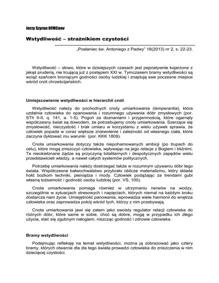 Jerzy Szyran OFMConv Wstydliwość – strażnikiem czystości „Posłaniec św. Antoniego z Padwy” 18(2013) nr 2, s. 22-23. Wstydliwość – słowo, które w dzisiejszych czasach jest pejoratywnie kojarzone z jakąś pruderią, nie licującą już z postępem XXI w. Tymczasem bramy wstydliwości są wciąż szańcem broniącym godności osoby ludzkiej i znajdują swe poczesne miejsce wśród cnót chrześcijańskich. Umiejscowienie wstydliwości w hierarchii cnót Wstydliwość należy do pochodnych cnoty umiarkowania (temperantia), która uzdalnia człowieka do opanowania i rozumnego używania dóbr zmysłowych (por. STh II-II, q. 141, a. 1-5). Pogoń za doznaniami i przyjemnością, które ogarnęły współczesny świat są dowodem, że potrzebujemy cnoty umiarkowania. Szerzące się zmysłowość, nieczystość i brak umiaru w korzystaniu z wielu używek sprawia, że człowiek popada w coraz większe zniewolenie i zależność od własnego ciała, które zaczyna dyktować mu warunki (por. KKK 1809). Cnota umiarkowania dotyczy także niepohamowanych ambicji (po trupach do celu), które mogą zniszczyć człowieka, wpływając na jego relacje z Bogiem i bliźnimi. Te nieokiełznane żądze są przyczyną totalitarnych i despotycznych zapędów wielu przedstawicieli władzy, a nawet całych systemów politycznych. Potrzebę umiarkowania należy dostrzegać także w rozumnym używaniu dóbr tego świata. Współczesne bałwochwalstwo przybrało oblicze materializmu, który składa hołd bożkom techniki, pieniądza i mody. Człowiek podążając za trendami gubi własną tożsamość i godność osoby ludzkiej (por. VS, 100). Cnota umiarkowania pomaga również w utrzymaniu nerwów na wodzy, szczególnie w sytuacjach stresowych i napięciach, których niemal na każdym kroku dostarcza nam życie. Umiejętność panowania, wprowadza wiele harmonii do wnętrza człowieka oraz zaprowadza pokój wśród tych, którzy z nim przebywają. Cnota umiarkowania jawi się zatem jako swoisty regulator relacji człowieka do różnych dóbr, które same w sobie, choć są dobre, mogą w przypadku ich złego użycia, stać się zgubnym nałogiem, niszcząc godność i zdrowie człowieka. Bramy wstydliwości Podejmując refleksję na temat wstydliwości, można ją zobrazować jako cztery bramy, których otwarcie dla zła tego świata prowadzi człowieka do zniszczenia w nim dziecięcej czystości. Pierwszą z tych bram jest ludzki wzrok, który jako światło ciała (por. Mt 6,22) może do wnętrza człowieka wprowadzić zamęt. Wszelkie bowiem obrazy pozostają w ludzkiej uświadomionej i nieuświadomionej pamięci, wzbudzając fantazje, wspomnienia i pożądliwość. Drugą bramą wstydliwości, która wymaga chronienia jest ludzki słuch. Narząd ten dostarcza ludzkiemu wnętrzu doznań słuchowych, z których można wyodrębnić dobrą albo złą mowę. Niestosowne słowa, żarty, dwuznaczne rozmowy, podobnie jak obrazy, pozostają w umyśle człowieka, tworząc w jego wnętrzu aurę sprzyjającą powstawaniu nieczystości. Ważną bramą dla ludzkiej wstydliwości jest ludzka ciekawość, niejednokrotnie symbolizowana przez nos (wsadzanie nosa w nie swoje sprawy). Ciekawość i pęd do poznania są walorami człowieka inteligentnego. Jednak ciekawość może przybrać także zły kierunek, gdy jej skutkiem jest rozbudzenie zmysłów i pożądliwość. Ważną bramą w zachowaniu wstydliwości jest wygląd zewnętrzny, który stanowi pewien obraz wnętrza człowieka. Współczesny świat reklam postawił sobie za cel przekonanie ludzkości, iż wygląd, make up, styl i moda dają gwarancję sukcesu zawodowego, towarzyskiego i są źródłem ludzkiego szczęścia. Styliści i wizarzyści prześcigają się w lansowaniu trendów atrakcyjności współczesnych mężczyzn i kobiet. Stąd silikon czy botox stały się atrybutami współczesnego piękna, powabu i atrakcyjności. Kiedyś przymiotnik „atrakcyjny” zasadniczo wiązany był z jakimś towarem. Dziś na ładną kobietę często mówi się „niezły towar” i faktycznie, wyzywająco ubrana i umalowana kobieta, staje się atrakcyjnym towarem, który chce się wziąć w posiadanie. Cztery bramy wstydliwości, gdy pozostają zamknięte na zło tego świata, człowiek może czuć się bezpiecznie. Otwarcie ich prowadzi do wdarcia się do wnętrza człowieka wszelkiej nieczystości, którą później jest bardzo trudno wykorzenić. Wstydliwość w relacjach małżeńskich Wstydliwość jest także istotną kwestią w intymnych relacjach małżonków. Każdy bowiem akt małżeński wiąże się z odkryciem swego ciała i towarzyszącemu mu ludzkiemu odruchowi wstydu. Nagie ludzkie ciało jest darem, ale tylko dla osoby kochanej, gdyż tylko „klucz miłości” może otworzyć bramy ludzkiego wstydu. Wstyd chroni wartości seksualne przed „możliwym ich użyciem”. Miłość jednocząca dwoje małżonków absorbuje (pochłania) naturalny odruch wstydu wobec czystego spojrzenia współmałżonka, który pragnie aktem miłosnym uszanować ciało drugiej osoby. Na określenie tych relacji używa się, zaczerpniętego od św.. Augustyna, terminu frui, który wyraża radość bycia z drugim człowiekiem, pragnienie powierzenia mu swego ciała jako widzialnego znaku miłości i oddania. Dlatego już spojrzenie może określić czy współmałżonek traktuje drugą osobę przedmiotowo i chce użyć jej do zaspokojenia własnej pożądliwości, czy też pragnie jej dobra, które chce wyrazić poprzez wspólnotę seksualną. Miłość otwiera bramy prowadzące do zjednoczenia w miłosnym akcie małżeńskim. Prowadzi ona także do uwolnienia obojga małżonków od naturalnej wstydliwości seksualnej, która stoi na straży wartości tejże sfery, przeznaczonej tylko dla tej jedynej kochanej osoby. „Fizjologia” wstydliwości Odruch wstydliwości nigdy nie jest gotowym produktem. Człowiek nabywa jej wraz z wiekiem. Stąd też nie spotyka się 