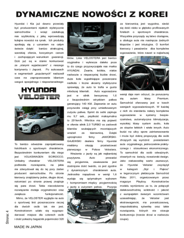 DYNAMICZNE NOWOŚCI Z KOREI Strona: 4 Hyundai i Kia już dawno przestały być producentami nijakich stylistycznie samochodów i wciąż zaskakują nas szybkością z jaką wprowadzają kolejne nowości na rynek. Ich produkty spotkają się z uznaniem na całym świecie dzięki bardzo atrakcyjnej, szerokiej ofercie, korzystnym cenom i zachęcającym warunkom gwarancji. Dziś już są w stanie konkurować ze „starymi wyjadaczami” z naszego kontynentu i Japonii. Po sukcesach w segmentach „popularnych” nadszedł czas na zaproponowanie klientom czegoś specjalnego i niepowtarzalnego: To bardzo odważnie zaprojektowany hatchback o sportowym charakterze. Bezpośrednim konkurentem dla niego jest VOLKSWAGEN SCIROCCO. Unikalny charakter VELOSTERA podkreśla rozwiązanie, na jakie nie zdecydował się do tej pory żaden producent samochodów. Po stronie kierowcy znajdziemy jedne, długie drzwi, natomiast po stronie prawej znajduje się para drzwi. Takie niecodzienne rozwiązanie dodaje oryginalności oraz zwiększa funkcjonalność. Mimo, że VELOSTER wygląda na auto o sportowej linii przeznaczone raczej dla dwóch osób tak nie jest. Konstruktorom udało się wygospodarować miejsce dla czterech osób i dość pokaźny bagażnik pojemności 320 MADE IN JAPAN za kierownicą jest wygodna, siedzi się dość nisko w głęboko profilowanych fotelach o sportowym charakterze. Wszystkie przyrządy są łatwo dostępne, a obsługa auta nie nastręcza żadnych kłopotów i jest intuicyjna. O komfort kierowcy i pasażerów dba kompletne wyposażenie, które nawet w najtańszej litrów. Linia VELOSTERA jest bardzo oryginalna i wykracza daleko poza to do czego przyzwyczajała nas marka HYUNDAI. Zwarte, krótkie, niskie nadwozie o nieparzystej liczbie drzwi, duże koła wypełniające poszerzane nadkola i liczne akcenty stylistyczne sprawiają, że auto te trafia w gusta młodszej klienteli. Auto wyposażone jest w silnik benzynowy 1 ,6 z bezpośrednim wtryskiem paliwa generujący 1 40 KM. Zapewnia on autu przyzwoite osiągi przy umiarkowanym zużyciu paliwa. Sprint do setki zajmuje mu 9,7 sek., prędkość maksymalna to 201 km/h. Wkrótce ma się pojawić w ofercie silnik 2,0 TURBO co zadowoli klientów szukających mocniejszych wrażeń za kierownicą. Dzięki uprzejmości firmy JAWORSKIGAJEWSKI dealera firmy Hyundai mieliśmy okazję przetestować pierwszego w Polsce Velostera. Wrażenia z jazdy są jak najbardziej pozytywne. Auto prowadzi się przyjemnie, zawieszenie jest dostrojone dość twardo, co jest zgodne z dynamicznym charakterem auta. Jednostka napędowa w wersji 1 ,6 wydaje się optymalnym wyborem i kompromisem między przyjemnością z jazdy a zużyciem paliwa. Pozycja wersji daje nam odczuć, że poruszamy się autem klasy Premium. Samochód oferowany jest w trzech wersjach wyposażeniowych. W każdej z nich do standardu należy kompletne wyposażenie w systemy bezpieczeństwa, automatyczna klimatyzacja, wysokiej klasy system audio, koła ze stopów lekkich i wiele innych. Auto budzi na ulicy spore zainteresowanie i może być dobrą propozycją dla osób chcących się wyróżnić posiadaniem auta oryginalnego, jednocześnie praktycznego i stosunkowo ekonomicznego. To samochód dla osób odważnych, otwartych na świeży, nowatorski design. Jako ciekawostkę warto zaznaczyć, że Hyundai Veloster zwyciężył w kategorii „Styl i Piękno” w tegorocznym plebiscycie Samochód Roku 2011 , organizowanym przez magazyn Playboy. Konstruktorów modelu wyróżniono za to, że połączyli dalekowschodnią solidność i jakość z europejskim świeżym wzornictwem uzasadniając, że Veloster jest ekstrawagancki, ma ponadczasową, niepodrabialną sylwetkę oraz takie rozwiązania, których nie stosuje konkurencja (trzecie drzwi w nadwoziu coupe). niż za porównywalne auto u konkurencji. Cennik zaczyna się od 11 5 tysięcy. Dla klientów przygotowano dwa rewelacyjne silniki, dwie skrzynie: manualną i automatyczną oraz trzy wersje wyposażenia. Niedługo w ofercie pojawi się silnik z bezpośrednim wtryskiem o mocy 330KM. Oczywiście jak na auto z wyższej półki przystało, podobnie jak w opisywanym VELOSTERZE, wyposażenie jest bardzo bogate i powinno zadowolić większość klientów. Podsumowując: Hyundai wyprodukował bardzo atrakcyjne auto o rewelacyjnych osiągach, odpowiednim wyglądzie i kuszącej cenie. Pewnym jest, że na polskim rynku nie będzie hitem sprzedaży, ale stanowi kuszącą alternatywę dla aut niemieckich i japońskich oraz pokazuje, że Hyundai jest poważnym graczem na rynku motoryzacyjnym i ten trend będzie się utrzymywał w przyszłości. Auta takie jak VELOSTER i GENESIS Coupe są wizytówką firmy i pokazują jak daleko zaszła koreańska marka przez ostatnich kilka lat. Z niecierpliwością czekamy na kolejne nowości. Autor: M.J. 7/2011 (3) lipiec 2011 Strona: 5 To pierwsze, pełnokrwiste Coupe marki Hyundai. Patrząc na niego nie mamy wątpliwości do czego to auto zostało stworzone i jaki jest jego charakter. Auto jest wyposażone w mocny silniki 2,0 TCI 21 0KM lub 3,8 V6 303KM które jak na sportowe auto przystało przenosi napęd na koła tylne. Inżynierowie Hyundaia konstruując układ jezdny wzorowali się na znanych konkurentach INFINITI G37 i BMW M3, co było słusznym posunięciem. Prawie idealny rozkład masy, dużo mocy i wielowahaczowe zawieszenie każdego z kół to cechy decydujące o doskonałym prowadzeniu aut sportowych. Tak jest również w przypadku GENESISA. Wyposażony w mechanizm różnicowy o ograniczonym poślizgu rozpędza się do 1 00km/h odpowiednio w 8,0 lub 6,4 sekundy. Konstruktorom udało się zaprojektować auto, które wygląda znakomicie, świetnie jeździ i udowadnia, że Hyundai jest gotowy do konkurowania na rynku aut sportowych. Za jego wyborem przemawia również cena, która jest o wiele niższa niż u konkurencji. Za 1 55 tysięcy złotych kupimy wersję topową GENESISA. To wiele mniej