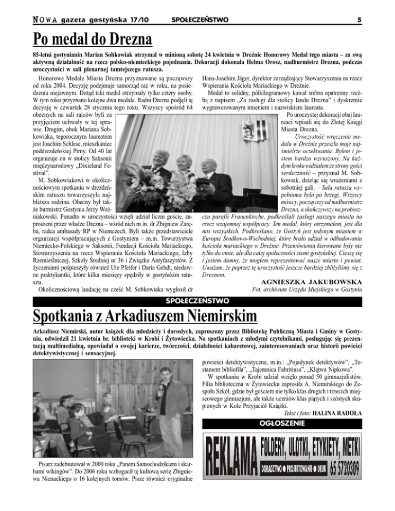 N O W A gazeta gostyñska 17/10 SPO£ECZEÑSTWO 5 Po medal do Drezna 85-letni gostynianin Marian Sobkowiak otrzyma³ w minion¹ sobotê 24 kwietnia w Drenie Honorowy Medal tego miasta za sw¹ aktywn¹ dzia³alnoæ na rzecz polsko-niemieckiego pojednania. Dekoracji dokona³a Helma Orosz, nadburmistrz Drezna, podczas uroczystoci w sali plenarnej tamtejszego ratusza. Honorowe Medale Miasta Drezna przyznawane s¹ pocz¹wszy Hans-Joachim Jäger, dyrektor zarz¹dzaj¹cy Stowarzyszenia na rzecz od roku 2004. Decyzjê podejmuje samorz¹d raz w roku, na posie- Wspierania Kocio³a Mariackiego w Drenie. dzeniu niejawnym. Dot¹d taki medal otrzyma³y tylko cztery osoby. Medal to solidny, pó³kilogramowy kawa³ srebra opatrzony rzeW tym roku przyznano kolejne dwa medale. Radni Drezna podjêli tê b¹ z napisem Za zas³ugi dla stolicy landu Drezna i dyskretnie decyzjê w czwartek 28 stycznia tego roku. Wszyscy sporód 64 wygrawerowanym imieniem i nazwiskiem laureata. obecnych na sali rajców byli za Po uroczystej dekoracji obaj lauprzyjêciem uchwa³y w tej sprareaci wpisali siê do Z³otej Ksiêgi wie. Drugim, obok Mariana SobMiasta Drezna. kowiaka, tegorocznym laureatem Uroczystoæ wrêczenia mejest Joachim Schlese, mieszkaniec dalu w Drenie przesz³a moje najpoddrezdeñskiej Pirny. Od 40 lat mielsze oczekiwania. By³em i jeorganizuje on w stolicy Saksonii stem bardzo wzruszony. Na ka¿miêdzynarodowy Dixieland Fedym kroku widzia³em ze strony goci stival. serdecznoæ przyzna³ M. SobM. Sobkowiakowi w okoliczkowiak, dziel¹c siê wra¿eniami z nociowym spotkaniu w drezdeñsobotniej gali. Sala ratusza wyskim ratuszu towarzyszy³a najpe³niona by³a po brzegi. Wszyscy bli¿sza rodzina. Obecny by³ takmówcy, pocz¹wszy od nadburmistrz ¿e burmistrz Gostynia Jerzy WoDrezna, a skoñczywszy na proboszniakowski. Ponadto w uroczystoci wziêli udzia³ liczni gocie, za- czu parafii Frauenkirche, podkrelali zas³ugi naszego miasta na proszeni przez w³adze Drezna wród nich m.in. dr Zbigniew Zarê- rzecz wzajemnej wspó³pracy. Ten medal, który otrzyma³em, jest dla ba, radca ambasady RP w Niemczech. Byli tak¿e przedstawiciele nas wszystkich. Podkrelano, ¿e Gostyñ jest jedynym miastem w organizacji wspó³pracuj¹cych z Gostyniem m.in. Towarzystwa Europie rodkowo-Wschodniej, które bra³o udzia³ w odbudowaniu Niemiecko-Polskiego w Saksonii, Fundacji Kocio³a Mariackiego, kocio³a mariackiego w Drenie. Przemówienia kierowane by³y nie Stowarzyszenia na rzecz Wspierania Kocio³a Mariackiego, Izby tylko do mnie, ale dla ca³ej spo³ecznoci ziemi gostyñskiej. Cieszê siê Rzemielniczej, Szko³y redniej nr 36 i Zwi¹zku Antyfaszystów. Z i jestem dumny, ¿e mog³em reprezentowaæ nasze miasto i powiat. ¿yczeniami popieszy³y równie¿ Ute Pfeifer i Daria Gehdt, niedaw- Uwa¿am, ¿e poprzez tê uroczystoæ jeszcze bardziej zbli¿ylimy siê z ne praktykantki, które kilka miesiêcy spêdzi³y w gostyñskim ratu- Dreznem. AGNIESZKA JAKUBOWSKA szu. Fot. archiwum Urzêdu Miejskiego w Gostyniu Okolicznociow¹ laudacjê na czeæ M. Sobkowiaka wyg³osi³ dr SPO£ECZEÑSTWO Spotkania z Arkadiuszem Niemirskim Arkadiusz Niemirski, autor ksi¹¿ek dla m³odzie¿y i doros³ych, zaproszony przez Bibliotekê Publiczn¹ Miasta i Gminy w Gostyniu, odwiedzi³ 21 kwietnia br. biblioteki w Krobi i ¯ytowiecku. Na spotkaniach z m³odymi czytelnikami, pos³uguj¹c siê prezentacj¹ multimedialn¹, opowiada³ o swojej karierze, twórczoci, dzia³alnoci kabaretowej, zainteresowaniach oraz historii powieci detektywistycznej i sensacyjnej. powieci detektywistyczne, m.in.: Pojedynek detektywów, Testament bibliofila, Tajemnica Fabritiusa, Kl¹twa Nipkowa. W spotkaniu w Krobi udzia³ wziê³o ponad 50 gimnazjalistów. Filia biblioteczna w ¯ytowiecku zaprosi³a A. Niemirskiego do Zespo³u Szkó³, gdzie by³ gociem nie tylko klas drugich i trzecich miejscowego gimnazjum, ale tak¿e uczniów klas pi¹tych i szóstych skupionych w Kole Przyjació³ Ksi¹¿ki. Tekst i foto: HALINA RADO£A OG£OSZENIE Pisarz zadebiutowa³ w 2000 roku Panem Samochodzikiem i skarbami wikingów. Do 2006 roku wzbogaci³ tê kultow¹ seriê Zbigniewa Nienackiego o 16 kolejnych tomów. Pisze równie¿ oryginalne