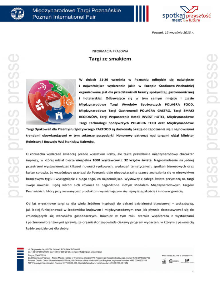 Poznań, 12 września 2013 r. INFORMACJA PRASOWA Targi ze smakiem W dniach 21-26 września w Poznaniu odbędzie się największe i najważniejsze wydarzenie jakie w Europie Środkowo-Wschodniej organizowane jest dla przedstawicieli branży spożywczej, gastronomicznej i hotelarskiej. Odbywające się w tym samym miejscu i czasie Międzynarodowe Targi Wyrobów Spożywczych POLAGRA FOOD, Międzynarodowe Targi Gastronomii POLAGRA GASTRO, Targi SMAKI REGIONÓW, Targi Wyposażenia Hoteli INVEST HOTEL, Międzynarodowe Targi Technologii Spożywczych POLAGRA TECH oraz Międzynarodowe Targi Opakowań dla Przemysłu Spożywczego PAKFOOD są doskonałą okazją do zapoznania się z najnowszymi trendami obowiązującymi w tym sektorze gospodarki. Honorowy patronat nad targami objął Minister Rolnictwa i Rozwoju Wsi Stanisław Kalemba. O rozmachu wydarzeń świadczą przede wszystkim liczby, ale także prawdziwie międzynarodowy charakter imprezy, w której udział bierze niespełna 1000 wystawców z 32 krajów świata. Nagromadzenie na jednej przestrzeni wystawienniczej kilkuset nowości rynkowych, wydarzeń tematycznych, spotkań biznesowych oraz kultur sprawia, że wrześniowy przyjazd do Poznania daje niepowtarzalną szansę znalezienia się w niezwykłym branżowym tyglu i wyciągnięcie z niego tego, co najcenniejsze. Wystawcy z całego świata przywiozą na targi swoje nowości. Będą wśród nich również te nagrodzone Złotym Medalem Międzynarodowych Targów Poznańskich, który przyznawany jest produktom wyróżniającym się najwyższą jakością i innowacyjnością. Od lat wrześniowe targi są dla wielu źródłem inspiracji do dalszej działalności biznesowej – wskazówką, jak lepiej funkcjonować w środowisku krajowym i międzynarodowym oraz jak płynnie dostosowywać się do zmieniających się warunków gospodarczych. Również w tym roku szeroka współpraca z wystawcami i partnerami branżowymi sprawia, że organizator zapowiada ciekawy program wydarzeń, w którym z pewnością każdy znajdzie coś dla siebie. 1 Głodni profesjonalnej wiedzy przyjadą do Poznania, aby zapoznać się z kompleksową ofertą wystawienniczą wydarzeń: • Targi SMAKI REGIONÓW • Międzynarodowe Targi Wyrobów Spożywczych POLAGRA FOOD • Międzynarodowe Targi Technologii Spożywczych POLAGRA TECH • Międzynarodowe Targi Gastronomii POLAGRA GASTRO • Targi Wyposażenia Hoteli INVEST HOTEL • Targi Opakowań dla Przemysłu Spożywczego PAKFOOD Smaczny start Pyszny blok targowy w Poznaniu rozpocznie wyjątkowo smakowity epilog - startujące już 21 września Targi SMAKI REGIONÓW, które są kwintesencją koncepcji Slow Food w czystej postaci. Odwiedzająca je publiczność spotka się z feerią smaków i zapachów rodem z babcinej kuchni. Tu także zapoznamy się ze smakiem chleba na zakwasie, domowego smalcu, słodyczy nie mających nic wspólnego z nienaturalnie kolorowymi jaskrawymi produktami wabiącymi przy kasach hipermarketów. Targi SMAKI REGIONÓW organizowane corocznie wspólnie ze Związkiem Województw Rzeczypospolitej Polskiej są miejscem, gdzie kupcy, restauratorzy lub osoby odpowiedzialne za zaopatrzenie w placówkach handlowych, znajdują dla swoich sklepów i restauracji prawdziwe kulinarne rarytasy. To także wydarzenie, którego nadrzędnym celem jest promocja żywności regionalnej, certyfikowanej, coraz częściej poszukiwanej i cenionej przez klienta ostatecznego. W międzynarodowym gronie Międzynarodowe Targi Wyrobów Spożywczych POLAGRA FOOD to idealne miejsce i czas, aby stworzyć fundament pod przyszłe długoterminowe kontakty między profesjonalnymi zwiedzającymi targi – dystrybutorami, handlowcami - a ich wystawcami. POLAGRA FOOD proponuje przede wszystkim pełny przegląd międzynarodowej oferty rynkowej z sektora mleczarskiego, mięsnego, przetwórstwa owocowo-warzywnego. Nie zabraknie także znaczącej liczby wystawców z branży używek – kawy i herbaty, napoi, słodyczy od cukru począwszy, a na delikatesowych wyrobach skończywszy. Goście targów mogą się także spodziewać szerokiej oferty oliwy, oliwek, przypraw liofilizowanych, żywności ekologicznej i alkoholi. Organizatorzy zapewniają szeroką gamę innowacyjnych rozwiązań w formie nowości prezentowanych po raz pierwszy podczas targów. Sektor mleczarski – wyzwania i szanse, konsekwencje zmian w regulacjach prawnych, dynamicznej ewolucji trendów i gustów klienta ostatecznego – to tylko niektóre z tematów dyskusji na polu najważniejszych rozmów branży spożywczej, które będą miały miejsce podczas tegorocznej edycji wydarzenia. Międzynarodowe Targi Wyrobów Spożywczych POLAGRA FOOD przyciągają profesjonalistów zarówno z rodzimego rynku jak i z całego świata. Także i tym razem nie zabraknie licznego grona przedstawicieli sieci handlowych, kupców, kadry zarządczej najwyższego szczebla, hurtowni spożywczych typu Cash&Carry, a także reprezentantów mniejszych podmiotów, których działania często wpływają na ostateczny sukces produktu. 2 Salon Technologii Mięsnych W ramach targów POLAGRA TECH zaprezentowane będą najnowsze maszyny i urządzenia dla branży mięsnej i wędliniarskiej, dodatki, przyprawy, osłonki i komponenty. Wiele z tych zaawansowanych i niezwykle precyzyjnych urządzeń będziemy mogli podziwiać w ruchu, a także zobaczyć całe linie technologiczne dające pełny obraz procesów zachodzących podczas produkcji. To niepowtarzalna okazja, by szczegółowo poznać wszystkie zalety tych urządzeń. Wśród najbardziej innowacyjnych rozwiązań znajdą się urządzenia do kontroli jakości mięsa, maszyny skanujące pod kątem optymalizacji kosztów produkcji czy też rozwiązania ułatwiające automatyczną zmianę pozycji mięsa na krajalnicy. Dodatkowo cztery targowe dni będą doskonałą okazją, aby zobaczyć ‘najlepszych z najlepszych’ na żywo – produkty nagrodzone prestiżową nagrodą Złotego Medalu MTP. Ciekawie zapow