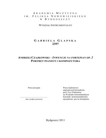AKADEMIA MUZYCZNA I M . F E L I K S A N O W O W I E J S K I E G O W B Y D G O S Z C Z Y WYDZIAŁ INSTRUMENTALNY GABRIELA GLAPSKA 2397 ANDRZEJ CZAJKOWSKI – INWENCJE NA FORTEPIAN OP. 2 PORTRET PIANISTY I KOMPOZYTORA Praca przyjęta ................................................... data i podpis promotora Praca dyplomowa napisana pod kierunkiem prof. Ewy Pobłockiej na Wydziale Instrumentalnym kierunek: Instrumentalistyka specjalność: gra na fortepianie Bydgoszcz 2011 SPIS TREŚCI Wstęp................................................................................................................................ 4 Rozdział I ......................................................................................................................... 6 Ogólna definicja inwencji. Powstanie i rozwój gatunku inwencji ze szczególnym uwzględnieniem Inwencji dwu- i trzygłosowych Jana Sebastiana Bacha. Rozdział II ..................................................................................................................... 10 Andrzej Czajkowski 1. Pierwsze lata, getto ............................................................................................. 10 2. Lata nauki, sukcesy ............................................................................................. 15 3. Kariera ................................................................................................................ 18 4. Praca twórcza, zainteresowania, cechy osobowości ........................................... 22 Rozdział III .................................................................................................................... 28 Charakterystyka i analiza Inwencji na fortepian op. 2 Andrzeja Czajkowskiego 1. Charakterystyka ........................................................................................................ 28 2. Analiza ...................................................................................................................... 31 2.1. Inwencja nr 1 ..................................................................................................... 31 2.2. Inwencja nr 2 ..................................................................................................... 33 2.3. Inwencja nr 3 ..................................................................................................... 35 2 2.4. Inwencja nr 4 ..................................................................................................... 38 2.5. Inwencja nr 5a ................................................................................................... 42 2.6. Inwencja nr 5b ................................................................................................... 42 2.7. Inwencja nr 6 ..................................................................................................... 44 2.8. Inwencja nr 7 ..................................................................................................... 48 2.9. Inwencja nr 8 ..................................................................................................... 52 2.10. Inwencja nr 9 ..................................................................................................... 55 2.11. Inwencja nr 10 ................................................................................................... 59 Zakończenie ................................................................................................................... 64 Bibliografia .................................................................................................................... 66 3 WSTĘP Andrzej Czajkowski to postać niezwykle barwna i fascynująca. Aż trudno uwierzyć w to, że tak niewiele wiadomo o jego osobie i twórczości. A z całą pewnością zasługuje on na to, aby zaistnieć na dobre w programach wykonawców, nie tylko muzyki współczesnej, ale wszystkich ceniących się muzyków. Jego życie, a co za tym idzie, także i spuścizna noszą znamiona tragizmu. Twórczość Czajkowskiego, pomimo że składająca się jedynie z kilku utworów, to prawdziwy diament w literaturze muzyki XX wieku. Moje zainteresowanie osobą i twórczością Andrzeja Czajkowskiego zawdzięczam popularyzatorowi jego muzyki - Maciejowi Grzybowskiemu - dzięki któremu mogłam zapoznać się z niezmiernie ciekawą książką pt.: „… mój diabeł stróż”. Jest to zbiór listów kompozytora oraz jego wieloletniej przyjaciółki – Anity Haliny Janowskiej. Po przeczytaniu tej fascynująco psychologicznej lektury zrodziła się u mnie potrzeba poszerzenia wiedzy na temat wciąż mało znanej osoby Czajkowskiego. Kolejno zbierane artykuły, książki, nagrania czy recenzje ukazywały coraz pełniejszy, a zarazem wypełniony wieloma niewiadomymi, obraz tej postaci. Równocześnie, wzbudzały coraz większą ciekawość oraz fascynację, w konsekwencji czego zrodził się pomysł napisania pracy dyplomowej na temat Andrzeja Czajkowskiego. Opisując sylwetkę polskiego pianisty i kompozytora, postanowiłam ukazać go poprzez pryzmat jego kompozycji – przedmiotem mojej analizy są Inwencje na fortepian op. 2. Wybór ten nie jest przypadkowy, ponieważ w trakcie pracy nad owym utworem mogłam zapoznać się z wieloma cechami twórczej osobowości Czajkowskiego. Jest to niezwykły cykl 10-ciu miniatur na fortepian, z których każdy jest muzycznym portretem przedstawiającym najbliższych przyjaciół kompozytora. Celem mojej pracy jest rozpowszechnienie informacji na temat Andrzeja Czajkowskiego, a także zachęcenie do głębszego pochylenia się zarówno nad osobą kompozytora, jak i jego twórczością. Sądzę, że podawane przeze mnie fakty z życia oraz analiza Inwencji op. 2 przyczynią się do lepszego poznania i zrozumienia sylwetki twórcy. 4 W Rozdziale I. zajmuję się charakterystyką pojęcia „inwencja” oraz powstaniem tego gatunku i jej rozwojem. Opisuję także pokrótce znaczenie Inwencji d