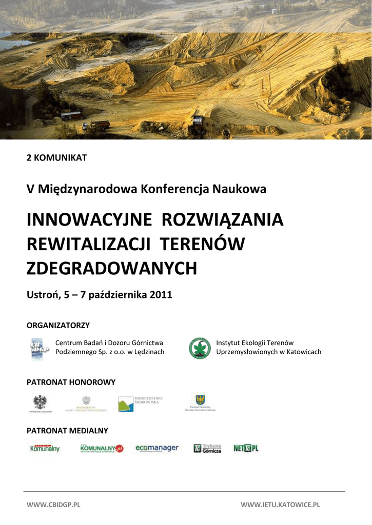 2 KOMUNIKAT V Międzynarodowa Konferencja Naukowa INNOWACYJNE ROZWIĄZANIA REWITALIZACJI TERENÓW ZDEGRADOWANYCH Ustroo, 5 – 7 października 2011 ORGANIZATORZY Centrum Badao i Dozoru Górnictwa Podziemnego Sp. z o.o. w Lędzinach Instytut Ekologii Terenów Uprzemysłowionych w Katowicach PATRONAT HONOROWY PATRONAT MEDIALNY WWW.CBIDGP.PL WWW.IETU.KATOWICE.PL TEMATYKA KONFERENCJI Odnowa biologiczna terenów przemysłowych Techniczne i biologiczne aspekty remediacji terenów zdegradowanych Metody badawcze, stosowane w procesie remediacji na etapach: kwalifikowania terenów do remediacji, oceny efektywności remediacji oraz monitoringu „po-remediacyjnego" Remediacja środowiska gruntowo-wodnego na terenach zanieczyszczonych ze szczególnym uwzględnieniem strategii opartych na samooczyszczaniu Rewitalizacja rzek naturalnych i uregulowanych oraz dolin rzecznych Rekomendowane i sprawdzone metody remediacji Najlepsze praktyczne przykłady remediacji i rewitalizacji terenów poprzemysłowych, pogórniczych, składowisk odpadów poflotacyjnych, wód powierzchniowych (zbiorniki wodne) Innowacyjne podejście do oczyszczania terenów zdegradowanych: green remediation Implikacje zdrowotne powtórnego zagospodarowania terenów zdegradowanych Zaangażowanie społeczne a proces remediacji i rewitalizacji Rewitalizacja terenów zdegradowanych w świetle polityki miejskiej Narzędzia rewitalizacji terenów miejskich i przemysłowych 45 PREZENTACJI WYNIKÓW BADAO I WDROŻEO Na konferencji ponad 40 specjalistów z dziedziny rewitalizacji przedstawi efekty prowadzonych przez siebie badao i praktycznych działao na rzecz przekształcania terenów zdegradowanych. Przedstawione wyniki badao mogą przyczynid się do powstawania kolejnych projektów i zacieśniania współpracy między naukowcami, właścicielami terenów zdegradowanych oraz inwestorami. SESJA SPECJALNA Na sesji Narzędzia do identyfikacji głównych źródeł zanieczyszczeo wód podziemnych zostaną omówione m. in. następujące tematy: pasywne opróbowanie do oceny zanieczyszczenia środowiska wodnego, metoda zintegrowanych pompowao badawczych (Integral Pumping Tests), fingerprinting - szczegółowa interpretacja wyników badao, backtracking – modelowanie transportu zanieczyszczeo w wodach podziemnych, oraz analiza ryzyka środowiskowego i zdrowotnego. TERMIN I MIEJSCE KONFERENCJI 5 - 7 października 2011 Ustroo, Hotel „Jaskółka”, ul. Zdrojowa 10 www.jaskolka.com.pl Ustroo leży w samym sercu Beskidu Śląskiego na koocu górskiego odcinka doliny Wisły, pomiędzy Równicą a Czantorią. Jest znanym ośrodkiem uzdrowiskowym oraz wypoczynkowym. Urzekający krajobraz, wielokilometrowe szlaki turystyczne i leczniczy klimat przyciągają co roku kuracjuszy, wczasowiczów, amatorów sportów górskich oraz wędkarzy. JĘZYK KONFERENCJI Obrady konferencji odbędą się w językach polskim i angielskim. WWW.CBIDGP.PL WWW.IETU.KATOWICE.PL UCZESTNICY KONFERENCJI Zaproszenie do udziału w Konferencji kierujemy do uczelni wyższych i instytutów badawczych, paostwowych, samorządowych i prywatnych organizacji biorących udział w procesie rewitalizacji terenów zdegradowanych, a szczególnie terenów poprzemysłowych. Do uczestnictwa zapraszamy przedstawicieli władz regionalnych i lokalnych, właścicieli terenów, inwestorów, firm zajmujących się oczyszczaniem oraz rekultywacją gleb i wód, a także instytucji finansujących i ubezpieczeniowych. REJESTRACJA Zapraszamy do wzięcia udziału w konferencji i zgłaszania swego uczestnictwa. W celu rejestracji proszę wypełnid załączony formularz zgłoszenia i przesład do 27 września 2011. e-mail: [email protected], faks: 32/32-42-263 lub 32/ 216-66-66 OPŁATA KONFERENCYJNA Obejmuje uczestnictwo w konferencji, materiały konferencyjne, zakwaterowanie, wyżywienie oraz imprezy towarzyszące. pobyt (zakwaterowanie, wyżywienie, materiały konferencyjne) – 1.100,00 zł + (23 % VAT) = 1.353,00 zł pobyt w pokoju 1 osobowym – 1.300,00 zł + (23 % VAT) = 1.599,00 zł pobyt autora wygłaszającego referat (nie promocyjny) – 800,00 zł + (23 % VAT) = 984,00 zł pobyt autora wygłaszającego referat (nie promocyjny) pokój 1 osobowy – 1.000,00 zł + (23 % VAT) = 1.230,00 zł. Wpłata do 27 września 2011 na konto Bank Spółdzielczy Tychy. Nr rachunku: 75 8435 0004 0000 0002 3908 0001. WARUNKI REZYGNACJI Rezygnacja musi nastąpić w formie pisemnej (faksem) najpóźniej na 3 dni przed rozpoczęciem konferencji. Rezygnacja w terminie późniejszym wiąże się z koniecznością pokrycia kosztów organizacyjnych w wysokości 100%. Nieobecność na konferencji nie zwalnia z dokonania opłaty. MATERIAŁY KONFERENCYJNE I PUBLIKACJA W materiałach konferencyjnych opublikowane zostaną streszczenia, pełne teksty referatów zostaną zamieszczone na płycie CD. Monografia pokonferencyjna pt. Innowacyjne rozwiązania rewitalizacji terenów zdegradowanych 2011 zawierad będzie artykuły pozytywnie zaopiniowane przez Radę Naukowo-Programową. PROMOCJA NA KONFERENCJI reklama firmy w materiałach konferencyjnych– 1.000,00 zł + (23 % VAT) = 1.230,00 zł, referat promocyjny – reklama firmy (20 minut), – 1.200,00 zł + (23 % VAT) = 1.476,00 zł, stoisko reklamowe – 2m2 – 800,00 zł + (23 % VAT) = 984,00 zł (dodatkowa powierzchnia do negocjacji), inne formy udziału do uzgodnienia z organizatorem. Wpłata do 27 września 2011 na konto Bank Spółdzielczy Tychy. Nr rachunku: 75 8435 0004 0000 0002 3908 0001. DODATKOWE INFORMACJE mgr Justyna SALWIERAK – CBiDGP tel. 32 324 22 62, kom. 501 331 814 e-mail: [email protected] WWW.CBIDGP.PL WWW.IETU.KATOWICE.PL RADA NAUKOWO – PROGRAMOWA prof. zw. dr hab. inż. Stanisław BARAN – Instytut Gleboznawstwa i Kształtowania Środowiska, Uniwersytet Przyrodniczy, Lublin Bernard BŁASZCZYK – Ministerstwo Środowiska, Warszawa dr Jan DULEWSKI – Wyższy Urząd Górniczy, Katowice prof. Jairo FALLA – Universite Paul Verlaine, Metz, Francja dr hab. i