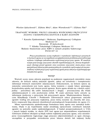 PRZEGL EPIDEMIOL 2001;55:313-22 Wiesław Jędrychowski*, Elżbieta Mróz*, Adam Wiernikowski** i Elżbieta Flak* TRAFNOŚĆ WYBORU PRZEZ LEKARZA WYJŚCIOWEJ PRZYCZYNY ZGONU I KODOWANIA DANYCH Z KART ZGONÓW * Katedra Epidemiologii i Medycyny Zapobiegawczej Collegium Medicum UJ Kierownik: W Jędrychowski ** Klinika Toksykologii Collegium Medicum UJ Badanie finansowane przez KBN w ramach projektu badawczego P05D 037 14 Praca przedstawia ocenę trafności i rzetelności informacji zawartych w kartach zgonu ze szczególnym uwzględnieniem problemu prawidłowego wyboru i trafnego zakodowania wyjściowej przyczyny zgonu. W analizie wzięto pod uwagę znaczenie chorób współistniejących, okresu hospitali zacji chorego przed zgonem oraz oceniono znaczenie stażu pracy oraz specjalizacji lekarza jako potencjalnych czynników wpływających na pra widłowy wybór przyczyny wyjściowej zgonu przez lekarza wypełniającego świadectwo zgonu. WSTĘP Wartość oceny stanu zdrowia populacji na podstawie negatywnych mierników stanu zdrowia, do których należą statystyki zgonów, zależy od rzetelności i kompletności informacji wtórnych materiałów statystycznych. Dokumentem, na którym opiera się statystyka umieralności jest karta zgonu, którą wystawia z zasady lekarz sprawujący bezpośrednią opiekę nad chorym przed zgonem. Karta zgonu składa się z dwóch części: jednej - potrzebnej dla celów statystycznych i drugiej - przeznaczonej dla władz administracyjnych w celu pochowania zwłok. W części pierwszej karty zawarte są informacje medyczne o przyczynie lub przyczynach zgonu. Międzynarodowa Statysty czna Klasyfikacja Chorób i Problemów Zdrowotnych zaleca grupowanie statystki zgonów według ich przyczyny wyjściowej, przez którą rozumie się chorobę lub uraz, które rozpoczęły bieg zdarzeń chorobowych prowadzących bezpośrednio do zgonu (1). Mimo wprowadzenia ujednoliconego formularza karty zgonu oraz instrukcji kodo wania, błędy w jej wypełnianiu nadal utrudniają opracowanie rzetelnych statystyk zgonów na potrzeby analiz epidemiologicznych. Z badań przeprowadzonych w USA i innych krajach wynika, że około 20% kart zgonu jest nieprawidłowo wypełnianych. Głównym źródłem obciążeń są błędy wyboru wyjściowej przyczyny zgonu, oraz nieumie jętne wyszczególnienie logicznego ciągu przyczyn odpowiedzialnych za zgon chorego, szczególnie w przypadku stwierdzenia przez lekarza dwóch lub większej liczby 314 W Jędrychowski, E Mróz, A Wiernikowski, E Flak Nr 3 współwystępujących chorób. Dotychczasowe badania kontroli jakości danych zawartych w kartach zgonów dotyczyły raczej nosologicznych błędów klasyfikacyjnych i bardzo rzadko odnosiły się do roli lekarza w tym zakresie (2-10). Celem badania była ocena trafności i rzetelności informacji zawartych w kartach zgonu ze szczególnym uwzględnieniem problemu prawidłowego wyboru przez lekarza wyjściowej przyczyny i trafnego jej zakodowania według X rewizji Międzynarodowej Statystycznej Klasyfikacji Chorób i Problemów Zdrowotnych (11). W analizie wzięto pod uwagę również znaczenie chorób współistniejących, okresu hospitalizacji chorego przed zgonem oraz oceniono znaczenie stażu pracy oraz specjalizacji lekarza jako potencjalnych czynników wpływających na prawidłowy wybór przyczyny wyjściowej zgonu przez lekarza wypełniającego świadectwo zgonu. MATERIAŁ I METODY Badanie polegało na analizie wylosowanych 5% ogółu kart zgonu wystawionych w roku 1999 na terenie Krakowa. Karty zgonu zostały udostępnione przez Wojewódzki Specjalistyczny Zespół Opieki Zdrowotnej w Ośrodku Statystyki Medycznej Analiz i Informatyki w Krakowie. Analizą objęto ogółem 479 kart zgonu wystawionych przez 12 placówek służby zdrowia, w tym przez 240 lekarzy. Od każdego lekarza wypeł niającego karty zgonu zebrano dane na temat wieku, stażu pracy, specjalizacji oraz miejsca pracy lekarza. Nie uzyskano informacji od 59 lekarzy (42 lekarzy odmówiło współpracy, 12 zmieniło miejsce pracy, a 5 było na długich zwolnieniach lekarskich). Dane z kart zgonu zostały sprawdzone i zakodowane według przygotowanej in strukcji kodowania, i następnie zostały wprowadzone do komputera. Przy wprowa dzaniu danych do komputera, informacje ponownie sprawdzono pod względem ich wewnętrznej zgodności. Następnie dla każdej karty zgonu skompletowano możliwie pełną dokumentację medyczną osób zmarłych w szpitalach i klinikach Szpitala Uniwersyteckiego w Krakowie, gdzie chorzy byli leczeni bezpośrednio przed zgonem. Następnie dokumentacja lekarska osób zmarłych - pozbawiona danych identyfikacyj nych (imię i nazwisko oraz miejsce zamieszkania zmarłego) oraz bez danych identyfi kacyjnych lekarzy wystawiających karty zgonu - została przedstawiona do niezależnej oceny trzem lekarzom o różnym doświadczeniu klinicznym i różnym stażu pracy. Za daniem lekarzy weryfikujących było wypełnienie formularza karty zgonu na podstawie dostarczonych kopii kserograficznych dokumentów (historie chorób, wyniki badań pomocniczych, wynik sekcji zwłok). W końcowym etapie analizy porównano rozpozna nia lekarzy weryfikujących z rozpoznaniami w kartach zgonów. Opinie wydane przez jednego z lekarzy weryfikujących (A.W.) o dużym doświad czeniu klinicznym (ponad 30 lat pracy w Szpitalu Uniwersyteckim w Krakowie), ze stopniem doktora medycyny i II stopniem specjalizacji z chorób wewnętrznych i tok sykologii, uznane zostały za orzeczenia wzorcowe w stosunku do których wyliczono wskaźniki trafności rozpoznań i współczynniki zgodności Kappa (12). Metody oblicze nia wskaźników umieszczono w tabeli I. Analiza statystyczna wyników obejmowała jednowymiarową i wielowymiarową sta tystykę materiału. Test chi2 został użyty dla sprawdzenia istotności zgodnych rozpoznań wyjściowej przyczyny zgonu w zależności od wieku i płci zmarłych, chorób współist niejących, stażu pracy ora