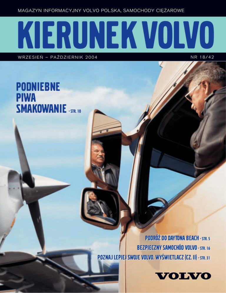 MAGAZYN INFORMACYJNY VOLVO POLSKA, SAMOCHODY CI¢˚AROWE KIERUNEKVOLVO WRZESIE¡ – PAèDZIERNIK 2004 PODNIEBNE PIWA SMAKOWANIE NR 18/42 - STR. 10 PODRÓ˚ DO DAYTONA BEACH - STR. 5 BEZPIECZNY SAMOCHÓD VOLVO - STR. 16 POZNAJ LEPIEJ SWOJE VOLVO. WYÂWIETLACZ (CZ. II) - STR. 31 Szanowni Paƒstwo Od przesz∏o 10 lat Volvo Polska, Samochody Ci´˝arowe zajmuje czo∏owà, bardzo mocnà pozycj´ w Polsce w sprzeda˝y ci´˝kich pojazdów ci´˝arowych. Dla korporacji Volvo Trucks, Polska to jeden z najwa˝niejszych rynków, dlatego naszym nadrz´dnym celem jest utrzymanie dominujàcej pozycji w sprzeda˝y i serwisowaniu pojazdów. Obecnie Polska znajduje si´ w fazie bardzo dynamicznego rozwoju gospodarczego, do∏àczy∏a do grona najwi´kszych Paƒstw Unii Europejskiej, ma kluczowà pozycj´ pod wzgl´dem transportu Wschód – Zachód, a tak˝e jako kraj tranzytowy dla przewozów mi´dzy Skandynawià a Ârodkowà i Po∏udniowà Europà. Strategiczne po∏o˝enie Polski mo˝e odegraç wa˝kà rol´ w ruchu tranzytowym przez kraj. Na polskim rynku rozpoczynajà dzia∏alnoÊç du˝e zachodnioeuropejskie firmy spedycyjne i transportowe, tworzàc tutaj swoje centra logistyczne. Równie˝ Volvo Polska, Samochody Ci´˝arowe postanowi∏o wybudowaç nowà siedzib´, mieszczàcà biura oraz stacje obs∏ugi. Centrum b´dzie zlokalizowane przy jednej z tras przelotowych stolicy. Opowiadajàc o optymistycznej przysz∏oÊci i planach rozwoju Volvo w Polsce, nie zapominam o tych, którzy przede wszystkim czynià ten rozwój mo˝liwym – o naszych Klientach. Majàc w∏aÊnie Paƒstwa na uwadze, Volvo koncentruje si´ na ciàg∏ym rozbudowywaniu i podnoszeniu jakoÊci Obs∏ugi Klienta w celu zaoferowania Paƒstwu produktów i us∏ug na najwy˝szym poziomie. Mam nadziej´, ˝e te nieustanne wysi∏ki pozwolà nam na utrzymanie pozycji najbardziej aktywnego i wiarygodnego partnera w tak wa˝nej i kluczowej dziedzinie, jakà jest transport. Tom Jorning Dyrektor Zarzàdzajàcy Volvo Polska, Samochody Ci´˝arowe Wiceprezes Volvo Truck Corporation KIERUNEK VOLVO MAGAZYN INFORMACYJNY VOLVO POLSKA, SAMOCHODY CI¢˚AROWE WYDAWCA: Volvo Polska, Samochody Ci´˝arowe REDAGUJE ZESPÓ¸: Magdalena Szczygie∏ redaktor naczelna Krzysztof Sobczak cz´Êci zamienne Jaros∏aw Duchliƒski serwis Bart∏omiej Górzyƒski marketing Piotr ˚urawski sprzeda˝ Witold Szlachta redaktor OPRACOWANIE GRAFICZNE: Szwejkowski Target Project S P I S T R E  ZDJ¢CIA: Witold Szlachta I WST¢P 2 AKTUALNOÂCI Z POLSKI I ZE ÂWIATA 4 60. MI¢DZYNARODOWA WYSTAWA POJAZDÓW U˚YTKOWYCH W HANOWERZE (IAA) WYNIKI SPRZEDA˚Y PODRÓ˚ DO DAYTONA BEACH NASI KLIENCI 5 10 BEZPIECZNY SAMOCHÓD VOLVO NASZE SERWISY 16 26 CIEKAWE ZABUDOWY 30 PORADY SERWISOWE 31 MOTOLABORATORIUM 32 OFERTA DLA BIZNESU 34 PODNIEBNE PIWA SMAKOWANIE TRZEBA LUBIå SWOJÑ PRAC¢ VOLVO FM DLA WOJSKA POLSKIEGO POZNAJ LEPIEJ SWOJE VOLVO. WYÂWIETLACZ (CZ. II) Studio Marmolada C 50 LAT TURBODO¸ADOWANIA W SILNIKACH VOLVO (CZ. II) SPRZ¢G¸A VOLVO ÂCI O N L A TA U A T I W AK  E IIZ K S L O P Z 60. MI¢DZYNARODOWA WYSTAWA POJAZDÓW U˚YTKOWYCH W HANOWERZE (IAA) W dniach od 23 do 30 wrzeÊnia 2004 roku odby∏a si´ kolejna Mi´dzynarodowa Wystawa Pojazdów U˝ytkowych w Hanowerze. Firma Volvo w tym roku skupi∏a si´ na bezpieczeƒstwie, na stoisku o powierzchni 2100 m2 zosta∏y zaprezentowane ró˝norodne modele pojazdów – od pot´˝nego FH16 po zwinne Volvo FL. W sk∏ad serii FH16, FH12, FM12, FM9 i FL6 wchodzà pojazdy od 12 do 60 ton. Wystawiane samochody ci´˝arowe by∏y wyposa˝one w uk∏ady bezpieczeƒstwa opracowane przez Volvo: uk∏ad inteligentnej kontroli pr´dkoÊci jazdy (ACC), elektroniczny system stabilizacji toru jazdy pojazdu (ESP) oraz system monitorowania ciÊnienia w oponach (TPM). Przedstawiony zosta∏ równie˝ uk∏ad selektywnej redukcji katalitycznej (SCR) – system, dzi´ki któremu silniki Volvo b´dà spe∏niaç normy emisji Euro 4 i Euro 5. Po∏àczono w nim obni˝onà emisj´ spalin z ni˝szym zu˝yciem paliwa. W ramach prezentacji dotyczàcej bezpieczeƒstwa, firma Volvo przedstawi∏a cztery symulatory pod has∏em „Najpierw Bezpieczeƒstwo”. Dzi´ki nim, zwiedzajàcy mogli osobiÊcie doÊwiadczyç zalet nowocze- snych uk∏adów, wspierajàcych prac´ kierowcy. Symulatory umo˝liwiajà sprawdzenie reakcji kierowcy i jego odpornoÊci na stres w ró˝nych sytuacjach – podczas testów trzeba by∏o, na przyk∏ad uniknàç zderzenia z ∏osiem lub wykazaç si´ zimnà krwià w sytuacjach stresowych. Dwa inne symulatory przedstawia∏y sposób, w jaki w przysz∏oÊci systemy wspomagania kierowcy mogà zwi´kszyç bezpieczeƒstwo na drodze – uk∏ad mo˝e oceniç bie˝àcà sytuacj´ kierowcy i odpowiednio dostosowywaç dostarczane mu informacje. Wi´cej o bezpieczeƒstwie w obszernym artykule bie˝àcego „Kierunku Volvo”. WYNIKI SPRZEDA˚Y Sprzeda˝ nowych samochodów ci´˝arowych w Polsce: styczeƒ – wrzesieƒ 2004 Dopuszczalna masa ca∏kowita 10 –16 ton Dopuszczalna masa ca∏kowita powy˝ej 16 ton Marka Liczba sztuk Marka Volvo MAN Scania DAF Mercedes Renault V.I. Iveco Jelcz 1138 1062 925 915 907 825 228 28 Star Mercedes Iveco Renault V.I. MAN DAF Volvo Razem 6028 Razem 4 Liczba sztuk 205 194 156 151 129 127 83 1045 PODRÓ˚ DO DAYTONA BEACH Za kulisami wyÊcigu Nascar Niektóre zlecenia transportowe majà bardziej presti˝owy charakter ni˝ inne, ale nic chyba nie mo˝e daç wi´kszej satysfakcji od przewo˝enia samochodów, które wezmà udzia∏ w legendarnym wyÊcigu z serii Nascar, Daytona 500. Ekipa programu „Volvo on the road” (Volvo w trasie) mia∏a szcz´Êcie podró˝owaç samochodem ci´˝arowym Volvo VN780 razem z zespo∏em wyÊcigowym Roush Racing Team na jednà z najwa˝niejszych imprez motoryzacyjnych w Stanach Zjednoczonych. Prowadzenie samochodu ci´˝arowego dla zespo∏u bioràcego udzia∏ w wyÊcigach Nascar to bardzo atrakcyjna praca. Pensja jest bardzo dobra w porównaniu 