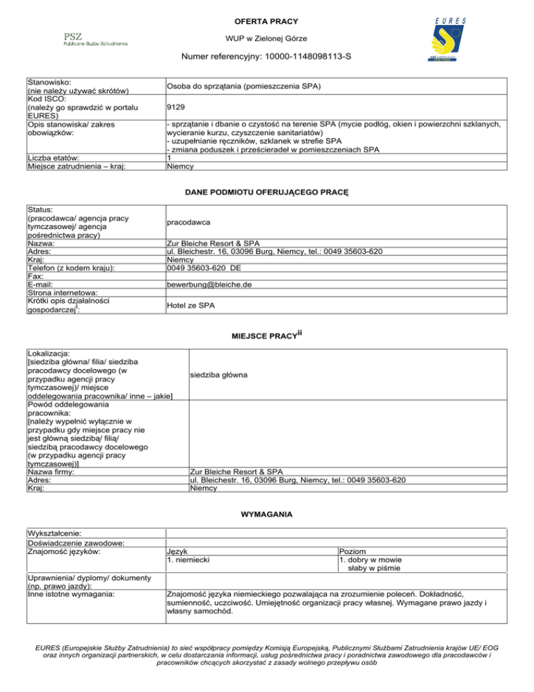 OFERTA PRACY WUP w Zielonej Górze Numer referencyjny: 10000-1148098113-S Stanowisko: (nie należy używać skrótów) Kod ISCO: (należy go sprawdzić w portalu EURES) Opis stanowiska/ zakres obowiązków: Liczba etatów: Miejsce zatrudnienia – kraj: Osoba do sprzątania (pomieszczenia SPA) 9129 - sprzątanie i dbanie o czystość na terenie SPA (mycie podłóg, okien i powierzchni szklanych, wycieranie kurzu, czyszczenie sanitariatów) - uzupełnianie ręczników, szklanek w strefie SPA - zmiana poduszek i prześcieradeł w pomieszczeniach SPA 1 Niemcy DANE PODMIOTU OFERUJĄCEGO PRACĘ Status: (pracodawca/ agencja pracy tymczasowej/ agencja pośrednictwa pracy) Nazwa: Adres: Kraj: Telefon (z kodem kraju): Fax: E-mail: Strona internetowa: Krótki opis działalności gospodarczeji: pracodawca Zur Bleiche Resort & SPA ul. Bleichestr. 16, 03096 Burg, Niemcy, tel.: 0049 35603-620 Niemcy 0049 35603-620 DE [email protected] Hotel ze SPA MIEJSCE PRACYii Lokalizacja: [siedziba główna/ filia/ siedziba pracodawcy docelowego (w przypadku agencji pracy tymczasowej)/ miejsce oddelegowania pracownika/ inne – jakie] Powód oddelegowania pracownika: [należy wypełnić wyłącznie w przypadku gdy miejsce pracy nie jest główną siedzibą/ filią/ siedzibą pracodawcy docelowego (w przypadku agencji pracy tymczasowej)] Nazwa firmy: Adres: Kraj: siedziba główna Zur Bleiche Resort & SPA ul. Bleichestr. 16, 03096 Burg, Niemcy, tel.: 0049 35603-620 Niemcy WYMAGANIA Wykształcenie: Doświadczenie zawodowe: Znajomość języków: Uprawnienia/ dyplomy/ dokumenty (np. prawo jazdy): Inne istotne wymagania: Język 1. niemiecki Poziom 1. dobry w mowie słaby w piśmie Znajomość języka niemieckiego pozwalająca na zrozumienie poleceń. Dokładność, sumienność, uczciwość. Umiejętność organizacji pracy własnej. Wymagane prawo jazdy i własny samochód. EURES (Europejskie Służby Zatrudnienia) to sieć współpracy pomiędzy Komisją Europejską, Publicznymi Służbami Zatrudnienia krajów UE/ EOG oraz innych organizacji partnerskich, w celu dostarczania informacji, usług pośrednictwa pracy i poradnictwa zawodowego dla pracodawców i pracowników chcących skorzystać z zasady wolnego przepływu osób WYNAGRODZENIE I WARUNKI ZATRUDNIENIA Wysokość pensji brutto: Wysokość pensji netto: Waluta, w jakiej wypłacana jest pensja: Rodzaj stawki wynagrodzenia: (godzinowa/ tygodniowa/ miesięczna/ roczna/ inna) Premie: Dodatkowe świadczenia (zakwaterowanie, wyżywienie, koszty związane ze zmianą miejsca zamieszkania, koszty podróży itp.): Nazwa firmy, z którą zostanie podpisana umowa: Rodzaj umowy: (umowa o pracę, umowa zlecenia, wolontariat, praktyka zawodowa/ staż, praca zdalna, agencja pracy tymczasowej, inne): Wymiar czasu pracy (praca na pełen etat/ część etatu): Czas trwania umowy: (nieokreślony/ określony) 8,84 Liczba godzin tygodniowo: Zmiany i praca w dni wolne: Data rozpoczęcia: Inne informacje: 40,00 Praca na zmiany również w weekndy. 2017-03-01 Praca od poniedziałku do niedzieli w godzinach 7.00-21.00 5 dniowy tydzień pracy, Możliwa praca w niepłnym wymiarze godzin- do uzgodnienia z pracodawcą. Euro Czasowy ze stawką godzinową WYnagrodzenie i dodatki zgodne z układem zbiorowym. Pracodawca pomaga w znalezieniu zakwaterowania. Umowa na czas określony- 12 miesięcy z możliwościa przedłużenia. Zur Bleiche Resort & SPA umowa o pracę pełen etat Data wygaśnięcia umowy (w przypadku umowy na czas określony): określony 2018-03-01 SPOSÓB SKŁADANIA WNIOSKU Wymagane dokumenty (list motywacyjny, CV itp.): Język, w którym muszą być sporządzone przedkładane dokumenty: Do kogo należy wysłać dokumenty: (do pracodawcy/ doradcy EURES) Gdzie należy wysłać dokumenty: (adres, adres e-mail, nr faksu z kodem kraju itp.) Dane teleadresowe doradcy EURES lub przedstawiciela pracodawcy: (nazwisko, adres, telefon, fax, e-mail itp.) CV, list motywacyjny, referencje (jeśli są) niemiecki do pracodawcy Dokumenty należy przesłać droga elektroniczną na adres: [email protected] lub pocztą tradycyjną: BLEICHE RESORT & SPA Frau Yvonne Schmidt Bleichestr. 16 03096 Burg (Spreewald) Brandenburg Deutschland BLEICHE RESORT & SPA Frau Yvonne Schmidt Bleichestr. 16 03096 Burg (Spreewald) Brandenburg Deutschland DODATKOWE INFORMACJE WAŻNOŚĆ 2016-12-15 Data publikacji: Termin przedkładania podań o pracę / 2017-03-01 zakończenia ważności oferty: Uprzejmie informujemy, że skontaktujemy się wyłącznie z wybranymi kandydatami. EURES (Europejskie Służby Zatrudnienia) to sieć współpracy pomiędzy Komisją Europejską, Publicznymi Służbami Zatrudnienia krajów UE/ EOG oraz innych organizacji partnerskich, w celu dostarczania informacji, usług pośrednictwa pracy i poradnictwa zawodowego dla pracodawców i pracowników chcących skorzystać z zasady wolnego przepływu osób UWAGA: 1. Umowa z zagranicznym pracodawcą jest zawierana, co do zasady, zgodnie z prawem kraju zatrudnienia. Oznacza to, że wszystkie roszczenia odnośnie warunków, które obejmuje umowa, można kierować wyłącznie do odpowiedniego sądu w kraju zatrudnienia. Publiczne służby zatrudnienia (EURES) nie mogą pośredniczyć ani reprezentować pracownika w sądzie kraju zatrudnienia w przypadku sporu z pracodawcą. 2. Publiczne służby zatrudnienia (EURES) dokładają wszelkich starań, aby zapewnić rzetelność i wiarygodność ofert pracy zgłoszonych w lokalnym urzędzie pracy. Należy wyjaśnić, że oferta pracy została zgłoszona przez stronę trzecią i EURES nie odpowiada za ewentualne rozbieżności między warunkami pracy określonymi w ofercie pracy i warunkami oferowanymi przez potencjalnego pracodawcę. 3. Publiczne służby zatrudnienia (EURES) informują, że będą zbierać, przetwarzać i przekazywać potencjalnym pracodawcom zgodnie z przepisami dotyczącymi ochrony danych osobowych wszystkie dane osobowe dostarczone przez osoby poszukujące pracy. iInformacje o firmie, 