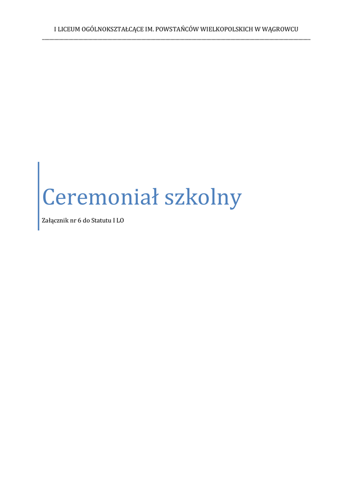 I LICEUM OGÓLNOKSZTAŁCĄCE IM. POWSTAŃCÓW WIELKOPOLSKICH W WĄGROWCU _______________________________________________________________________________________________________________ Ceremoniał szkolny Załącznik nr 6 do Statutu I LO Ceremoniał szkolny I. Wytyczne w sprawie ceremoniału szkolnego Głównym zadaniem szkoły jest nauczanie i wychowywanie młodych ludzi. Umiejętność właściwego zachowania i kultura języka jest podstawą funkcjonowania w społeczeństwie. Obok wiedzy i umiejętności przekazywanych na zajęciach lekcyjnych i pozalekcyjnych, należy uczyć młodzież zasad postępowania w różnych miejscach i sytuacjach, poczynając od reguł dotyczących organizacji świąt i uroczystości szkolnych. Zbiorem ustanowionych i obowiązujących w liceum norm zachowania się w czasie uroczystości szkolnych jest Ceremoniał Wewnątrzszkolny, który stanowi integralną część tradycji i harmonogramu pracy naszej szkoły. Opisuje symbole szkoły i formy celebracji sztandaru. Zadaniem ceremoniału jest również pomoc w organizacji ślubowań i apeli. II. Symbole szkoły 1. Liceum a. b. c. d. e. III. Ogólnokształcące im. Powstańców Wielkopolskich w Wągrowcu posiada: patrona – Powstańców Wielkopolskich, sztandar ceremoniał szkolny, kronikę szkoły, logo szkoły, złotą księgę absolwentów, do której wpisywani są absolwenci I LO, którzy uzyskali świadectwa ukończenia szkoły z wyróżnieniem oraz laureaci olimpiad na szczeblu ogólnopolskim. Sztandar szkoły 1. Sztandar szkolny jest symbolem Polski, symbolem Małej Ojczyzny, jaką jest nasza szkoła i jej najbliższe środowisko. Uroczystości z udziałem sztandaru wymagają powagi zachowania, a przechowywanie, transport i przygotowanie sztandaru do prezentacji, właściwych postaw oraz jego poszanowania. Sztandar jest przechowywany w zamkniętej gablocie w gmachu I Liceum Ogólnokształcącego. W tym samym miejscu znajdują się insygnia pocztu sztandarowego. 2. Skład pocztu sztandarowego: a. chorąży: jeden uczeń, b. asysta: dwie uczennice. IV. Poczet sztandarowy 1. Wyłanianie i zatwierdzanie kandydatów do pocztu sztandarowego W danym roku szkolnym funkcjonują dwa poczty sztandarowe: zasadniczy i rezerwowy. Poczet zasadniczy wybierany jest spośród uczniów klas drugich, którzy w poprzednim roku wchodzili w skład pocztu rezerwowego. W skład pocztu rezerwowego wchodzą uczniowie klas pierwszych, których typowali wychowawcy klas i Rada Samorządu Uczniowskiego. Stanowi on wsparcie dla pocztu zasadniczego. Kandydatury do składu pocztu rezerwowego, zgłaszane są za zgodą wychowawcy, nauczycieli i rodziców uczniów do opiekuna pocztu sztandarowego. Członków obydwu składów pocztu sztandarowego zatwierdza Rada Pedagogiczna. 2. W skład pocztu sztandarowego powinni wchodzić uczniowie o nienagannej postawie i godni tego zaszczytu tj.: a. mający przynajmniej dobre wyniki w nauce, b. odznaczający się wysoką kulturą osobistą i dobrą prezencją, c. wyróżniający się aktywnością społeczną w środowisku szkolnym, d. w miarę możliwości osoby mieszkające w Wągrowcu (dyspozycyjność pocztu w nagłym wypadku losowym), e. uczniowie zwolnieni z zajęć wychowania fizycznego nie powinni pretendować do pocztu sztandarowego. -2- Ceremoniał szkolny 3. Kadencja pocztu zasadniczego trwa jeden rok, począwszy od ślubowania w dniu uroczystego zakończenia roku szkolnego klas trzecich do chwili przekazania sztandaru nowemu pocztowi. Poczet rezerwowy przejmuje obowiązki pocztu zasadniczego w dniu zakończenia roku szkolnego przez uczniów klas trzecich. Decyzją Rady Pedagogicznej uczniowie mogą być odwołani ze składu pocztu sztandarowego. W takim wypadku należy dokonać uzupełnienia składu pocztu o nowych członków. Po skończeniu kadencji uczniowie otrzymują pamiątkowe dyplomy oraz nagrody książkowe, a ich nazwiska zostają wpisane do kroniki szkoły. 4. Insygnia pocztu sztandarowego to: a. biało - czerwone szarfy założone przez prawe ramię, b. białe rękawiczki. Uczniowie wchodzący w skład pocztu, uczestnicząc w uroczystościach szkolnych i pozaszkolnych, powinni posiadać strój galowy tj. chłopcy: białe koszule i ciemne spodnie, dziewczęta: białe bluzki i ciemne spódnice. 5. Opiekunem pocztu sztandarowego jest nauczyciel zatrudniony w I Ogólnokształcącym im. Powstańców Wielkopolskich w pełnym wymiarze godzin. V. Liceum Uroczystości z udziałem pocztu sztandarowego szkoły 1. Poczet sztandarowy uczestniczy w następujących uroczystościach na stałe wpisanych w harmonogram pracy szkoły: a. rozpoczęcie roku szkolnego, b. ślubowanie uczniów klas pierwszych, c. Święto Edukacji Narodowej, d. Święto Odzyskania Niepodległości, e. Święto Patrona Szkoły, f. pożegnanie uczniów klas trzecich, g. zakończenie roku szkolnego uczniów klas pierwszych i drugich. 2. Poczet sztandarowy pełni funkcję reprezentacyjną. W związku z tym wraz z dyrektorem szkoły bierze udział w następujących uroczystościach poza szkołą: a. Święto Odzyskania Niepodległości, b. święta i uroczystości religijne, c. msze św. z okazji uroczystości rocznicowych, d. msze i uroczystości pogrzebowe pracowników i uczniów szkoły, e. na zaproszenie innych szkół i instytucji. 3. Poczet a. b. c. VI. sztandarowy uczestniczy również w mszach świętych z okazji: uroczystości rozpoczęcia i zakończenia roku szkolnego, Dnia Patrona Szkoły, ceremonii zakończenia szkoły dla uczniów klas trzecich. Opis zachowania pocztu i uczniów w trakcie oficjalnych uroczystości 1. Osoba prowadząca uroczystość podaje komendę: Baczność , po której wszyscy obecni wstają i przyjmują postawę zasadniczą. Poczet sztandarowy wprowadzić - Poczet wchodzi do auli od strony tylnego wejścia i środkiem sali przechodzi na scenę. Podczas przemarszu dopuszcza się oparcie sztandaru na ramieniu. Chorąży ze sztandarem idzie w środku, a przed i za chorążym idzie asysta. Pocz