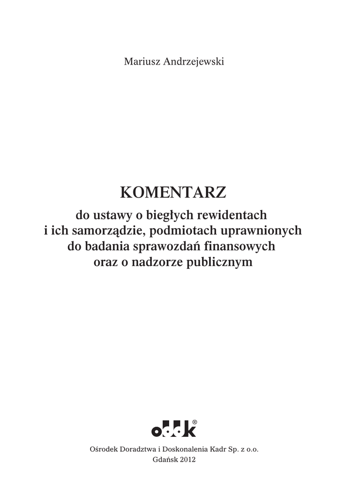 Mariusz Andrzejewski KOMENTARZ do ustawy o bieg³ych rewidentach i ich samorz¹dzie, podmiotach uprawnionych do badania sprawozdañ finansowych oraz o nadzorze publicznym Ośrodek Doradztwa i Doskonalenia Kadr Sp. z o.o. Gdańsk 2012 R ozdzia³ 2 Biegli rewidenci Art. 3 [Formy wykonywania zawodu] 1. Zawód biegłego rewidenta polega na wykonywaniu czynności rewizji finansowej. 2. Biegły rewident może wykonywać zawód jako: 1) osoba fizyczna prowadząca działalność we własnym imieniu i na własny rachunek; 2) wspólnik podmiotu uprawnionego do badania sprawozdań finansowych, o którym mowa w art. 47 pkt 2 i 3; 3) osoba pozostająca w stosunku pracy z podmiotem uprawnionym do badania sprawozdań finansowych, o którym mowa w art. 47; 4) osoba niepozostająca w stosunku pracy i nieprowadząca działalności we własnym imieniu i na własny rachunek, pod warunkiem zawarcia umowy cywilnoprawnej z podmiotem uprawnionym do badania sprawozdań finansowych, o którym mowa w art. 47. 3. W przypadkach, o których mowa w ust. 2 pkt 2–4, biegły rewident wykonuje zawód w imieniu podmiotu uprawnionego do badania sprawozdań finansowych. 4. Biegły rewident wpisany do rejestru biegłych rewidentów może wykonywać zawód po uprzednim zawiadomieniu, w formie pisemnej, Krajowej Rady Biegłych Rewidentów o podjęciu i formie wykonywania zawodu, a w szczególności o adresie i nazwie podmiotu uprawnionego do badania sprawozdań finansowych, w imieniu którego będzie wykonywał zawód. 5. Krajowa Rada Biegłych Rewidentów określi, w formie uchwały, wzór zawiadomienia, o którym mowa w ust. 4. 33 Art. 3 Rozdział 2 6. Biegli rewidenci zatrudnieni w samorządzie biegłych rewidentów oraz pracujący w charakterze pracownika naukowo-dydaktycznego lub naukowego mogą wykonywać zawód wyłącznie w formie określonej w ust. 2 pkt 4. Już w pierwszych stwierdzeniach w tym rozdziale odnajdujemy uzasadnienie dla wszechstronnych rozważań, które zostały przeprowadzone przy omawianiu zakresu pojęcia czynności rewizji finansowych. Rozdział drugi rozpoczyna się od określenia tego, co ustawodawca rozumie przez wykonywanie zawodu biegłego rewidenta i formy wykonywania tego zawodu. W art. 3 ust. 1 stwierdzono, że zawód biegłego rewidenta polega na wykonywaniu czynności rewizji finansowej. Stąd też tak ważne jest, ażeby w sposób jednoznaczny były określone czynności, które możemy zaliczyć do czynności rewizji finansowej. Warto także podkreślić, że w rozdziale drugim ustawodawca zebrał te przepisy, które dotyczą biegłych rewidentów, osób fizycznych, a nie dotyczą w sposób bezpośredni podmiotów uprawnionych do badania sprawozdań finansowych. Z punktu widzenia podmiotowości ustawodawca podał definicję biegłego rewidenta dopiero w art. 5 ust. 1, gdzie stwierdzono, że biegłym rewidentem jest osoba wpisana do rejestru biegłych rewidentów. Można zatem stwierdzić, że w Polsce biegły rewident to osoba, która posiada taki tytuł i jednocześnie jest wpisana do rejestru biegłych rewidentów. Niemożliwa jest sytuacja, w której ktoś posiada tytuł biegłego rewidenta, a nie jest wpisany do rejestru lub odwrotnie, z wyjątkiem krótkiego czasu od momentu złożenia ślubowania do czasu dokonania wpisu takiej osoby do rejestru biegłych rewidentów, czego dokonuje KNA. Zgodnie z zapisami zawartymi w art. 3 ust. 2 ustawy biegły rewident, w imieniu podmiotu uprawnionego do badania sprawozdań finansowych (art. 3 ust. 3, który się odnosi do art. 3 ust. 2 pkt 2–4), wykonuje zawód jako: 1) osoba fizyczna prowadząca działalność we własnym imieniu i na własny rachunek, 2) wspólnik podmiotu uprawnionego do badania sprawozdań finansowych, takiego jak: spółka cywilna, spółka jawna, spółka komandytowa lub spółka partnerska, o których mowa w art. 47 pkt 2 i 3 ustawy, 3) osoba pozostająca w stosunku pracy z podmiotem uprawnionym do badania sprawozdań finansowych, enumeratywnie wymienionych w art. 47 ustawy, 4) osoba niepozostająca w stosunku pracy i nieprowadząca działalności we własnym imieniu i na własny rachunek, pod warunkiem zawarcia umowy cywilnoprawnej z podmiotem uprawnionym do badania sprawozdań finansowych, o którym mowa w art. 47 ustawy; ta forma wykonywania zawodu (poprzez zawarcie umowy cywilnoprawnej) jest dozwolona tylko i wyłącznie 34 Biegli rewidenci Art. 3 dla biegłych rewidentów zatrudnionych w samorządzie biegłych rewidentów oraz pracujących w charakterze pracownika naukowo-dydaktycznego lub naukowego, co wynika z treści art. 3 ust. 6 ustawy. Jeżeli biegły rewident jest tzw. etatowym pracownikiem, zatrudnionym na umowę o pracę chociażby w jednym podmiocie uprawnionym do badania sprawozdania finansowego, to nie może wykonywać tego zawodu na rzecz innego podmiotu w wyniku zawarcia z nim umowy cywilnoprawnej, ale może w dowolnej liczbie innych podmiotów uprawnionych do badania być zatrudniony na podstawie umowy o pracę. Trzeba przyznać, że ograniczenia te, jak również ograniczanie możliwości wykonywania zawodu dla pracowników naukowo-dydaktycznych i naukowych, trudno jest, w sposób wiarygodny i logiczny, uzasadnić. Należy podkreślić, że w treści art. 3 ust. 2 pkt 4 ustawy ustawodawca nie zaznaczył, iż czyniąc zastrzeżenie do osób niepozostających w stosunku pracy i nieprowadzących działalności we własnym imieniu i na własny rachunek, odnosi się do tych osób, o których jest mowa w pkt 1 i 2 tego ustępu. A zatem z analizy pkt 1–4 ust. 2 art. 3 wynika, że jeżeli biegły rewident prowadzi działalność we własnym imieniu i na własny rachunek, co niekoniecznie musi się wiązać z działalnością w zakresie wykonywania zawodu biegłego rewidenta, nie przysługuje mu prawo wykonywania zawodu poprzez zawarcie umowy cywilnoprawnej, a może jedynie działać w wyniku zawarcia transakcji handlowej poprzez wystawienie stosownej faktury VAT za tak zrealizowaną usługę. Dla przyk