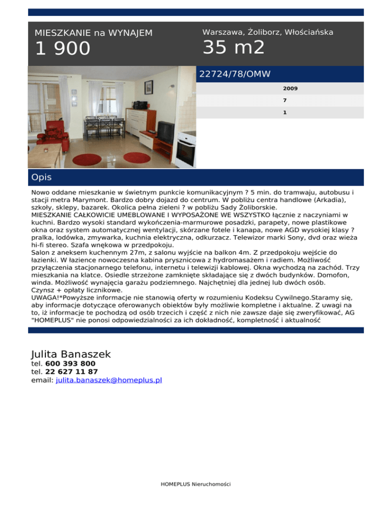Warszawa, Żoliborz, Włościańska MIESZKANIE na WYNAJEM 35 m2 1 900 22724/78/OMW 2009 7 1 Opis Nowo oddane mieszkanie w świetnym punkcie komunikacyjnym ? 5 min. do tramwaju, autobusu i stacji metra Marymont. Bardzo dobry dojazd do centrum. W pobliżu centra handlowe (Arkadia), szkoły, sklepy, bazarek. Okolica pełna zieleni ? w pobliżu Sady Żoliborskie. MIESZKANIE CAŁKOWICIE UMEBLOWANE I WYPOSAŻONE WE WSZYSTKO łącznie z naczyniami w kuchni. Bardzo wysoki standard wykończenia-marmurowe posadzki, parapety, nowe plastikowe okna oraz system automatycznej wentylacji, skórzane fotele i kanapa, nowe AGD wysokiej klasy ? pralka, lodówka, zmywarka, kuchnia elektryczna, odkurzacz. Telewizor marki Sony, dvd oraz wieża hi-fi stereo. Szafa wnękowa w przedpokoju. Salon z aneksem kuchennym 27m, z salonu wyjście na balkon 4m. Z przedpokoju wejście do łazienki. W łazience nowoczesna kabina prysznicowa z hydromasażem i radiem. Możliwość przyłączenia stacjonarnego telefonu, internetu i telewizji kablowej. Okna wychodzą na zachód. Trzy mieszkania na klatce. Osiedle strzeżone zamknięte składające się z dwóch budynków. Domofon, winda. Możliwość wynajęcia garażu podziemnego. Najchętniej dla jednej lub dwóch osób. Czynsz + opłaty licznikowe. UWAGA!*Powyższe informacje nie stanowią oferty w rozumieniu Kodeksu Cywilnego.Staramy się, aby informacje dotyczące oferowanych obiektów były możliwie kompletne i aktualne. Z uwagi na to, iż informacje te pochodzą od osób trzecich i część z nich nie zawsze daje się zweryfikować, AG "HOMEPLUS" nie ponosi odpowiedzialności za ich dokładność, kompletność i aktualność Julita Banaszek tel. 600 393 800 tel. 22 627 11 87 email: [email protected] HOMEPLUS Nieruchomości Powered by TCPDF (www.tcpdf.org)