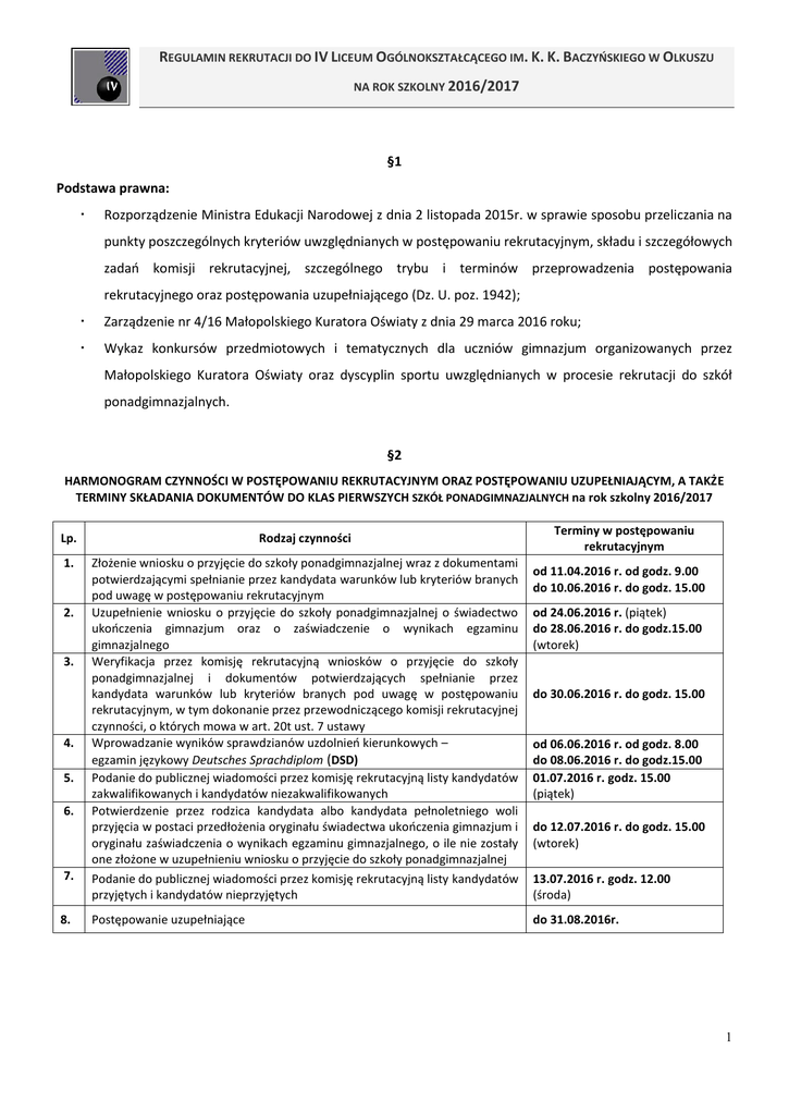 REGULAMIN REKRUTACJI DO IV LICEUM OGÓLNOKSZTAŁCĄCEGO IM. K. K. BACZYŃSKIEGO W OLKUSZU NA ROK SZKOLNY 2016/2017 §1 Podstawa prawna: Rozporządzenie Ministra Edukacji Narodowej z dnia 2 listopada 2015r. w sprawie sposobu przeliczania na punkty poszczególnych kryteriów uwzględnianych w postępowaniu rekrutacyjnym, składu i szczegółowych zadań komisji rekrutacyjnej, szczególnego trybu i terminów przeprowadzenia postępowania rekrutacyjnego oraz postępowania uzupełniającego (Dz. U. poz. 1942); Zarządzenie nr 4/16 Małopolskiego Kuratora Oświaty z dnia 29 marca 2016 roku; Wykaz konkursów przedmiotowych i tematycznych dla uczniów gimnazjum organizowanych przez Małopolskiego Kuratora Oświaty oraz dyscyplin sportu uwzględnianych w procesie rekrutacji do szkół ponadgimnazjalnych. §2 HARMONOGRAM CZYNNOŚCI W POSTĘPOWANIU REKRUTACYJNYM ORAZ POSTĘPOWANIU UZUPEŁNIAJĄCYM, A TAKŻE TERMINY SKŁADANIA DOKUMENTÓW DO KLAS PIERWSZYCH SZKÓŁ PONADGIMNAZJALNYCH na rok szkolny 2016/2017 Lp. Rodzaj czynności 1. Złożenie wniosku o przyjęcie do szkoły ponadgimnazjalnej wraz z dokumentami potwierdzającymi spełnianie przez kandydata warunków lub kryteriów branych pod uwagę w postępowaniu rekrutacyjnym Uzupełnienie wniosku o przyjęcie do szkoły ponadgimnazjalnej o świadectwo ukończenia gimnazjum oraz o zaświadczenie o wynikach egzaminu gimnazjalnego Weryfikacja przez komisję rekrutacyjną wniosków o przyjęcie do szkoły ponadgimnazjalnej i dokumentów potwierdzających spełnianie przez kandydata warunków lub kryteriów branych pod uwagę w postępowaniu rekrutacyjnym, w tym dokonanie przez przewodniczącego komisji rekrutacyjnej czynności, o których mowa w art. 20t ust. 7 ustawy Wprowadzanie wyników sprawdzianów uzdolnień kierunkowych – egzamin językowy Deutsches Sprachdiplom (DSD) Podanie do publicznej wiadomości przez komisję rekrutacyjną listy kandydatów zakwalifikowanych i kandydatów niezakwalifikowanych Potwierdzenie przez rodzica kandydata albo kandydata pełnoletniego woli przyjęcia w postaci przedłożenia oryginału świadectwa ukończenia gimnazjum i oryginału zaświadczenia o wynikach egzaminu gimnazjalnego, o ile nie zostały one złożone w uzupełnieniu wniosku o przyjęcie do szkoły ponadgimnazjalnej Podanie do publicznej wiadomości przez komisję rekrutacyjną listy kandydatów przyjętych i kandydatów nieprzyjętych 2. 3. 4. 5. 6. 7. 8. Postępowanie uzupełniające Terminy w postępowaniu rekrutacyjnym od 11.04.2016 r. od godz. 9.00 do 10.06.2016 r. do godz. 15.00 od 24.06.2016 r. (piątek) do 28.06.2016 r. do godz.15.00 (wtorek) do 30.06.2016 r. do godz. 15.00 od 06.06.2016 r. od godz. 8.00 do 08.06.2016 r. do godz.15.00 01.07.2016 r. godz. 15.00 (piątek) do 12.07.2016 r. do godz. 15.00 (wtorek) 13.07.2016 r. godz. 12.00 (środa) do 31.08.2016r. 1 §3 1. IV Liceum Ogólnokształcące im. K.K. Baczyńskiego objęte jest systemem rekrutacji elektronicznej. Kandydaci do IV LO powinni zalogować się do systemu na stronie https://malopolska.edu.com.pl. 2. Wydrukowane wnioski składają wszyscy kandydaci, dla których IV LO jest szkołą pierwszego wyboru (szkołą, której oddział wskazali jako pierwszy). 3. Do wniosku o przyjęcie do klasy pierwszej należy dołączyć dokumenty o których mowa w art. 20t. ust. 2 ustawy o systemie oświaty (Dz. U. z 2004 r. Nr 256, poz. 2572 ze zmianami), w tym: a) oświadczenie o wielodzietności rodziny kandydata; b) prawomocny wyrok sądu rodzinnego orzekający rozwód lub separację lub akt zgonu oraz oświadczenie o samotnym wychowywaniu dziecka oraz niewychowywaniu żadnego dziecka wspólnie z jego rodzicem c) orzeczenie o niepełnosprawności lub stopniu niepełnosprawności; d) w przypadku kandydatów z problemami zdrowotnymi, ograniczającymi możliwości wyboru kierunku kształcenia ze względu na stan zdrowia, opinię wydaną przez publiczną poradnię psychologiczno – pedagogiczną, w tym poradnię specjalistyczną; e) dokument poświadczający objęcie dziecka pieczą zastępczą zgodnie z ustawą z dnia 9 czerwca 2011 r. o wspieraniu rodziny i systemie pieczy zastępczej (Dz. U. z 2013 r. poz. 135, ze zm.6)); f) oraz inne istotne zaświadczenia; g) opinię wydaną przez publiczną poradnię psychologiczno-pedagogiczną, w tym publiczną poradnię specjalistyczną, w sprawie pierwszeństwa w przyjęciu ucznia z problemami zdrowotnymi do szkoły ponadgimnazjalnej, 4. Kandydat może wybrać w IV LO wszystkie oddziały, wskazując kolejność wg własnych preferencji. 5. Od 24 czerwca 2016r. do 28 czerwca 2016r. do godz. 15:00 – kandydaci, dla których IV LO jest szkołą pierwszego wyboru dostarczają: a) świadectwo ukończenia gimnazjum lub poświadczoną przez dyrektora gimnazjum kopię świadectwa ukończenia gimnazjum; b) zaświadczenie o wyniku egzaminu lub poświadczoną przez dyrektora gimnazjum kopię zaświadczenia o wyniku egzaminu gimnazjalnego; c) zaświadczenia o uzyskaniu tytułu laureata lub finalisty konkursów, o których mowa w niniejszym regulaminie. §4 Przyznawanie punktów przy rekrutacji. 1. Przy ustalaniu liczby punktów za oceny na świadectwie ukończenia gimnazjum stosujemy następujące przeliczenia: 1) celujący – 20 punktów, 2) bardzo dobry – 16 punktów, 3) dobry – 12 punktów, 4) dostateczny – 8 punktów, 5) dopuszczający – 2 punkty. 2. Ukończenie gimnazjum z wyróżnieniem – 5 punktów. 2 3. Punkty za szczególne osiągnięcia wpisane na świadectwie kandydata: a) uzyskanie w zawodach wiedzy będących konkursem o zasięgu ponadwojewódzkim organizowanym przez kuratorów oświaty na podstawie zawartych porozumień: tytułu finalisty konkursu przedmiotowego – 10 punktów, tytułu laureata konkursu tematycznego lub interdyscyplinarnego – 7 punktów, tytułu finalisty konkursu tematycznego lub interdyscyplinarnego – 5 punktów; b) uzyskanie w zawodach wiedzy będących konkursem o zasięgu międzynarodowym lub ogólnopolskim al