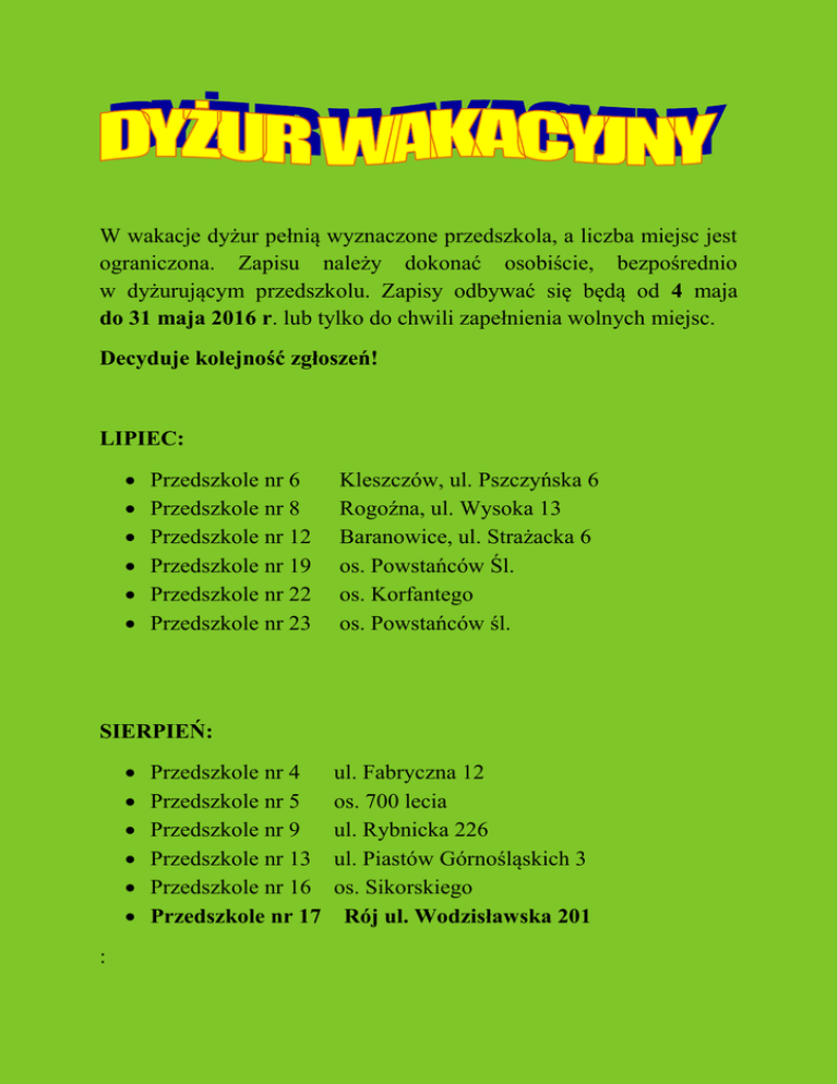 W wakacje dyżur pełnią wyznaczone przedszkola, a liczba miejsc jest ograniczona. Zapisu należy dokonać osobiście, bezpośrednio w dyżurującym przedszkolu. Zapisy odbywać się będą od 4 maja do 31 maja 2016 r. lub tylko do chwili zapełnienia wolnych miejsc. Decyduje kolejność zgłoszeń! LIPIEC: Przedszkole nr 6 Przedszkole nr 8 Przedszkole nr 12 Przedszkole nr 19 Przedszkole nr 22 Przedszkole nr 23 Kleszczów, ul. Pszczyńska 6 Rogoźna, ul. Wysoka 13 Baranowice, ul. Strażacka 6 os. Powstańców Śl. os. Korfantego os. Powstańców śl. SIERPIEŃ: : Przedszkole nr 4 Przedszkole nr 5 Przedszkole nr 9 Przedszkole nr 13 Przedszkole nr 16 Przedszkole nr 17 ul. Fabryczna 12 os. 700 lecia ul. Rybnicka 226 ul. Piastów Górnośląskich 3 os. Sikorskiego Rój ul. Wodzisławska 201