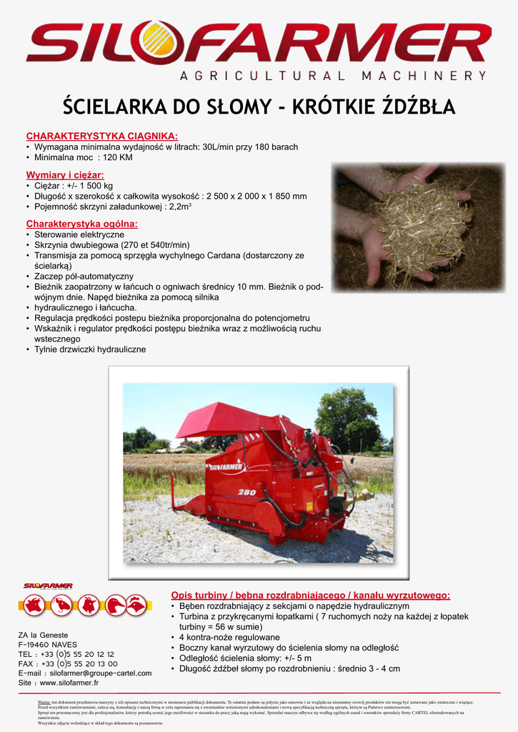 ŚCIELARKA DO SŁOMY - KRÓTKIE ŹDŹBŁA CHARAKTERYSTYKA CIĄGNIKA: • Wymagana minimalna wydajność w litrach: 30L/min przy 180 barach • Minimalna moc : 120 KM Wymiary i ciężar: • Ciężar : +/- 1 500 kg • Długość x szerokość x całkowita wysokość : 2 500 x 2 000 x 1 850 mm • Pojemność skrzyni załadunkowej : 2,2m3 Charakterystyka ogólna: • Sterowanie elektryczne • Skrzynia dwubiegowa (270 et 540tr/min) • Transmisja za pomocą sprzęgła wychylnego Cardana (dostarczony ze ścielarką) • Zaczep pół-automatyczny • Bieżnik zaopatrzony w łańcuch o ogniwach średnicy 10 mm. Bieżnik o podwójnym dnie. Napęd bieżnika za pomocą silnika • hydraulicznego i łańcucha. • Regulacja prędkości postepu bieżnika proporcjonalna do potencjometru • Wskaźnik i regulator prędkości postępu bieżnika wraz z możliwością ruchu wstecznego • Tylnie drzwiczki hydrauliczne Opis turbiny / bębna rozdrabniającego / kanału wyrzutowego: ZA la Geneste F-19460 NAVES TEL : +33 (0)5 55 20 12 12 FAX : +33 (0)5 55 20 13 00 E-mail : [email protected] Site : www.silofarmer.fr • Bęben rozdrabniający z sekcjami o napędzie hydraulicznym • Turbina z przykręcanymi łopatkami ( 7 ruchomych noży na każdej z łopatek turbiny = 56 w sumie) • 4 kontra-noże regulowane • Boczny kanał wyrzutowy do ścielenia słomy na odległość • Odległość ścielenia słomy: +/- 5 m • Długość źdźbeł słomy po rozdrobnieniu : średnio 3 - 4 cm Ważne: ten dokument przedstawia maszyny z ich opisami technicznymi w momencie publikacji dokumentu. Te ostatnie podane są jedynie jako umowne i ze względu na nieustanny rozwój produktów nie mogą być uznawane jako ostateczne i wiążące. Przed wszystkimi zamówieniami, zaleca się, konsultację z naszą firmą w celu zapoznania się z ewentualnie wniesionymi udoskonaleniami i nową specyfikacją techniczną sprzętu, którym są Państwo zainteresowani. Sprzęt ten przeznaczony jest dla profesjonalistów, którzy potrafią ocenić jego możliwości w stosunku do pracy jaką mają wykonać. Sprzedaż maszyn odbywa się według ogólnych zasad i warunków sprzedaży firmy CARTEL sformułowanych na zamówieniu. Wszystkie zdjęcia wchodzące w skład tego dokumentu są pozaumowne. Wiązki słomy owalne lub prostokątne ( z opcją przedłużenia drzwi załadunkowych) Bęben rozdrabniający z sekcjami o napędzie hydraulicznym ZA la Geneste F-19460 NAVES TEL : +33 (0)5 55 20 12 12 FAX : +33 (0)5 55 20 13 00 E-mail : [email protected] Site : www.silofarmer.fr 7 ruchomych noży na każdej z łopatek turbiny = 56 w sumie 4 kontra-noże regulowane Ważne: ten dokument przedstawia maszyny z ich opisami technicznymi w momencie publikacji dokumentu. Te ostatnie podane są jedynie jako umowne i ze względu na nieustanny rozwój produktów nie mogą być uznawane jako ostateczne i wiążące. Przed wszystkimi zamówieniami, zaleca się, konsultację z naszą firmą w celu zapoznania się z ewentualnie wniesionymi udoskonaleniami i nową specyfikacją techniczną sprzętu, którym są Państwo zainteresowani. Sprzęt ten przeznaczony jest dla profesjonalistów, którzy potrafią ocenić jego możliwości w stosunku do pracy jaką mają wykonać. Sprzedaż maszyn odbywa się według ogólnych zasad i warunków sprzedaży firmy CARTEL sformułowanych na zamówieniu. Wszystkie zdjęcia wchodzące w skład tego dokumentu są pozaumowne.