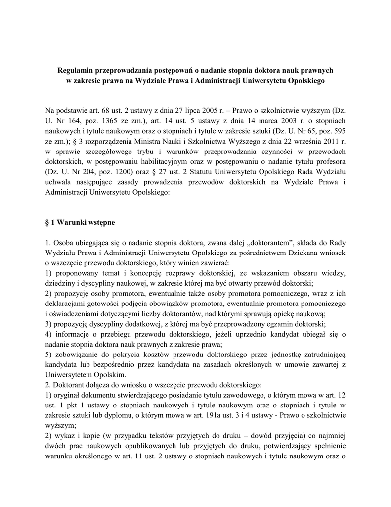 Regulamin przeprowadzania postępowań o nadanie stopnia doktora nauk prawnych w zakresie prawa na Wydziale Prawa i Administracji Uniwersytetu Opolskiego Na podstawie art. 68 ust. 2 ustawy z dnia 27 lipca 2005 r. – Prawo o szkolnictwie wyższym (Dz. U. Nr 164, poz. 1365 ze zm.), art. 14 ust. 5 ustawy z dnia 14 marca 2003 r. o stopniach naukowych i tytule naukowym oraz o stopniach i tytule w zakresie sztuki (Dz. U. Nr 65, poz. 595 ze zm.); § 3 rozporządzenia Ministra Nauki i Szkolnictwa Wyższego z dnia 22 września 2011 r. w sprawie szczegółowego trybu i warunków przeprowadzania czynności w przewodach doktorskich, w postępowaniu habilitacyjnym oraz w postępowaniu o nadanie tytułu profesora (Dz. U. Nr 204, poz. 1200) oraz § 27 ust. 2 Statutu Uniwersytetu Opolskiego Rada Wydziału uchwala następujące zasady prowadzenia przewodów doktorskich na Wydziale Prawa i Administracji Uniwersytetu Opolskiego: § 1 Warunki wstępne 1. Osoba ubiegająca się o nadanie stopnia doktora, zwana dalej „doktorantem”, składa do Rady Wydziału Prawa i Administracji Uniwersytetu Opolskiego za pośrednictwem Dziekana wniosek o wszczęcie przewodu doktorskiego, który winien zawierać: 1) proponowany temat i koncepcję rozprawy doktorskiej, ze wskazaniem obszaru wiedzy, dziedziny i dyscypliny naukowej, w zakresie której ma być otwarty przewód doktorski; 2) propozycję osoby promotora, ewentualnie także osoby promotora pomocniczego, wraz z ich deklaracjami gotowości podjęcia obowiązków promotora, ewentualnie promotora pomocniczego i oświadczeniami dotyczącymi liczby doktorantów, nad którymi sprawują opiekę naukową; 3) propozycję dyscypliny dodatkowej, z której ma być przeprowadzony egzamin doktorski; 4) informację o przebiegu przewodu doktorskiego, jeżeli uprzednio kandydat ubiegał się o nadanie stopnia doktora nauk prawnych z zakresie prawa; 5) zobowiązanie do pokrycia kosztów przewodu doktorskiego przez jednostkę zatrudniającą kandydata lub bezpośrednio przez kandydata na zasadach określonych w umowie zawartej z Uniwersytetem Opolskim. 2. Doktorant dołącza do wniosku o wszczęcie przewodu doktorskiego: 1) oryginał dokumentu stwierdzającego posiadanie tytułu zawodowego, o którym mowa w art. 12 ust. 1 pkt 1 ustawy o stopniach naukowych i tytule naukowym oraz o stopniach i tytule w zakresie sztuki lub dyplomu, o którym mowa w art. 191a ust. 3 i 4 ustawy - Prawo o szkolnictwie wyższym; 2) wykaz i kopie (w przypadku tekstów przyjętych do druku – dowód przyjęcia) co najmniej dwóch prac naukowych opublikowanych lub przyjętych do druku, potwierdzający spełnienie warunku określonego w art. 11 ust. 2 ustawy o stopniach naukowych i tytule naukowym oraz o stopniach i tytule w zakresie sztuki, a także informację o działalności popularyzującej naukę. Przy czym: a) co najmniej jedną publikacją musi być artykuł naukowy opublikowany w recenzowanym czasopiśmie naukowym, o zasięgu co najmniej krajowym, wymienionym w wykazie czasopism punktowanych lub monografia naukowa; b) drugą publikacją może być artykuł naukowy opublikowany w recenzowanym czasopiśmie naukowym o zasięgu co najmniej krajowym, wymienionym w wykazie czasopism punktowanych lub rozdział zamieszczony w recenzowanej pracy zbiorowej, lub publikacja naukowa w recenzowanym sprawozdaniu z międzynarodowej konferencji naukowej; 3) życiorys; 3. Jeżeli doktorant przedstawia publikację, której jest współautorem to publikacja ta: a) powinna być artykułem naukowym opublikowanym w czasopiśmie, o którym mowa w ust. 3 pkt. a lub współautorską monografią; b) doktorant musi złożyć pisemne oświadczenie określające jego indywidualny wkład w powstanie publikacji (nie mniej niż 40%). 4. Doktorant może dołączyć do wniosku o wszczęcie przewodu doktorskiego: 1) certyfikat potwierdzający znajomość nowożytnego języka obcego, ujęty w wykazie stanowiącym załącznik do rozporządzenia Ministra Nauki i Szkolnictwa Wyższego z dnia 22 września 2011 r.; 2) wniosek o wyrażenie przez Radę Wydziału zgody na przedstawienie rozprawy w języku innym niż język polski. § 2 Wszczęcie przewodu doktorskiego 1. Przed podjęciem uchwały o wszczęciu przewodu doktorskiego Rada Wydziału zapoznaje się z opinią komisji, przed którą dokonano publicznej prezentacji konspektu rozprawy doktorskiej. Członkowie Rady Wydziału mają prawo wglądu do przedłożonych przez doktoranta dokumentów, o których mowa w § 1 2. Komisja ta powoływana jest przez Dziekana i składa się z trzech do pięciu samodzielnych pracowników naukowych. W jej skład wchodzą w szczególności samodzielni pracownicy naukowi jednostki dydaktycznej Wydziału, w którym pracuje opiekun naukowy (kandydat na promotora), ewentualnie kandydat na promotora pomocniczego. Posiedzenie komisji ma charakter otwarty. W toku posiedzenia Komisja: 1) zapoznaje się z opinią opiekuna naukowego doktoranta (kandydata na promotora), w której przedstawia on w szczególności życiorys naukowy doktoranta (ukończone studia, odbyte staże, praktyki, posiadane doświadczenie itp.) i jego dotychczasowego dorobek naukowy (publikacje, referaty itp.); 2) wysłuchuje wystąpienia doktoranta, w którym dokonuje on ustnego uzasadnienia wyboru tematu i przedstawia konspekt rozprawy doktorskiej. Członkowie komisji otrzymują informację o pracy doktorskiej w postaci planu rozprawy oraz do 7 stron omówienia podstawowych jej wątków oraz wykaz źródeł i literatury przedmiotu. Materiał ten przygotowuje doktorant i składa go wraz z wnioskiem o wszczęcie przewodu; 3) przeprowadza dyskusję z aktywnym udziałem doktoranta; w dyskusji mogą uczestniczyć także osoby nie wchodzące w skład komisji, a obecne na posiedzeniu komisji; 4) dokonuje końcowej oceny. 2. W uchwale o wszczęciu przewodu doktorskiego Rada Wydziału zatwierdza – uzgodniony z doktorantem i opiekunem naukowym doktoranta – temat rozprawy doktorskiej i wyznacza pro