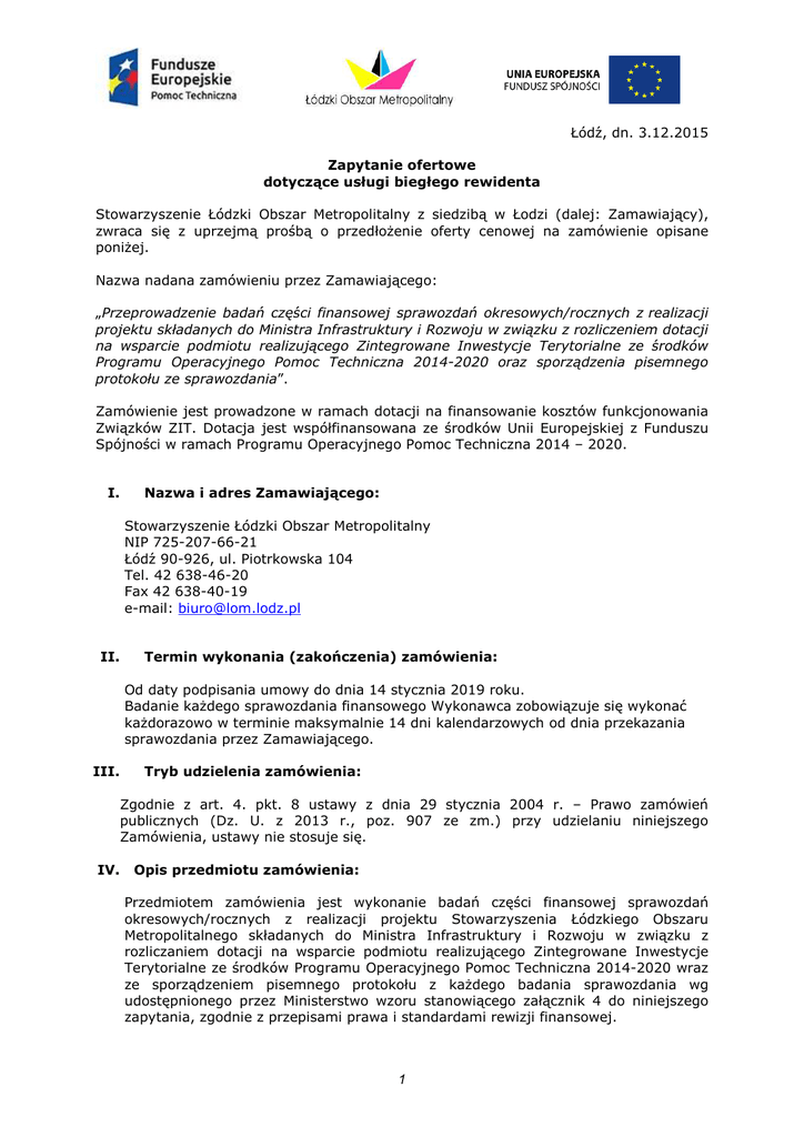 Łódź, dn. 3.12.2015 Zapytanie ofertowe dotyczące usługi biegłego rewidenta Stowarzyszenie Łódzki Obszar Metropolitalny z siedzibą w Łodzi (dalej: Zamawiający), zwraca się z uprzejmą prośbą o przedłożenie oferty cenowej na zamówienie opisane poniżej. Nazwa nadana zamówieniu przez Zamawiającego: „Przeprowadzenie badań części finansowej sprawozdań okresowych/rocznych z realizacji projektu składanych do Ministra Infrastruktury i Rozwoju w związku z rozliczeniem dotacji na wsparcie podmiotu realizującego Zintegrowane Inwestycje Terytorialne ze środków Programu Operacyjnego Pomoc Techniczna 2014-2020 oraz sporządzenia pisemnego protokołu ze sprawozdania”. Zamówienie jest prowadzone w ramach dotacji na finansowanie kosztów funkcjonowania Związków ZIT. Dotacja jest współfinansowana ze środków Unii Europejskiej z Funduszu Spójności w ramach Programu Operacyjnego Pomoc Techniczna 2014 – 2020. I. Nazwa i adres Zamawiającego: Stowarzyszenie Łódzki Obszar Metropolitalny NIP 725-207-66-21 Łódź 90-926, ul. Piotrkowska 104 Tel. 42 638-46-20 Fax 42 638-40-19 e-mail: [email protected] II. Termin wykonania (zakończenia) zamówienia: Od daty podpisania umowy do dnia 14 stycznia 2019 roku. Badanie każdego sprawozdania finansowego Wykonawca zobowiązuje się wykonać każdorazowo w terminie maksymalnie 14 dni kalendarzowych od dnia przekazania sprawozdania przez Zamawiającego. III. Tryb udzielenia zamówienia: Zgodnie z art. 4. pkt. 8 ustawy z dnia 29 stycznia 2004 r. – Prawo zamówień publicznych (Dz. U. z 2013 r., poz. 907 ze zm.) przy udzielaniu niniejszego Zamówienia, ustawy nie stosuje się. IV. Opis przedmiotu zamówienia: Przedmiotem zamówienia jest wykonanie badań części finansowej sprawozdań okresowych/rocznych z realizacji projektu Stowarzyszenia Łódzkiego Obszaru Metropolitalnego składanych do Ministra Infrastruktury i Rozwoju w związku z rozliczaniem dotacji na wsparcie podmiotu realizującego Zintegrowane Inwestycje Terytorialne ze środków Programu Operacyjnego Pomoc Techniczna 2014-2020 wraz ze sporządzeniem pisemnego protokołu z każdego badania sprawozdania wg udostępnionego przez Ministerstwo wzoru stanowiącego załącznik 4 do niniejszego zapytania, zgodnie z przepisami prawa i standardami rewizji finansowej. 1 Szczegółowa specyfikacja Badaniu podlegać będą sprawozdania okresowe i roczne, przy czym sprawozdanie okresowe składane jest niezwłocznie po zrealizowaniu zakresu finansowo-rzeczowego umożliwiającego wystąpienie o kolejną transzę dotacji. Sprawozdanie roczne składane jest w terminie do 14 dni od zakończenia roku kalendarzowego i zawiera rozliczenie wykorzystania środków dotacji otrzymanych w danym roku. Zgodnie z umową zawartą pomiędzy Stowarzyszeniem ŁOM i Ministerstwem Infrastruktury i Rozwoju badaniu będą podlegać następujące sprawozdania: - 1 sprawozdanie okresowe w 2015 roku oraz 1 sprawozdanie roczne rozliczające 2015 rok. - 3 sprawozdania okresowe w 2016 roku i 1 sprawozdanie roczne za 2016 r. - 3 sprawozdania okresowe w 2017 roku i 1 sprawozdanie roczne za 2017 r. - 3 sprawozdania okresowe w 2018 roku i 1 sprawozdanie roczne za 2018 r. Łącznie zaplanowanych zostało 14 sprawozdań. Zamawiający zastrzega sobie prawo do zwiększenia liczby sprawozdań finansowych (szczególnie w przypadku konieczności sporządzenia korekty sprawozdania przekazanego do Ministerstwa Infrastruktury i Rozwoju) bez dodatkowego wynagrodzenia. Przewidywana liczba dokumentów księgowych ujętych w każdym sprawozdaniu ok. 100, w tym m.in. faktury, delegacje służbowe oraz listy płac. Planowana wartość wydatków: 2015 - 1 011 520,00 PLN 2016 - 2 170 640,00 PLN 2017 - 2 170 640,00 PLN 2018 - 2 170 640,00 PLN V. Warunki udziału w postępowaniu O udzielenie zamówienia mogą ubiegać się Wykonawcy, którzy: − − − dysponują osobami zdolnymi do wykonywania zamówienia tj. biegli rewidenci wpisani na listę podmiotów uprawnionych do wykonywania badań sprawozdań finansowych, posiadają niezbędną wiedzę i doświadczenie do wykonania zamówienia. W celu potwierdzenia spełnienia warunku Wykonawca powinien wykazać, że w okresie ostatnich pięciu lat, przed upływem terminu składania ofert, a jeśli okres prowadzenia działalności jest krótszy - w tym okresie, zrealizował, a w przypadku świadczeń okresowych lub ciągłych, że realizuje co najmniej dwie usługi polegające na badaniu sprawozdań finansowych podmiotów realizujących zadania współfinansowane ze środków unijnych lub badaniu sprawozdań z realizacji zadań współfinansowanych ze środków unijnych. dokumenty potwierdzające spełnienie warunku: a. kserokopia decyzji Krajowej Izby Biegłych Rewidentów w sprawie wpisania na listę podmiotów uprawnionych do badania sprawozdań finansowych; b. wykaz usług polegających na badaniu sprawozdań finansowych podmiotów realizujących zadania współfinansowane ze środków unijnych lub badaniu sprawozdań z realizacji zadań współfinansowanych ze środków unijnych w okresie ostatnich pięciu lat, przed upływem terminu do składania ofert, a jeśli okres prowadzenia działalności jest krótszy – w tym okresie, a w przypadku świadczeń okresowych lub ciągłych, że realizuje co najmniej dwie usługi – 2 sporządzony według załącznika nr 3; c. oświadczenie o spełnieniu przez biegłego rewidenta ustawowo określonych warunków do wyrażenia bezstronnej i niezależnej opinii o badanym sprawozdaniu finansowym (zgodnie z art. 56 ust. 5 ustawy z dnia 7 maja 2009 r. o biegłych rewidentach i ich samorządzie, podmiotach uprawnionych do badania sprawozdań finansowych oraz o nadzorze publicznym (Dz. U. z 2015 r., poz. 1011 ze zm.). Zamawiający nie dopuszcza składania ofert częściowych lub/i wariantowych. VI. Kryteria oceny ofert Przy wyborze najkorzystniejszej oferty Zamawiający następującymi kryteriami, zakładając że 100% - 100 pkt.: będzie kierował si