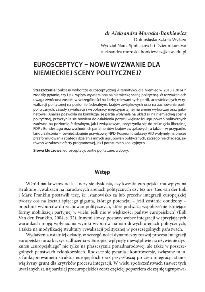 dr Aleksandra Moroska-Bonkiewicz Dolnośląska Szkoła Wyższa Wydział Nauk Społecznych i Dziennikarstwa [email protected] EUROSCEPTYCY – NOWE WYZWANIE DLA NIEMIECKIEJ SCENY POLITYCZNEJ? Streszczenie: Sukcesy wyborcze eurosceptycznej Alternatywy dla Niemiec w 2013 i 2014 r. zrodziły pytanie, czy i jaki wpływ wywiera ona na niemiecką scenę polityczną. W rozważaniach uwaga zwrócona została w szczególności na liczbę relewantnych partii, uczestniczących w rywalizacji politycznej na poziomie federalnym, krajów związkowych oraz na zachowania partii politycznych, zasady rywalizacji i współpracy międzypartyjnej na arenie wyborczej oraz gabinetowej. Analiza pozwoliła na konkluzję, że partia wpłynęła na układ sił na niemieckiej scenie politycznej, przyczyniła się bowiem do osłabienia pozycji większości ugrupowań politycznych zarówno na poziomie federalnym, jak i związkowym, przyczyniła się do zniknięcia liberalnej FDP z Bundestagu oraz wschodnich parlamentów krajów związkowych, a także – w przypadku landu Saksonia – również skrajnie prawicowej NPD. Pośrednio sukcesy AfD wpłynęły na proces przeformułowania strategii działania innych ugrupowań politycznych, szczególnie chadecji, zarówno w zakresie oferty programowej, jak i porozumień koalicyjnych. Słowa kluczowe: eurosceptycy, partie polityczne, wybory. Wstęp Wśród naukowców od lat toczy się dyskusja, czy kwestia europejska ma wpływ na strukturę rywalizacji na narodowych arenach politycznych czy też nie. Ces van der Eijk i Mark Franklin postawili tezę, że „stanowisko za lub przeciw integracji europejskiej tworzy coś na kształt śpiącego giganta, którego potencjał – jeśli zostanie obudzony – popchnie wyborców do zachowań politycznych, które podważą współcześnie istniejące formy mobilizacji partyjnej w wielu, jeśli nie w większości państw europejskich” (Eijk Van der, Franklin, 2004, s. 32). Innymi słowy, postawy wobec integracji w sprzyjających warunkach mogą wpłynąć na wyniki wyborów na narodowych arenach politycznych, a także na modyfikację struktury rywalizacji politycznej w poszczególnych państwach. Wydarzenia ostatniej dekady, w szczególności dynamiczny rozwój procesu integracji europejskiej oraz kryzys zadłużenia w Europie, wpłynęły niewątpliwie na ożywienie dyskursu „europejskiego” nie tylko na płaszczyźnie ponadnarodowej, ale także w poszczególnych państwach członkowskich. Rodzące się pytania i kontrowersje, związane m.in. z funkcjonowaniem struktur europejskich oraz przyszłością procesu integracji, stanowią żyzny grunt dla krytyków procesu integracji. W wielu społeczeństwach (nawet tych uważanych za najbardziej proeuropejskie) coraz częściej poparciem cieszą się ugrupowa- 106 Rocznik Bezpieczeństwa Międzynarodowego 2015, vol. 9, nr 1 nia kontestujące projekt integracji. Przykładem są sukcesy niemieckich eurosceptyków w wyborach do Bundestagu w 2013 r. oraz do Parlamentu Europejskiego i Parlamentów Landów Saksonii, Turyngii i Brandenburgii w 2014 r. Wyniki owych wyborów pokazały, że część społeczeństwa niemieckiego wyraźnie kontestuje przyjęty przez główne partie polityczne kurs w niemieckiej polityce europejskiej, co zaowocowało m.in. zaistnieniem na niemieckiej scenie politycznej nowej partii eurosceptycznej – Alternatywy dla Niemiec (Alternative für Deutschland – AfD). W tym kontekście, interesujące wydaje się pytanie, czy i jaki wpływ na niemicką scenę polityczną wywierają obecnie partie eurosceptyczne, a w szczególności – nowo powstała AfD. W rozważaniach uwaga zwrócona będzie na system partyjny – wpływ eurosceptyków na liczbę relewantnych partii uczestniczących w rywalizacji politycznej na poziomie federalnym oraz krajów związkowych oraz na zachowania partii politycznych, zasady rywalizacji i współpracy międzypartyjnej na arenie wyborczej oraz gabinetowej. Postawy wobec integracji europejskiej oraz ich wpływ na system partyjny Stanowisko wobec integracji europejskiej, w tym pozycje eurosceptyczne, zdeterminowane są specyficznymi dla każdego państwa czynnikami społeczno-politycznymi. Odmienność owych uwarunkowań powoduje, że niezmiernie trudno jest stworzyć jedną definicję eurosceptycyzmu. Próbę stworzenia uniwersalnej klasyfikacji postaw wobec integracji podjęli w swoich badaniach m.in. Taggart i Szczerbiak (2003), Kopecký i Mudde (2002), Flood (2002), Zuba (2006), Lubbers i Scheepers (2004). Teoria badań w tym zakresie znajduje się jednak wciąż w fazie rozwoju. W obliczu dynamicznie zmieniającego się procesu integracji europejskiej podlega przewartościowaniom, tym samym ewoluuje. Stąd też nierzadko spotkać się można z krytyką i/lub korektą proponowanych ujęć. Typologia, która będzie podstawą analizy w niniejszym artykule, opiera się na koncepcji „twardego” i „miękkiego” eurosceptycyzmu Taggarta i Szczerbiaka. Została ona zmodyfikowana i uzupełniona, przyjmując tym samym nową jakość (patrz: Moroska, 2010). Kluczowy dla nowej typologii jest podział pomiędzy eurosceptycyzmem a euroentuzjazmem, który opiera się na rozróżnieniu pomiędzy postawą akceptującą co najwyżej istniejący w danym momencie stan integracji europejskiej określany jako status quo, a taką, która jest zgodą na dalszy planowany rozwój integracji europejskiej. Obie postawy dzielić się mogą, w zależności od natężenia, na bardziej umiarkowane i radykalne, czyli miękkie i twarde (patrz: ryc.1). Zwolennicy integracji europejskiej Przeciwnicy integracji europejskiej Euroentuzjazm twardy Eurosceptycyzm miękki Ryc. 1. Typologia postaw wobec integracji europejskiej. Źródło: opracowanie własne. miękki twardy Artykuły 107 Twardy eurosceptycyzm określa postawy zasadniczej opozycji wobec projektu integracji europejskiej, polegającego na sukcesywnym przenoszeniu kompetencji państwowych na rzecz instytucji pona
