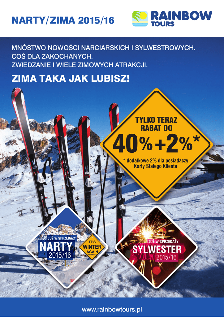 NARTY/ZIMA 2015/16 MNÓSTWO NOWOŚCI NARCIARSKICH I SYLWESTROWYCH. COŚ DLA ZAKOCHANYCH. ZWIEDZANIE I WIELE ZIMOWYCH ATRAKCJI. ZIMA TAKA JAK LUBISZ! TYLKO TERAZ RABAT DO 40%+2%* * dodatkowe 2% dla posiadaczy Karty Stałego Klienta JUŻ W SPRZEDAŻY NARTY 2015/16 JUŻ W SPRZEDAŻY SYLWESTER 2015/16 www.rainbowtours.pl NARTY/ZIMA 2015/16 GWARANCJE • Ubezpieczenie od kosztów rezygnacji TU EUROPA S.A. Ochrona na wypadek rezygnacji z uczestnictwa w imprezie z przyczyn niezależnych od uczestnika. Do 21.09.2015 – gratis! • Gwarancja najniższej ceny Ceny w promocji będą najniższe, jeśli będzie inaczej zwrócimy różnicę. Gwarancja nie dotyczy ofert last minute. Gwarancja obowiązuje do 21.09.2015. • Gwarancja niezmiennej ceny Nie obejmą Państwa ewentualne podwyżki cen, wynikające ze zmiany opłat lub kosztów paliw. Do 21.09.2015 – Gwarancja gratis! • Gwarancja zmiany rezerwacji Jeśli będziecie Państwo chcieli zmienić termin i rodzaj wyjazdu, kierunek, lub hotel, nie poniesiecie Państwo z tego tytułu kosztów, nawet do 45 dni przed wyjazdem. Za zmianę nie pobierzemy opłat według warunków uczestnictwa, a cena zostanie przeliczona zgodnie z rabatem z dnia zakupu, w miarę dostępności miejsc w hotelach, na programach objazdowych i samolotach. Jeśli nowa impreza będzie droższa, należy dopłacić różnicę wynikającą z wyliczenia ceny, jeśli będzie tańsza zwrócimy różnicę. Proszę zwrócić uwagę, że zachowany rabat nie może być wyższy niż najwyższy rabat obowiązujący na daną imprezę i dany termin w dniu dokonania rezerwacji. Z gwarancji można skorzystać tylko raz. Do 21.09.2015 – Gwarancja gratis! WARUNKI PROMOCJI 1. Promocja dotyczy wszystkich imprez zawartych w katalogu Narty /Zima 2015/16 2. Warunkiem udziału w promocji jest wpłata 20% zaliczki. Pozostałe kwoty płatne wg Ogólnych Warunków Uczestnictwa, tj. najpóźniej 30 dni przed terminem wyjazdu. 3. Ilość miejsc promocyjnych jest ograniczona. Promocja może zostać wstrzymana lub zmniejszona na wszystkie lub niektóre terminy wylotów/wyjazdów albo imprezy. Promocji nie można łączyć z innymi promocjami i ofertami last minute. 4. Powyżej podano maksymalne obowiązujące rabaty. Rabaty mogą różnić się dla poszczególnych kierunków lub hoteli. Informacja o aktualnych cenach w biurach podróży i na www.rainbowtours.pl. 5. Rabat promocyjny przysługuje od całkowitej wartości wycieczki. 6. Ubezpieczenie od kosztów rezygnacji TU EUROPA S.A. Gratis do 21.09.2015 7. Gwarancja niezmiennej ceny – do 21.09.2015 gratis! 8. Gwarancja najniższej ceny – ceny w promocji będą najniższe, jeśli będzie inaczej zwrócimy różnicę! Gwarancja nie dotyczy ofert last minute. Gwarancja obowiązuje do 21.09.2015. 9. Gwarancja bezpłatnej zmiany rezerwacji – do 21.09.2015 gratis! 10. Promocja dotyczy tylko rezerwacji indywidualnych. Nie dotyczy zamówień grupowych (od 21 osób) - w przypadku grup cena ustalana jest odrębnie i może być wyższa. Zamówień grupowych nie dotyczą również gwarancje: zwrotu kosztów, niezmiennej ceny, najniższej ceny i bezpłatnej zmiany terminu. W przypadku zamówień grupowych cena musi być każdorazowo uzgodniona z Działem Rezerwacji Grupowych, mail: [email protected] 11. Klientom posiadającym Kartę Stałego Klienta przysługuje dodatkowe 2% rabatu liczonego od całkowitej wartości imprezy. www.rainbowtours.pl