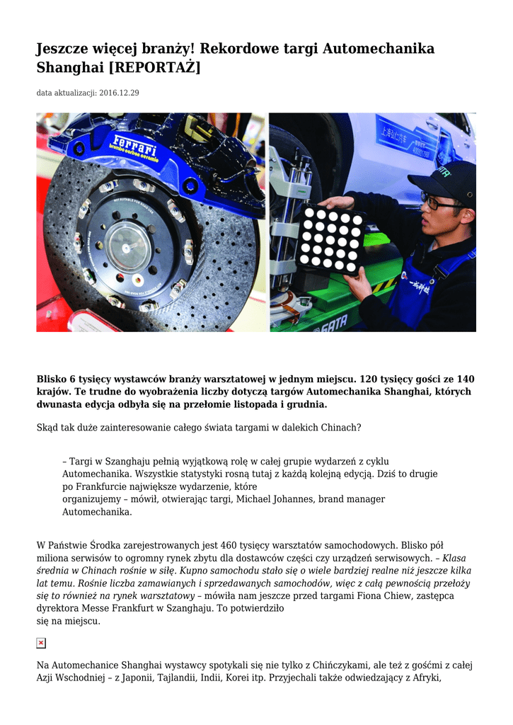 Jeszcze więcej branży! Rekordowe targi Automechanika Shanghai [REPORTAŻ] data aktualizacji: 2016.12.29 Blisko 6 tysięcy wystawców branży warsztatowej w jednym miejscu. 120 tysięcy gości ze 140 krajów. Te trudne do wyobrażenia liczby dotyczą targów Automechanika Shanghai, których dwunasta edycja odbyła się na przełomie listopada i grudnia. Skąd tak duże zainteresowanie całego świata targami w dalekich Chinach? – Targi w Szanghaju pełnią wyjątkową rolę w całej grupie wydarzeń z cyklu Automechanika. Wszystkie statystyki rosną tutaj z każdą kolejną edycją. Dziś to drugie po Frankfurcie największe wydarzenie, które organizujemy – mówił, otwierając targi, Michael Johannes, brand manager Automechanika. W Państwie Środka zarejestrowanych jest 460 tysięcy warsztatów samochodowych. Blisko pół miliona serwisów to ogromny rynek zbytu dla dostawców części czy urządzeń serwisowych. – Klasa średnia w Chinach rośnie w siłę. Kupno samochodu stało się o wiele bardziej realne niż jeszcze kilka lat temu. Rośnie liczba zamawianych i sprzedawanych samochodów, więc z całą pewnością przełoży się to również na rynek warsztatowy – mówiła nam jeszcze przed targami Fiona Chiew, zastępca dyrektora Messe Frankfurt w Szanghaju. To potwierdziło się na miejscu. Na Automechanice Shanghai wystawcy spotykali się nie tylko z Chińczykami, ale też z gośćmi z całej Azji Wschodniej – z Japonii, Tajlandii, Indii, Korei itp. Przyjechali także odwiedzający z Afryki, Australii i obu Ameryk. Natomiast z polskiego punktu widzenia ważna jest obustronna otwartość na współpracę, która była szczególnie widoczna po czerwcowej wizycie w Polsce prezydenta Chin Xi Jinpinga. Nasi rodzimi wystawcy wrócili z tej dalekiej wyprawy zadowoleni. Rekordowe statystyki To była dwunasta edycja targów, które po raz drugi odbyły się w nowym miejscu – National Exhibition and Convention Center w Szanghaju. Targi zdecydowanie rozwijają się i z roku na rok wzmacniają swoją pozycję. Powierzchnia wystawiennicza wzrosła o 12% w porównaniu z 2015 rokiem: z 280 000 do 312 000 metrów kwadratowych. Otworzono dwie nowe hale (łącznie funkcjonowało 13 pawilonów). Na targach wystawiło się 5756 firm z 42 krajów (o 7% więcej niż w 2015 r.) – pod tym kątem targi w Szanghaju są większe nawet od targów we Frankfurcie. Wydarzenie odwiedziło 120 tysięcy osób ze 140 krajów. – Liczba odwiedzających Automechanikę Shanghai to na pewno efekt promocyjnych działań organizatorów. Materiały reklamowe były tłumaczone na większą liczbę języków obcych. W ten sposób w wydarzeniu brały udział także delegacje ze Szwecji, Birmy oraz Brazylii, które pojawiły się na targach po raz pierwszy. Promocja miała również szerszy zasięg lokalnie i zaowocowała większą liczbą przedstawicieli branży techniki motoryzacyjnej z samych Chin – komentuje Piotr Łukaszewicz z polskiego przedstawicielstwa Targów Frankfurt. Wystawcy podkreślali wysoki poziom merytoryczny rozmów z odwiedzającymi, a także ich chęć do konkretnych działań. Program wydarzeń towarzyszących targom w Szanghaju również był rekordowo bogaty. Odbyło się łącznie aż 56 wydarzeń – konferencji, warsztatów, seminariów itp. Poza znanymi już gościom targów grupami tematycznymi, takimi jak części zamienne czy wyposażenie warsztatów samochodowych, w Szanghaju organizatorzy stworzyli nowe kategorie. Były to m.in. Wheels & Rims (koła i felgi), ale największą przestrzeń oraz zainteresowanie gości zajęły nowoczesne technologie. – Strefa „Łączność” to szereg najnowszych trendów w zakresie komunikacji, alternatywnych źródeł zasilania pojazdów, automatycznego kierowania, usług mobilnych – wyjaśniał brand manager Automechanika M. Johannes. W Szanghaju wystawili się najwięksi gracze branży warsztatowej. Byli wśród nich: BorgWarner, Bosch, China Changan, Continental Automotive, Denso, Federal Mogul, Hella, Hitachi, Mahle, Naveco, Schaeffler, Tenneco, ZF, Bantam, Baturu, Beissbarth, Bright Technology, Dali, EAE Automotive, FIX Auto, FYTECH, Launch, Pro-max, RAV, Sankyo, Sata, SK, Snap-on, Tech, Wonder, Zonyi, Basf, Botny, Bullsone, Castrol, Chief, Cyclon, Dcenti, Djcorp, Eurolub, ITW, Liqui Moly, MA-FRA, Motel, Osram, Pennzoil, Ravenol, Sonax, Thule oraz Valvoline. Targi z polskim udziałem Ważnym elementem targów Automechanika są pawilony krajowe. Wśród 18 pawilonów pojawiły się dwa nowe – z Indonezji i Maroka. Już po raz kolejny na targach funkcjonował pawilon polski. Dzięki wsparciu Wydziału Promocji Handlu i Inwestycji Konsulatu Generalnego RP w Szanghaju wystawcy mieli wsparcie tłumaczy operujących językami polskim, angielskim i chińskim. Konsulat zapraszał też na polskie stoiska przedstawicieli chińskiej branży motoryzacyjnej. Spośród polskich firm branży warsztatowej na udział w targach w Szanghaju zdecydowały się Cimat – producent wyważarek, WAŚ – producent lamp i urządzeń odblaskowych, Tip-Topol – producent membran do zawieszeń pneumatycznych samochodów ciężarowych i autobusów oraz Sena – dostawca akcesoriów motoryzacyjnych (m.in. zapachów, pokrowców, kołpaków, dywaników) oraz dziecięcych fotelików samochodowych. Natomiast dzięki uprzejmości konsulatu RP w Szanghaju, przy wsparciu naszego Ministerstwa Rozwoju, swoją ofertę przedstawiły także firmy Elix i Lotos oraz Wałbrzyska Specjalna Strefa Ekonomiczna. Tip-Topol wziął udział w targach w Szanghaju po raz trzeci. – Oczywiście dla nas celem tych targów są nie tylko Chiny, ale cały region. Mamy już klientów w Malezji, Japonii, Tajlandii i tutaj spotykamy się z nimi. Rynek azjatycki ma w sobie ogromny potencjał, dlatego liczymy na znalezienie kolejnych partnerów – mówił nam w Szanghaju Przemysław Szumiłowski, dyrektor handlowy firmy. Dodał, że ważnym rynkiem jest też Australia. Branżowcy z teg