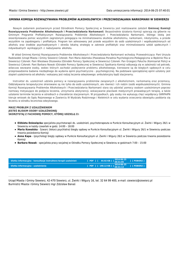 Miasto i Gmina Siewierz - http://www.siewierz.pl/ Data umieszczenia informacji: 2014-06-25 07:40:01 GMINNA KOMISJA ROZWIĄZYWANIA PROBLEMÓW ALKOHOLOWYCH I PRZECIWDZIAŁANIA NARKOMANII W SIEWIERZU Nowym zadaniem postawionym przed Ośrodkiem Pomocy Społecznej w Siewierzu jest realizowanie założeń Gminnej Komisji Rozwiązywania Problemów Alkoholowych i Przeciwdziałania Narkomanii. Bezpośrednie działania Komisji opierają się głównie na Gminnym Programie Profilaktycznym Rozwiązywania Problemów Alkoholowych i Przeciwdziałania Narkomanii, którego istotą jest skoordynowana pomoc wszystkim zagrożonym polegająca na minimalizowaniu skutków alkoholizmu, narkomanii, nikotynizmu, a przede wszystkim na zapobieganiu i profilaktyce. Program ten adresowany jest przede wszystkim do osób uzależnionych i współuzależnionych od alkoholu oraz środków psychoaktywnych i określa lokalną strategię w zakresie profilaktyki oraz minimalizowania szkód społecznych i indywidualnych wynikających z nadużywania alkoholu. W skład Gminnej Komisji Rozwiązywania Problemów Alkoholowych i Przeciwdziałania Narkomanii wchodzą: Przewodnicząca: Pani Urszula Radziwołek (Urząd Miasta i Gminy Siewierz) Członek: Pani Maria Adamska (Powiatowa Poradnia Psychologiczno-Pedagogiczna w Będzinie filia w Siewierzu) Członek: Pani Wiesława Olszewska (Ośrodek Pomocy Społecznej w Siewierzu) Członek: Pan Grzegorz Pałucha (Komisariat Policji w Siewierzu) Członek: Pani Barbara Nowak (Ośrodek Pomocy Społecznej w Siewierzu) Spotkania Komisji odbywają się w zależności od potrzeb, wówczas wezwane osoby, wobec których zachodzi podejrzenie problemu alkoholowego, kierowane są do biegłych sądowych w celu przeprowadzenia badania niezbędnego do wydania opinii psychiatryczno - psychologicznej. Na podstawie sporządzonej opinii ustalony jest stopień uzależnienia od alkoholu i wskazany jest rodzaj leczenia odwykowego: ambulatoryjny bądź stacjonarny. Instruktor ds. uzależnień udziela pomocy w rozwiązywaniu problemów związanych z alkoholizmem, narkomanią oraz przemocą. Oddziaływania terapeutyczne skierowane są nie tylko do osób uzależnionych, ale również i ich rodzin (osób współuzależnionych). Gminna Komisji Rozwiązywania Problemów Alkoholowych i Przeciwdziałania Narkomanii stara się udzielać pomocy osobom uzależnionym poprzez rozmowy motywujące do podjęcia leczenia, utrzymania abstynencji, wskazywanie placówek medycznych prowadzących terapię, a także ustalanie terminów leczenia w ośrodkach o charakterze stacjonarnym. W przypadkach, gdy osoby nie wykazują chęci współpracy GKRPAiPN kieruje wniosek do Sądu Rejonowego w Zawierciu III Wydziału Rodzinnego i Nieletnich w celu wydania orzeczenia obowiązku poddania się leczeniu w ośrodku lecznictwa odwykowego. MASZ PROBLEM Z UZALEŻNIENIEM JESTEŚ BLISKIM OSOBY UZALEŻNIONEJ SKORZYSTAJ Z FACHOWEJ POMOCY, KTÓREJ UDZIELĄ CI: Elżbieta Dziewięcka specjalista psychotarapii ds. uzależnień, psychoterapeuta w Punkcie Konsultacyjnym ul. Żwirki i Wigury 26/1 w Siewierzu w każdy czwartek w godz. 14:00 – 18:00 Maria Kowalska - Szwarc (lekarz psychiatra) biegły sądowy w Punkcie Konsultacyjnym ul. Żwirki i Wigury 26/1 w Siewierzu podczas trwania posiedzenia Komisji Anna Kapa - (psycholog) biegły sądowy w Punkcie Konsultacyjnym ul. Żwirki i Wigury 26/1 w Siewierzu podczas trwania posiedzenia Komisji Barbara Nowak - specjalista pracy socjalnej w Ośrodku Pomocy Społecznej w Siewierzu w godzinach 7:00 – 15:00 Ulotka informacyjna - konsultacje instruktora terapii uzależnień Ulotka informacyjna - uzależnienia 2014-06-25 08:41:05 2014-06-25 [ PDF ] [ 190.12 KB ] [ 08:41:13 [ PDF ] [ 44.92 KB ] [ ] [ POBIERZ ] ] [ POBIERZ ] Urząd Miasta i Gminy Siewierz, 42-470 Siewierz, ul. Żwirki i WIgury 16, tel. 32 64 99 400, e-mail: [email protected] Burmistrz Miasta i Gminy Siewierz mgr Zdzisław Banaś