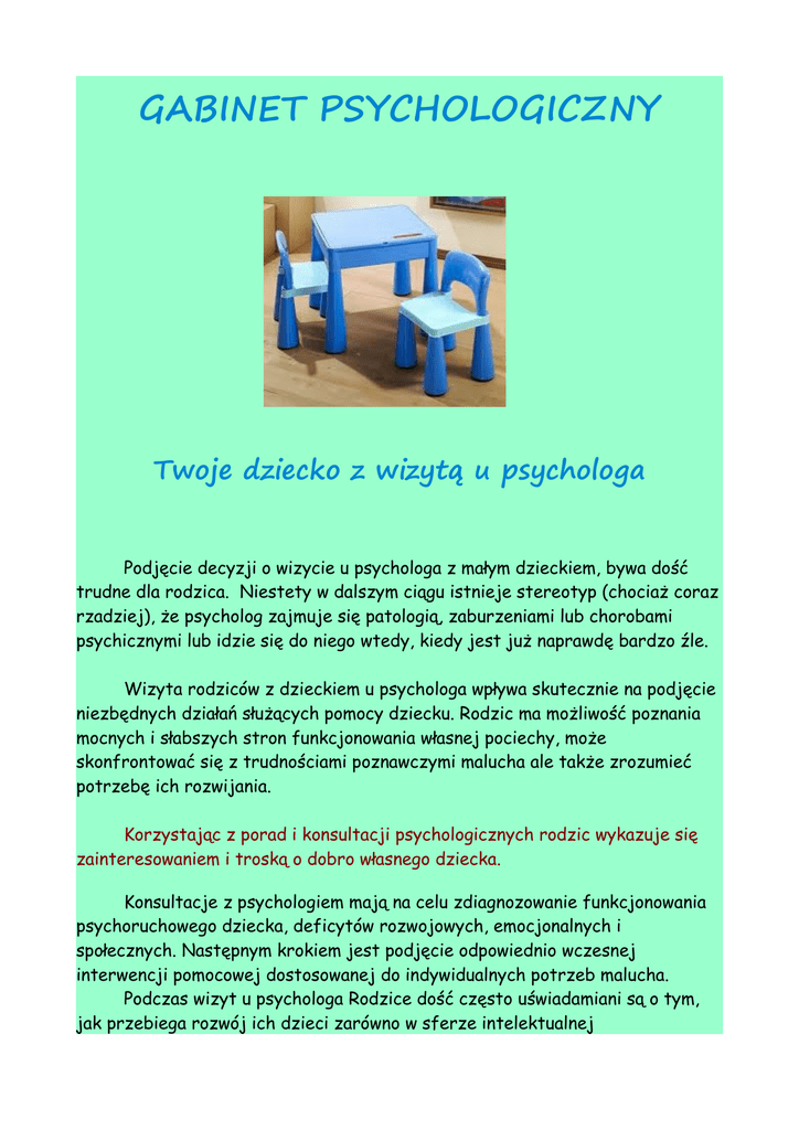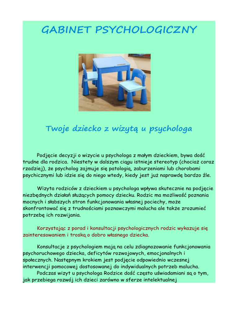 GABINET PSYCHOLOGICZNY Twoje dziecko z wizytą u psychologa Podjęcie decyzji o wizycie u psychologa z małym dzieckiem, bywa dość trudne dla rodzica. Niestety w dalszym ciągu istnieje stereotyp (chociaż coraz rzadziej), że psycholog zajmuje się patologią, zaburzeniami lub chorobami psychicznymi lub idzie się do niego wtedy, kiedy jest już naprawdę bardzo źle. Wizyta rodziców z dzieckiem u psychologa wpływa skutecznie na podjęcie niezbędnych działań służących pomocy dziecku. Rodzic ma możliwość poznania mocnych i słabszych stron funkcjonowania własnej pociechy, może skonfrontować się z trudnościami poznawczymi malucha ale także zrozumieć potrzebę ich rozwijania. Korzystając z porad i konsultacji psychologicznych rodzic wykazuje się zainteresowaniem i troską o dobro własnego dziecka. Konsultacje z psychologiem mają na celu zdiagnozowanie funkcjonowania psychoruchowego dziecka, deficytów rozwojowych, emocjonalnych i społecznych. Następnym krokiem jest podjęcie odpowiednio wczesnej interwencji pomocowej dostosowanej do indywidualnych potrzeb malucha. Podczas wizyt u psychologa Rodzice dość często uświadamiani są o tym, jak przebiega rozwój ich dzieci zarówno w sferze intelektualnej jak i emocjonalno-społecznej. Głównym i podstawowym celem każdego psychologa jest udzielenie rzetelnej informacji o zachowaniu dziecka (mimo, że czasem bywa ona odmienna od spostrzeżeń Rodziców w ich środowisku rodzinnym) pomocy oraz wskazań do dalszej terapii i wspomagania dziecka. Rodzice zastanawiają się często jak można zbadać malucha, który jeszcze nie mówi pełnymi zdaniami, komunikuje się gestami, jak rozpoznać jego prawidłowość funkcjonowania. W zależności od wieku dziecka psycholog dobiera odpowiednie narzędzia badawcze: test, rysunek, wywiad, obserwację. Podstawowym celem badania dziecka jest zazwyczaj Ocena Rozwoju Psychoruchowego. Do tego przeznaczona jest między innymi Dziecięca Skala Rozwojowa (DSR). Składa się ze Skali Obserwacyjnej i Skali Wykonaniowej. Skala Wykonaniowa służy do oceny takich funkcji jak: pamięć, percepcja, mowa, motoryka, zachowania społeczne, manipulacja. Skala Obserwacyjna służy do oceny funkcjonowania dziecka. DSR przeznaczona jest do badania dzieci już od 2 miesiąca życia do 3 lat. Innym testem, który przeznaczony jest do badania rozwoju dzieci od 3 miesiąca życia do 5 lat, jest Skala Rozwoju Psychomotorycznego Brunet-Lezine. Skala podzielona jest na cztery sfery: lokomocję i kontrolę postawy; koordynację wzrokowo-ruchową; mowę; kontakty społeczne. Konstrukcja skali umożliwia zarówno określenie wieku rozwoju w każdej z tych sfer osobno, wykreślenie profilu rozwoju, obliczenie cząstkowego ilorazu rozwoju oraz pełnego ilorazu inteligencji. Bardzo ważnym i często badanym przez psychologa obszarem rozwoju dziecka, jest sfera emocjonalna oraz jego emocjonalne reakcje. Stan emocjonalny często odzwierciedla relacje rodzinne; do badania emocji używane są Testy Projekcyjne. Polegają na nadawaniu przez dziecko znaczeń oraz fantazji wieloznacznemu materiałowi. Ujawniają cechy osobowości, stan psychiczny, lęki, traumy. Dziecko dostaje białą kartkę, na której ma narysować rodzinę ( rysuje na bazie swoich fantazji), wielkość postaci będzie zróżnicowana, dziecko będzie wybierać kolory, rysować silną kreską i słabszą. Może zapomnieć dorysować pewnej części ciała lub pominąć zupełnie jakąś postać. W rysunkach dowolnych mniejszych dzieci, psycholog zwraca uwagę na kolor kredki, którą dziecko rysuje oraz siłę nacisku kredki. Może dopytać co przedstawia rysunek. Innym testem projekcyjnym jest Test Apercepcji Tematycznej dla dzieci od 3r.ż do 10 lat (CAT). Badanie polega na pokazywaniu dziecku serii obrazków i zachęcaniu go do opowiadania związanych z nimi historyjek, które w danym momencie przychodzą maluchowi do głowy. Równie ważnym narzędziem badawczym w rękach psychologa jest Wywiad. Przeprowadza się go zazwyczaj na pierwszym spotkaniu z rodzicami lub opiekunami prawnymi dziecka. Dotyczy wielu sfer funkcjonowania, środowiska rodzinnego, struktury rodziny, form spędzania czasu wolnego, zabaw z rodzicami, systemu wychowawczego, oraz funkcjonowania poznawczego dziecka. W środowisku żłobkowym, psycholog codziennie przebywa z dziećmi w grupie rówieśniczej, jest on w stanie zaobserwować dość dokładnie zachowania dziecka w różnych sytuacjach społecznych, samoobsługi, wychowawczych i edukacyjnych. Bawiąc się bezpośrednio z dzieckiem, może zwrócić uwagę na stan psychiczny i emocjonalny, umiejętność i stopień nawiązywania interakcji z pozostałymi dziećmi jak również opiekunami, osobami dorosłymi. Reakcje na nowe bodźce-np. kiedy placówkę odwiedzają goście. Sposoby zabawy oraz ulubione formy pracy, umiejętność manipulacji, piętrzenia, segregowania, budowania. Również aktywność poznawczą, ruchową i muzyczną. Psycholog obserwuje dziecko podczas pokonywania trudności, sytuacji rywalizacji, zabawy tematycznej, funkcjonowania według ustalonych zasad i reguł placówki. Może przekazać rodzicowi bogatą wiedzę o funkcjonowaniu ich malucha w licznej grupie rówieśniczej, jak dziecko zachowuje się podczas zabaw dowolnych i zorganizowanych. Psycholog jest w stanie podać trafne wskazówki wychowawcze, psychoedukacyjne, terapeutyczne, pokierować do innych specjalistów oraz specjalistycznych placówek wspomagających wczesny rozwój dziecka. Zebranie informacji ze wszystkich opisanych źródeł da rzetelną opinię na temat aktualnego rozwoju psychoruchowego dziecka, umożliwi dalsze, skuteczne pokierowanie dzieckiem. Rodzice zgłaszający się z dzieckiem do psychologa mogą być spokojni o poufność informacji, jakie uzyska od nich specjalista, bowiem każdego psychologa obowiązuje tajemnica zawodowa. Opracowanie psycholog MZŻ mgr Małgorzata Trautman