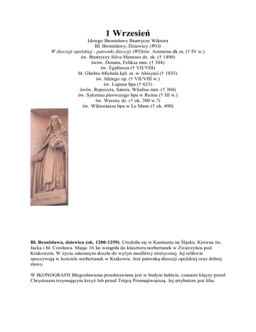 1 Wrzesień Idziego Bronisławy Beatrycze Wiktora Bł. Bronisławy, Dziewicy (WO) W diecezji opolskiej - patronki diecezji (WO)św. Ammona dk m. († IV w.) św. Beatryczy Silva Meneses dz. zk. († 1490) śwśw. Donata, Feliksa mm. († 304) św. Egidiusza († VII/VIII) bł. Ghebre-Michała kpł. m. w Abisynii († 1855) św. Idziego op. († VII/VIII w.) św. Lupusa bpa († 623) śwśw. Repozyta, Satora, Witalisa mm. († 304) św. Sykstusa pierwszego bpa w Reims († III w.) św. Wereny dz. († ok. 300 w.?) św. Wiktoriusza bpa w Le Mans († ok. 490) Bł. Bronisława, dziewica (ok. 1200-1259). Urodziła się w Kamieniu na Śląsku. Krewna św. Jacka i bł. Czesława. Mając 16 lat wstąpiła do klasztoru norbertanek w Zwierzyńcu pod Krakowem. W życiu zakonnym doszła do wyżyn modlitwy mistycznej. Jej relikwie spoczywają w kościele norbertanek w Krakowie. Jest patronką diecezji opolskiej oraz dobrej stawy. W IKONOGRAFII Błogosławiona przedstawiana jest w białym habicie, czasami klęczy przed Chrystusem trzymającym krzyż lub przed Trójcą Przenajświętszą. Jej atrybutem jest lilia. 2 Wrzesień Wilhelma Stefana Juliana Bohdana Salomona Brygidy Ingrydy Bł. Bronisławy, Dziewicy W archidiecezji warmińskiej (WO) Św. Wilhelma biskupa († ok. 1075) św. Zenona z Nikomedii m. († III w.?) św. Antonina m. († IV w.) śwśw. Aleksandra Lanfant zk., Apolinarego Morel zk., Franciszka-Józefa bpa, PiotraLudwika de la Rochefoucauld bpa, Jakuba Bonnaud zk., Jana Franciszka Bourtez zk., Jana-Marii du Lau bpa, Seweryna Giraud zk., Wilhelma Delfaud zk. mm. podczas Rewolucji Francuskiej († 1792) św. Elpidiusza bpa z Lyonu († V w.) bł. Ingryd dz. zk. († 1282) św. Nonnoza op. († VI w.) bł. Salomona m. († 1792) Św. Wilhelm, biskup (+ok. 1075). Pochodził prawdopodobnie z Anglii. Był nadwornym kapelanem króla Kanuta Wielkiego (1016-1035). Wraz z nim odbył podróż do Danii. Zastał tam ogromne zacofanie i mocno ugruntowane pogaństwo. Postanowił więc tam osiąść, podejmując wysiłek misyjny. Dzięki rekomendacji Kanuta został biskupem w Roskilde. Wilhelm znalazł się w trudnej sytuacji. Sukcesor Kanuta, Swen, znany był z wielu wystąpień przeciwko chrześcijanom. Doprowadził m.in. do zamordowania wielu ludzi, nie zapewniając im należnego procesu. Wyrok wykonano w jednym z kościołów. Wilhelm, narażając się wtedy królowi, oświadczył, że kto przelewa krew w miejscu świętym, nie może przystępować do sakramentów dopóki nie odbędzie publicznej pokuty. Król, otoczony przez uzbrojonych strażników, przyszedł do katedry biskupa Wilhelma. Nieuzbrojony biskup zagrodził mu wejście do kościoła. Gdy strażnicy króla wyciągnęli miecze, Wilhelm nadstawił głowę, gotowy poświęcić swe życie w obronie wiary. Ujrzawszy to, król poprosił o przebaczenie. Od tej pory Wilhelm został jego doradcą. Swen umarł jako pierwszy. Jego ciało pierwotnie złożono w Ringsted, następnie jednak przeniesiono do katedry w Roskilde. Święty Wilhelm wyszedł naprzeciw pochodowi żałobnemu i ujrzawszy trumnę z ciałem króla, sam osunął się na ziemię i zmarł. Ciała obu pochowano w katedrze w Roskilde. 3 Wrzesień Grzegorza Izabeli Marinusa Przybysława Eufemii Karinusa Doroty Feby Remakla Szymona Św. Grzegorza Wielkiego, Papieża i Doktora Kościoła (WO) św. Auksana bpa w Mediolanie († 559) św. Bazylissy dz. m. († pocz. IV w.) św. Feby († I w.) bł. Gauli bpa w Brescii († 1244) św. Mansweta bpa w Toul († IV w.) św. Marinusa ps. († IV w.) św. Remakla bpa († 675) Św. Grzegorz i Wielki, papież, doktor Kościoła (540604). Na Wschodzie czczony jako Grzegorz Dialogos. Urodził się w rodzinie rzymskich patrycjuszów. Jego rodzice, św. Gordian i św. Sylwia, doznają chwały ołtarzy. Będąc prefektem miasta, nie mogąc pogodzić służby Bogu i światu, porzucił karierę i we własnym domu założył klasztor dla dwunastu towarzyszy (575) oraz sześć innych klasztorów w swoich dobrach na Sycylii. W cztery lata później papież Pelagiusz II udzielił mu święceń diakonatu i jako swego przedstawiciela wystał do Konstantynopola (578-586). Wykazał duże umiejętności dyplomatyczne. Powróciwszy do Rzymu prowadził nadal życie zakonne. Po śmierci papieża został wybrany na stolicę Piotrową 3 września 590 roku. Jego pontyfikat trwał 15 lat. Był to burzliwy okres wędrówki ludów. Grzegorz i pozyskał dla Kościoła Wizygotów w Hiszpanii, ariańskich Longobardów, Gallów oraz brytyjskich Anglosasów. Historia nazwala go "apostołem ludów barbarzyńskich". On zaś określił siebie: "servus servorum Dei" "sługa sług Bożych". Grzegorz odnowił życie kościelne, zreformował i ujednolicił liturgię i śpiew kościelny Od jego pontyfikatu pochodzi zwyczaj odprawiania 30 Mszy świętych za zmarłych zwanych "gregoriańskimi". Pozostawił po sobie bogatą spuściznę literacką, która wywarła poważny wpływ na kształtowanie się myśli chrześcijańskiego Zachodu, zwłaszcza w zakresie duchowości i prawodawstwa. Należy do czterech wielkich doktorów Kościoła Zachodniego. Jest patronem m. in. uczniów, studentów, nauczycieli, chórów szkolnych, piosenkarzy, muzyków. Gdy Rzym nawiedziła w 590 roku zaraza, Grzegorz zarządził pokutną procesję dla odwrócenia klęski. Podczas niej nad mauzoleum Hadriana zobaczył anioła chowającego wyciągnięty skrwawiony miecz. Wizję te zrozumiano jako koniec plagi. Utrwalono ją artystycznie. Do dnia dzisiejszego nad tym mauzoleum Hadriana, zwanym Zamkiem Św. Anioła, dominuje ogromny posąg anioła ze wzniesionym mieczem. W IKONOGRAFII św. Grzegorz Wielki przedstawiany jest jako mężczyzna w starszym wieku, w papieskim stroju liturgicznym, w tiarze. Czasami podczas pisania dzieła. Nad księgą lub nad jego głową unosi się Duch Święty w postaci gołębicy, inspirując Świętego. Jego atrybutami są: anioł, trzy krwawiące hostie, krzyż pontyfikalny, m