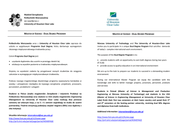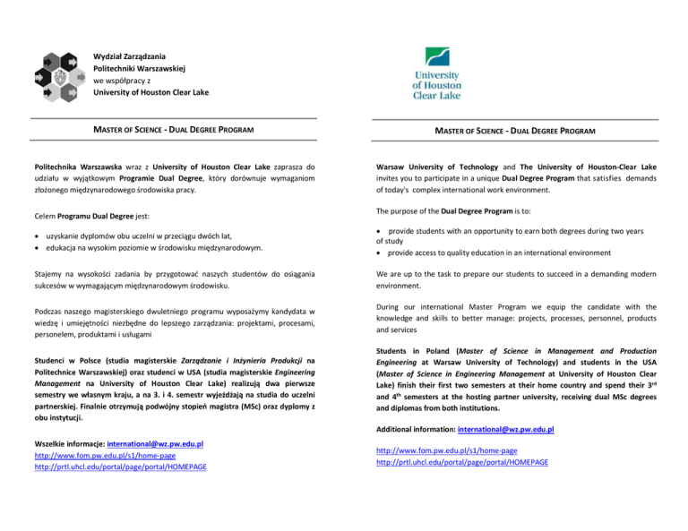 Wydział Zarządzania Politechniki Warszawskiej we współpracy z University of Houston Clear Lake MASTER OF SCIENCE ‐ DUAL DEGREE PROGRAM MASTER OF SCIENCE ‐ DUAL DEGREE PROGRAM Politechnika Warszawska wraz z University of Houston Clear Lake zaprasza do udziału w wyjątkowym Programie Dual Degree, który dorównuje wymaganiom złożonego międzynarodowego środowiska pracy. Warsaw University of Technology and The University of Houston‐Clear Lake invites you to participate in a unique Dual Degree Program that satisfies demands of today's complex international work environment. Celem Programu Dual Degree jest: uzyskanie dyplomów obu uczelni w przeciągu dwóch lat, edukacja na wysokim poziomie w środowisku międzynarodowym. The purpose of the Dual Degree Program is to: provide students with an opportunity to earn both degrees during two years of study provide access to quality education in an international environment Stajemy na wysokości zadania by przygotować naszych studentów do osiągania sukcesów w wymagającym międzynarodowym środowisku. We are up to the task to prepare our students to succeed in a demanding modern environment. Podczas naszego magisterskiego dwuletniego programu wyposażymy kandydata w wiedzę i umiejętności niezbędne do lepszego zarządzania: projektami, procesami, personelem, produktami i usługami Studenci w Polsce (studia magisterskie Zarządzanie i Inżynieria Produkcji na Politechnice Warszawskiej) oraz studenci w USA (studia magisterskie Engineering Management na University of Houston Clear Lake) realizują dwa pierwsze semestry we własnym kraju, a na 3. i 4. semestr wyjeżdżają na studia do uczelni partnerskiej. Finalnie otrzymują podwójny stopień magistra (MSc) oraz dyplomy z obu instytucji. During our international Master Program we equip the candidate with the knowledge and skills to better manage: projects, processes, personnel, products and services Students in Poland (Master of Science in Management and Production Engineering at Warsaw University of Technology) and students in the USA (Master of Science in Engineering Management at University of Houston Clear Lake) finish their first two semesters at their home country and spend their 3rd and 4th semesters at the hosting partner university, receiving dual MSc degrees and diplomas from both institutions. Additional information: [email protected] Wszelkie informacje: [email protected] http://www.fom.pw.edu.pl/s1/home‐page http://prtl.uhcl.edu/portal/page/portal/HOMEPAGE http://www.fom.pw.edu.pl/s1/home‐page http://prtl.uhcl.edu/portal/page/portal/HOMEPAGE