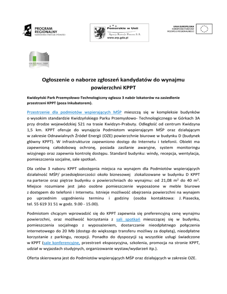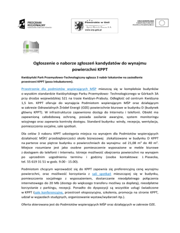 Ogłoszenie o naborze zgłoszeń kandydatów do wynajmu powierzchni KPPT Kwidzyński Park Przemysłowo-Technologiczny ogłasza 3 nabór lokatorów na zasiedlenie przestrzeni KPPT (poza Inkubatorem). Przestrzenie dla podmiotów wspierających MŚP mieszczą się w kompleksie budynków o wysokim standardzie Kwidzyńskiego Parku Przemysłowo- Technologicznego w Górkach 3A przy drodze wojewódzkiej 521 na trasie Kwidzyn-Prabuty. Odległość od centrum Kwidzyna 1,5 km. KPPT oferuje do wynajęcia Podmiotom wspierającym MŚP oraz działającym w zakresie Odnawialnych Źródeł Energii (OZE) powierzchnie biurowe w budynku D (budynek główny KPPT). W infrastrukturze zapewniono dostęp do Internetu i telefonii. Obiekt ma zapewnioną całodobową ochronę, posiada zasilanie awaryjne, system monitoringu wizyjnego oraz zapewnia kontrolę dostępu. Standard budynku: windy, recepcja, wentylacja, pomieszczenia socjalne, sale spotkań. Dla celów 3 naboru KPPT udostępnia miejsca na wynajem dla Podmiotów wspierających działalność MŚP/ przedsiębiorczości około biznesowej zlokalizowane w budynku D KPPT na parterze oraz piętrze budynku o powierzchniach do wynajmu: od 21,08 m2 do 40 m2. Miejsce rozumiane jest jako osobne pomieszczenie wyposażone w meble biurowe z dostępem do telefonii i Internetu. Istnieje możliwość obejrzenia powierzchni na wynajem po uprzednim uzgodnieniu terminu i godziny (osoba kontaktowa: J. Piasecka, tel. 55 619 31 51 w godz. 9.00 - 15.00). Podmiotom chcącym wprowadzić się do KPPT zapewnia się preferencyjną cenę wynajmu powierzchni, oraz możliwość korzystania z sali spotkań mieszczącej się w budynku, pomieszczenia socjalnego z wyposażeniem, dostarczanie nieodpłatnego połączenia internetowego do 20 Mb (dostęp do większego transferu możliwy za dopłatą), nieodpłatne korzystanie z parkingu, recepcji. Ponadto do dyspozycji są wszystkie usługi świadczone w KPPT (sale konferencyjne, przestrzeń ekspozycyjna, szkolenia, promocja na stronie KPPT, udział w wyjazdach studyjnych, organizowanie wystaw/wydarzeń itp.). Oferta skierowana jest do Podmiotów wspierających MŚP oraz działających w zakresie OZE. Nabór będzie odbywał się w dniach od 01.10 do 31.12.2015 r., z dwoma pośrednimi terminami zamknięć: do 31.10.2015 r. i 30.11.2015 r. Zgłoszenia będą rejestrowane według kolejności ich przedłożenia i opatrywane datą oraz godziną wpływu do organizatora naboru, którym jest KPPT Sp. z o.o. Przyjmowanie zgłoszeń: Data rozpoczęcia: Data zakończenia: od 01.10.2015 godz. 08.00 do 31.12.2015 godz. 15.00 Podmioty zainteresowane wynajmem proszone są o wypełnienie zgłoszenia wraz z dołączeniem wymaganych oświadczeń i załączników wymienionych w Zgłoszeniu Kandydata. Całość dokumentów należy złożyć w sekretariacie KPPT, Górki 3A lub za pośrednictwem poczty elektronicznej na adres [email protected]. Wszystkie zgłoszenia w ramach naboru będą rozpatrzone do dnia 14.01.2015r., z uwzględnieniem terminów zamknięć pośrednich. Zasady naboru zgłoszeń i ich procedowanie zgodnie z Regulaminem CEO. Zgłoszenia niepełne/ z błędami formalnymi nie będą rozpatrywane. CEO/Nabór3/paźdz.2015/MW