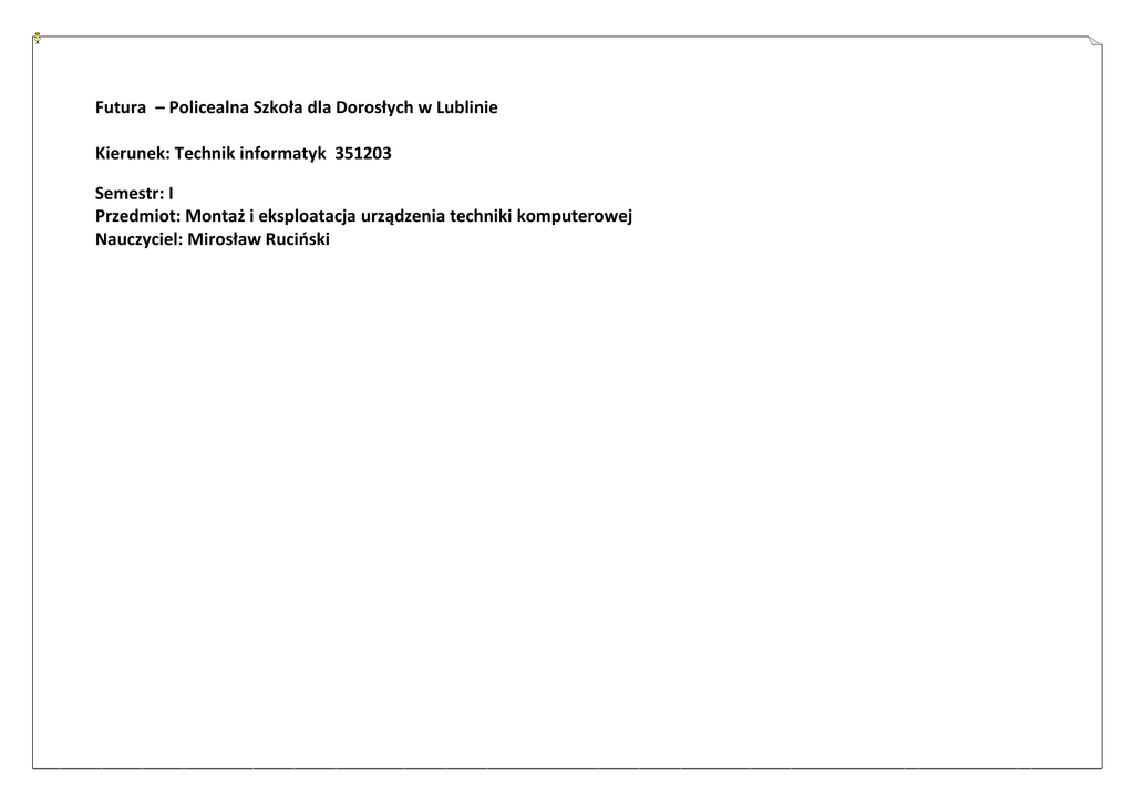 Futura – Policealna Szkoła dla Dorosłych w Lublinie Kierunek: Technik informatyk 351203 Semestr: I Przedmiot: Montaż i eksploatacja urządzenia techniki komputerowej Nauczyciel: Mirosław Ruciński Konfiguracja sieci Omówienie interfejsu konfiguracji sieci Konfiguracja TCP/IP Rozwiązywanie problemów z połączeniem sieciowym Narzędzia PING, ipconfig, tracert, nslookup Konfiguracja dostępu zdanego Bezpieczeństwo sieciowe w Windows XP Konfiguracja firewalla Konfiguracja Windows Update Konfiguracja klienta VPN Aktualizacje systemowe Aktualizacja systemu operacyjnego Konfiguracja automatycznej aktualizacji Aktualizacja sterowników urządzeń Konfiguracja użytkowników i uprawnień Tworzenie i zarządzanie użytkownikami Konfiguracja uprawnień Udostępnianie zasobów Zarządzanie dyskami Zarządzanie plikami i katalogami- konfiguracja uprawnień Uprawnienia NTFS Konfiguracja udostępniania zasobów Kompresja plików Szyfrowanie danych Konfiguracja Windows XP Konfiguracja lokalnej polityki bezpieczeństwa Konfiguracja opcji zasilania Konfiguracja Internet Explorer Instalacja, konfiguracja i udostępnianie drukarek Konfiguracja automatycznego wykonywania zadań Korzystanie z pomocy i obsługi technicznej Podstawowe informacje dotyczące systemu Zabezpieczenia i konserwacja Pomoc on-line w systemie Rozwiązywanie problemów Monitorowanie wydajności i optymalizacja Wbudowane narzędzia do monitorowania systemu i wydajności Optymalizowanie działania systemu operacyjnego Kopia bezpieczeństwa – wykonywanie i odtwarzanie Omówienie zasad wykonywania kopii bezpieczeństwa Wykonanie kopii bezpieczeństwa i odzyskanie danych Przywracanie systemu przy użyciu punktów przywracania systemu (System Restore Points) Konfiguracja BIOS-SETUP BIOS (Basic Input/Output System) BIOS- znajduje się on w pamięci ROM (pamięć tylko do odczytu) płyty głównej, głównym zadaniem BIOS jest przygotowanie komputera i zarządzanie nim, aż nastąpi wczytanie zainstalowanego systemu operacyjnego. BIOS testuje sprzęt po włączeniu komputera, przeprowadza tzw. POST (ang. "Power On Self Test"), zajmuje się wstępną obsługą urządzeń wejścia/wyjścia, kontroluje transfer danych pomiędzy komponentami takimi jak dysk twardy, procesor czy napęd CD-ROM. Inicjuje program rozruchowy. Programu setup można zmieniać standardowe ustawienia BIOS-u, np. parametry podłączonych dysków twardych lub zachowanie się komputera po jego włączeniu (np. szybkość testowania pamięci RAM), a także włączać/wyłączać niektóre elementy płyty głównej, np. porty komunikacyjne. Za pomocą BIOS-u można też przetaktowywać procesor i pamięci RAM, jednak nie jest to zalecane, ponieważ może doprowadzić do przeciążenia urządzenia, a nawet jego uszkodzenia. Sposób uruchomienia i jego ustawienia zależą od producenta płyty głównej i umieszczonej na niej wersji BIOS, dlatego tak ważne jest, aby dokładnie obserwować pojawiające się przy uruchamianiu komputera okna, zwłaszcza te początkowe. Na jednym z pierwszych powinna być informacja o tym, jaki klawisz/kombinację klawiszy należy wcisnąć, aby dostać się do ustawień BIOS. Taka informacja powinna znajdować się w pobliżu frazy „BIOS Setup”. Najczęściej za dostanie się do ustawień BIOS odpowiada klawisz Del lub F2. Główne opcje BIOS Setup - Award Standard CMOS Features - Ustawienia CMOS Advacend BIOS Features - Ustawienia funkcji BIOS Integrated Peripherials - ustawienia płyty głównej Power management Setup - Zarządzanie energią PnP/PCI configurations - Kategoria określa obsługę zainstalowanego w komputerze sprzętu poprzez mechanizm Plug and Play. PC health status - Informacje diagnostyczne. Frequency/Voltage Control - Pozwala na zmianę częstotliwości/napięcia niektórych podzespołów. Top performace Load file-Safe defaults przywróć domyślne ustawienia Load optimized Defaults - przywróć optymalne ustawienia Set Supervisior password - hasło do BIOS'u Set User password - hasło do BIOS'u odezpiecza również system operacyjny. Save & Exit Setup - Zachowaj zmiany i wyjdź Exit without save - Wyjdź bez zapisywania Literatura: http://www.pcworld.pl/news/360899/Prawidlowa.konfiguracja.BIOS.jak.to.zrobic.html http://pl.wikibooks.org/wiki/BIOS/Podstawy http://pl.wikipedia.org/wiki/BIOS Opracował Mirosław Ruciński e-mail: [email protected]