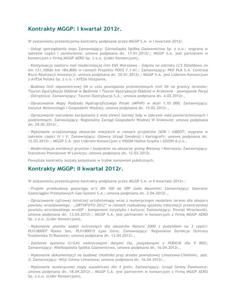 Kontrakty MGGP: I kwartał 2012r. W zestawieniu prezentujemy kontrakty podpisane przez MGGP S.A. w I kwartale 2012r. - Usługi sporządzania map; Zamawiający: Górnośląska Spółka Gazownictwa Sp. z o.o.; wygrana w zakresie części I zamówienia; umowa podpisana dn. 17.01.2012r.; MGGP S.A. jest partnerem w konsorcjum z firmą MGGP AERO Sp. z o.o. (Lider Konsorcjum), - Kontynuacja nadzoru nad modernizacją linii E65 Warszawa - Gdynia na odcinku LCS Działdowo (w km 131,100do km 184,800) w ramach Projektu POIiŚ 7.1-41.; Zamawiający: PKP PLK S.A. Centrala Biuro Realizacji Inwestycji; umowa podpisana dn. 20.01.2012r.; MGGP S.A. jest Liderem Konsorcjum z AYESA Polska Sp. z o.o. i AYESA Hiszpania, - Budowa linii napowietrznej SN w celu powiązania promieniowych linii SN na granicy terenów: Tauron Dystrybucja Oddział w Będzinie i Tauron Dystrybucja Oddział w Krakowie - powiązanie Paryż – Ostrężnica; Zamawiający: Tauron Dystrybucja S.A.; umowa podpisana dn. 4.02.2012r., - Opracowanie Mapy Podziału Hydrograficznego Polski (MPHP) w skali 1:10 000; Zamawiający: Instytut Meteorologii i Gospodarki Wodnej; umowa podpisana dn. 15.02.2012r., - Opracowanie warunków korzystania z wód zlewni Górnej Soły w zakresie wód powierzchniowych i podziemnych; Zamawiający: Regionalny Zarząd Gospodarki Wodnej W Krakowie; umowa podpisana dn. 29.02.2012r., - Wykonanie ortofotomapy obszarów miejskich w ramach projektów ISOK i GBDOT; wygrana w zakresie części IV i V; Zamawiający: Główny Urząd Geodezji i Kartografii; umowa podpisana dn. 12.03.2012r.; MGGP S.A. jest Liderem Konsorcjum z VIDOM Halina Grązka i GEOIN d.o.o., - Modernizacja ewidencji gruntów i budynków na obszarze gminy Bielawy i Kiernozia; Zamawiający: Starostwo Powiatowe W Łowiczu; umowa podpisana dn. 12.03.2012r. Powyższe kontrakty zostały pozyskane w trybie zamówień publicznych. Kontrakty MGGP: II kwartał 2012r. W zestawieniu prezentujemy kontrakty podpisane przez MGGP S.A. w II kwartale 2012r.: - Projekt przebudowy gazociągu w/c DN 100 do SRP Jasło Masonite; Zamawiający: Operator Gazociągów Przesyłowych Gaz-System S.A.; umowa podpisana dn. 2.04.2012r., - Opracowanie cyfrowej lotniczej ortofotomapy wraz z numerycznym modelem terenu dla obszaru powiatu wrocławskiego – „ORTOFOTO 2012” w ramach rozbudowy systemu informacji przestrzennej powiatu wrocławskiego wroSIP – komponent turystyka i kultura; Zamawiający: Powiat Wrocławski, umowa podpisana dn. 13.04.2012r.; MGGP S.A. jest partnerem w konsorcjum z firmą MGGP AERO Sp. z o.o. (Lider Konsorcjum), - Wykonanie planów zadań ochronnych dla obszarów Natura 2000 z podziałem na 3 części: PLH180007 Rzeka San, PLH180015 Łysa Góra; Zamawiający: Regionalna Dyrekcja Ochrony Środowiska O/Rzeszów; umowa podpisana dn. 13.04.2012r., - Zasilenie systemu G/GAS wektorowymi danymi tła, pozyskanymi z PODGiK dla 9 RDG; Zamawiający: Wielkopolska Spółka Gazownictwa, umowa podpisana dn. 16.04.2012r., - Wykonanie dokumentacji na budowę chodnika przy drodze powiatowej Limanowa-Chełmiec, zad. 3; Zamawiający: Wójt Gminy Limanowa; umowa podpisana dn. 16.04.2012r., - Wykonanie numerycznej mapy zasadniczej dla 4 gmin; Zamawiający: Urząd Gminy Pawłowice; umowa podpisana dn. 18.04.2012r.; MGGP S.A. jest partnerem w konsorcjum z firmą MGGP AERO Sp. z o.o. (Lider Konsorcjum), - Zaprojektowanie, dostawa i wdrożenie technologii GIS w Urzędzie Miejskim w Kaliszu jako Miejskiego Systemu Informacji Przestrzennej wraz z wykonaniem mapy akustycznej miasta Kalisza; Zamawiający: Miasto Kalisz; umowa podpisana dn. 20.04.2012r., - Wykonanie projektu budowlano-wykonawczego pt. Przebudowa gazociągu s/c na PE dn 90 w ul. Komedulskiej w Krakowie; Zamawiający: Karpacka Spółka Gazownictwa Oddział Zakład Gazowniczy W Krakowie; umowa podpisana: 21.05.2012r., - Wykonanie zdjęć lotniczych wraz ze sporządzeniem ortofotomapy i numerycznego modelu terenu dla projektu pn.: „E-powiat, budowa Zintegrowanego Systemu Informacji Przestrzennej, wsparciem dla administracji publicznej w Powiecie Myślenickim”; Zamawiający: Powiat Myślenicki; umowa podpisana dn. 23.04.2012r.; MGGP S.A. jest partnerem w konsorcjum z firmą MGGP AERO Sp. z o.o. (Lider Konsorcjum), - Opracowanie kompletnej obiektowej mapy zasadniczej w granicach administracyjnych Gminy Zielonki z wyłączeniem obrębu Wola Zachariaszowska; Zamawiający: Powiat Krakowski; umowa podpisana dn. 27.04.2012r., - Opracowanie warunków korzystania z wód zlewni Gowienicy; Zamawiający: Regionalny Zarząd Gospodarki Wodnej w Szczecinie; umowa podpisana dn. 8.05.2012r., - Projekt przebudowy gazociągu w/c DN 100 do SRP Jasło Gamrat; Zamawiający: Operator Gazociągów Przesyłowych Gaz-System S.A.; umowa podpisana dn. 8.05.2012r., - Projekt przebudowy gazociągu w/c DN 250 na DN 100 do SRP Pilzno; Zamawiający: Operator Gazociągów Przesyłowych Gaz-System S.A.; umowa podpisana dn. 8.05.2012r., - Opracowanie koncepcji odwodnienia w obszarze dróg i ich zlewni na terenie miasta i gminy Piaseczno; Zamawiający: Urząd Miasta Piaseczno; umowa podpisana dn. 10.05.2012., - Przygotowanie i opracowanie projektu zmiany Studium Uwarunkowań i Kierunków Zagospodarowania Przestrzennego oraz opracowanie zmiany miejscowych planów zagospodarowania przestrzennego obszarów wsi: Przytkowice, Bugaj, Zebrzydowice, Podolany, Barwałd Średni, Barwałd Górny, Stanisław Dolny, Brody, Zarzyce Wielkie, Zarzyce Małe, Leńcze, obszaru miasta Kalwaria Zebrzydowska, w tym wykonanie opracowań poprzedzających prace planistyczne oraz udział w czynnościach związanych ze sporządzeniem zmian studium oraz zmian planów; Zamawiający: Burmistrz Miasta Kalwaria Zebrzydowska; umowa podpisana dn. 4.06.2012r., - Opracowanie planów zadań ochronnych dla obszarów NATURA 2000; Zamawiający: Regionalna Dyrekcja Ochrony Środowiska O/Kraków; umowa podpisana dn. 12.06.2012r., - Opracowanie dokumentacji projektowo - kosztorysowej i uzyskanie decyzji o