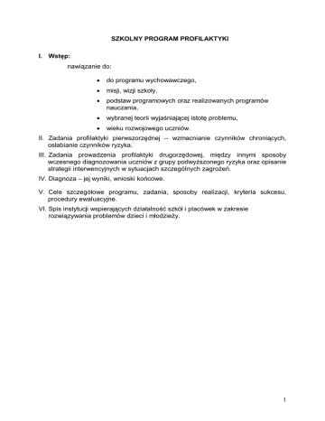 SZKOLNY PROGRAM PROFILAKTYKI I. Wstęp: nawiązanie do: do programu wychowawczego, misji, wizji szkoły, podstaw programowych oraz realizowanych programów nauczania, wybranej teorii wyjaśniającej istotę problemu, wieku rozwojowego uczniów. II. Zadania profilaktyki pierwszorzędnej – wzmacnianie czynników chroniących, osłabianie czynników ryzyka. III. Zadania prowadzenia profilaktyki drugorzędowej, między innymi sposoby wczesnego diagnozowania uczniów z grupy podwyższonego ryzyka oraz opisanie strategii interwencyjnych w sytuacjach szczególnych zagrożeń. IV. Diagnoza – jej wyniki, wnioski końcowe. V. Cele szczegółowe programu, zadania, sposoby realizacji, kryteria sukcesu, procedury ewaluacyjne. VI. Spis instytucji wspierających działalność szkół i placówek w zakresie rozwiązywania problemów dzieci i młodzieży. 1 I. Szkolny program profilaktyki uzupełnieniem programu wychowawczego szkoły Wychowanie jest procesem, w którym wychowanek ma dojść do pełni osobowego rozwoju poprzez: ukształtowanie prawego charakteru, budowanie poczucia odpowiedzialności za własny rozwój i dobro wspólne, uznanie i przestrzeganie norm społecznych, budowanie postawy życzliwości i miłości do ludzi, uświadamianie sobie celów życiowych. Otaczająca rzeczywistość – czas transformacji z jednej strony, z drugiej naturalne zmiany rozwojowe dzieci – niesie ze sobą pewne zagrożenia dla rozwoju młodego człowieka. Przeciwdziałanie tym zagrożeniom lub ich osłabianie ważne dla wychowania, należy do profilaktyki. PROFILAKTYKA to chronienie człowieka w rozwoju przed zagrożeniami i reagowanie na pojawiające się zagrożenia. Jej celem jest ochrona dziecka, ucznia i wychowanka przed zakłóceniami rozwoju., czyli przed podejmowaniem zachowań hamujących lub niszczących rozwój określanych w literaturze przedmiotu jako zachowania ryzykowne. Do najczęściej pojawiających się zachowań ryzykowanych należą: palenie tytoniu, używanie alkoholu, używanie innych środków psychoaktywnych, wczesna inicjacja seksualna, zachowania agresywne i przestępcze. Liczne doświadczenia i badania pokazują, że zachowania ryzykowne mają to do siebie, że jedne pociągają za sobą inne. Ponadto istnieją różne motywy, które skłaniają dzieci i młodzież do podejmowania zachowań ryzykownych. Najczęściej wymieniają: ciekawość, przekorę, manifestowania niezależności, dorosłości, fascynację, presję grupy, modę, sposób na stres, na urozmaicenie nudnego życia, przynależenie do grupy, odwagę, chęć zaimponowania, lęk przed odrzuceniem. Praktyka pokazuje, a literatura przedmiotu potwierdza, że zachowania ryzykowne podejmowane są przez młodzież pełnią określone funkcje. Są sposobem na: zaspokajanie podstawowych potrzeb psychicznych, realizowanie celów rozwojowych, radzenie sobie z trudnymi sytuacjami życiowymi. 2 Uświadomienie sobie tego faktu przez wychowawców pozwoli wyznaczać właściwie kierunki oddziaływań wychowawczych i profilaktycznych zarówno wtedy, gdy mamy już do czynienia z zachowaniami ryzykownymi, jak i wtedy, gdy chcemy przed nimi uchronić młodzież. Jeżeli głównym celem profilaktyki jest ochrona przed zagrożeniami, to punktem wyjścia do projektowania działań profilaktycznych powinno być zastanowienie się, co do tych zachowań prowadzi, a co stanowi zabezpieczenie przed nimi. Do najważniejszych czynników chroniących, które zwiększają odporność człowieka na działanie czynników ryzyka zalicza się: silną więź emocjonalną z rodzicami, zainteresowanie nauką szkolną, regularne praktyki religijne, uwewnętrzniony szacunek do norm, wartości, autorytetów. Wśród zbadanych czynników ryzyka wyróżnia się: środowisko społeczne promujące dane wzorce zachowań (przeludnione, przestępcze), normy społeczne (obyczaje) promujące lub prowokujące dane zachowania, modelowanie takich zachowań w domu i w szkole, konflikty i doświadczenie izolacji w dzieciństwie, grupa rówieśnicza, w której normą są zachowania dysfunkcyjne, niskie wyniki osiągane w szkole i brak celów życiowych, łatwość zdobycia substancji psychoaktywnych, wczesna inicjacja zachowań ryzykownych. Działania profilaktyczne powinny być nakierowane na osłabienie czynników ryzyka i wzmacnianie czynników chroniących. Rozpoznanie oddziaływania czynników ryzyka i czynników chroniących w danym środowisku pozwala na określenie stopnia zagrożenia dzieci i młodzieży oraz wyodrębnienie grup o specyficznym poziomie ryzyka. Te grupy to: 1. Grupa niskiego ryzyka – dzieci i młodzież nie podejmująca jeszcze zachowań ryzykow- nych. 2. Grupa podwyższonego ryzyka – osoby, które podjęły choć jedno zachowanie ryzykowne (eksperymentatory). 3. Grupa wysokie ryzyka – osoby, u których zachowania ryzykowne są utrwalone i które odczuwają negatywne konsekwencje tych zachowań. Do każdej z tych grup kierowane są inne działania profilaktyczne należące do różnych poziomów: 3 1. Profilaktyka pierwszorzędowa, skierowana go grupy niskiego ryzyka, polega na promowaniu zdrowego stylu życia i zapobieganiu zagrożeniom, w szczególności na rozwijaniu umiejętności radzenia sobie z wymogami życia. Jej celem jest opóźnianie inicjacji lub zachęcanie do abstynencji. 2. Profilaktyka drugorzędowa, skierowana do grupy podwyższonego ryzyka, polega na ograniczaniu podejmowania zachowań ryzykownych i zachęcania do wycofania się. 3. Profilaktyka trzeciorzędowa jest interwencją w sytuacji pojawienia się uzależnienia, leczeniem, które ma ograniczyć negatywne skutki uzależnienia i umożliwić powrót do normalnego życia. Działania profilaktyczne realizowane w gimnazjum adresowane są głównie do grup niskiego ryzyka, tzn. na poziomie profilaktyki pierwszorzędnej. Realizację tego zadania wspomagają: podstawa programowa, statut szkoły, szkolny program wychowawczy, wewnątrzszkolny system oceniania. Nowym zadani