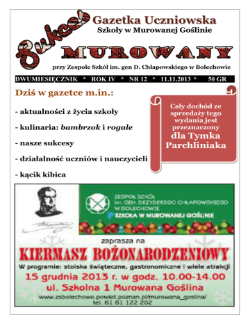 Gazetka Uczniowska Szkoły w Murowanej Goślinie przy Zespole Szkół im. gen D. Chłapowskiego w Bolechowie DWUMIESIĘCZNIK * ROK IV * NR 12 * 11.11.2013 *cen 50 GR 0r Dziś w gazetce m.in.: - aktualności z życia szkoły - kulinaria: bambrzok i rogale - nasze sukcesy - działalność uczniów i nauczycieli - kącik kibica Cały dochód ze sprzedaży tego wydania jest przeznaczony dla Tymka Parchliniaka Sukces Murowany 11 listopada 2013 Po pierwsze - nie poddawać się W piątek 18 października odbył się w naszej szkole, w budynku w Bolechowie, specjalny koncert charytatywny, dedykowany absolwentowi naszej szkoły - Tymoteuszowi Parchliniakowi. Zbierane były pieniądze na leczenie choroby nowotworowej, którą wykryto u niego w maju tego roku. Liczy się każda złotówka. Pomóc może każdy, bez wyjątku, i do tego nasza gazetka gorąco zachęca. Prawdziwą pomoc możemy okazać przez czyny, a nie słowa, które często nie mają pokrycia. Podajemy numer konta, na które można przekazać darowizny: E-mail: [email protected] konto: PL 24 2490 0005 0000 4600 5154 7831 DAROWIZNA NA PROGRAM SKARBONKI - TYMOTEUSZ PARCHLINIAK 10026 Alior Bank Od redakcji: będziemy na bieżąco informować o losach Tymka, a my życzymy, by jak sam mówi - nie poddawał się. /MJ/ Słów kilka o generale... Dezydery Adam Chłapowski, nasz patron - urodzony 23 maja 1788 roku w Turewie. Syn starosty kościańskiego i wojewodzianki inowrocławskiej. Podjął naukę w kolegium pijarów w Rydzynie, a w wieku 14 lat trafił do pułku dragonów pruskich gen. Bruesewitza, który stacjonował w Wielkopolsce. Czytając jego biografię można dowiedzieć się, że wstąpił do honorowej gwardii cesarza Napoleona, którą utworzono po powstaniu wielkopolskim (1806). Brał udział w walce pod sztandarami 9. pułku piechoty, którą Sukces Murowany 11 listopada 2013 dowodził Antoni Sułkowski. Po internowaniu została awansowany na kapitana, po tym awansie został ordynansowym Napoleona. Odbył kampanię hiszpańską, austriacką, moskiewską i saską. Po decyzji o abdykacji Napoleona, u boku którego Chłapowski brał udział w kampani hiszpańskiej i austriackiej udał się do Wielkiej Brytanii. Nasz patron był działaczem politycznym - w latach 1827i 1830 sprawował funkcję posła na sejm prowincji. Na czas powstania listopadowego przywdział mundur i wkroczył do polskiego wojska powstańczego. Dowództwo brygady otrzymał dopiero po odsunięciu Chłopickiego. Decyzją Rady Narodowej awansowany do rangi generała dywizji. Powrócił do działalności politycznej ze swoim byłym podkomendnym Karolem Marcinkowskim, miał zamiar utworzyć Akademię Rolniczą, został posłem sejmu krajowego. Organizował oddziały powstańcze w 1848 roku, członek pruskiego parlamentu Izby Panów - po upadku Wiosny Ludów. Zmarł 27 marca 1879 roku, ciało złożono do grobu obok miejscowego Kościoła w Rąbniniu. Święto Edukacji Narodowej 14 października obchodziliśmy Dzień Edukacji Narodowej, często nazywanym Dniem Nauczyciela. Dzień Edukacji Narodowej to święto szkolnictwa wyższego i całej oświaty ustanowione w kwietniu 1972 roku. Upamiętnia ono rocznicę powstania Komisji Edukacji Narodowej, która utworzona została z Sukces Murowany 11 listopada 2013 inicjatywy króla Stanisława Augusta Poniatowskiego. Historia tego dnia w naszym kraju początkami datuje się na 1957 rok. Jako ciekawostkę można dodać, że Albańczycy obchodzą to święto już 7 marca, a Turcy najpóźniej bo 24 listopada. Korzystając z okazji pragniemy złożyć wszystkim nauczycielom najlepsze życzenia, by praca w szkole, która często wymaga wielu poświęceń sprawiała przyjemność, by każda pozytywna ocena sprawiała radość i dawała poczucie dobrze wykonanej misji. Aktualności Święto Niepodległości 11 listopada obchodzimy z tej okazji święto narodowe. W naszej szkole pochylimy się nad Polską w piątek – 8 listopada za sprawą Ewy Wysockiej, Joanny Bukowskiej-Wojtkowiak i Zbigniewa Wojczaka. Profesor Wojczak zorganizował w czwartek konkurs strzelecki, a w piątek na drugiej i trzeciej godzinie lekcyjnej będziemy w klasach „uczyć się patriotyzmu” – wcale nie w sztywny, podniosły sposób, pamiętając w tym dniu o życzeniach dla naszej Ojczyzny. Otrzęsiny pierwszaków W ostatni piątek września na terenie naszej szkoły odbyły się otrzęsiny klas pierwszych. Zgodnie z tradycją w naszej szkole, pierwszaków poddano kilku ciężkim próbom, na szczęście wyszli z nich obronną ręką. Na liście konkurencji były takie pozycje jak: quiz o życiu 4 Sukces Murowany 11 listopada 2013 szkoły, rysowanie portretów wychowawców, konkurs w piciu mleka bez użycia rąk, przeciąganie liny czy jedzenie pączków. Wygrała klasa 1AZ, a drugie miejsce wspólnie zajęły klasy 1TŻ i 1BZ. Zdjęcia z tego wydarzenia znajdują się na szkolnym facebooku i na stronie internetowej. Strongman 2013 Po zakończeniu otrzęsin odbywały się zawody strongman. Są to „igrzyska siłaczy” organizowane przez nauczycieli wychowania fizycznego. Zawody wygrał Mateusz Maciejewski, a drugie miejsce zajął Piotr Robak - relacja z zawodów w kąciku kibica. Samorząd uczniowski wybrany Nowy samorząd uczniowski wybrany! Uczniowie naszej szkoły wybrali spośród 16 kandydatów czwórkę, która w roku szkolnym 2013 2014 będzie reprezentować interesy uczniów w całej szkole. Przewodniczącym został Marcin Woda, którego wybór wywołał entuzjazm wśród jego kolegów klasowych, zastępcą została Michalina Modlibowska a skarbnikiem został wybrany Patryk Cichocki. Jak podkreśliła Ewelina Niewolak - Druchlińska (opiekun SU) - po raz pierwszy wybrano sekretarza samorządu - tę funkcję sprawować będzie Donata Chruścicka. Wszystkim wybranym serdecznie gratulujemy i życzymy owocnej pracy na rzecz szkoły i uczniów. 5 Sukces Murowany 11 listopada 2013 Lekcje w Łysym Młynie Klasa ITż, 19 września, uczestniczyła w