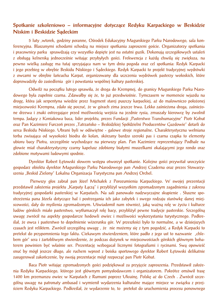 Spotkanie szkoleniowo – informacyjne dotyczące Redyku Karpackiego w Beskidzie Niskim i Beskidzie Sądeckim 5 luty ,wtorek, godziny poranne, Ośrodek Edukacyjny Magurskiego Parku Narodowego, sala konferencyjna. Blaszanymi schodami schodzą na miejsce spotkania zaproszeni goście. Organizatorzy spotkania i pracownicy parku sprawdzają czy wszystko dopięte jest na ostatni guzik. Dokonują szczegółowych ustaleń z obsługą kelnerską jednocześnie witając przybyłych gości. Frekwencja z każdą chwilą się zwiększa, na pewno wielką zasługę ma tutaj sprzyjająca nam w tym dniu pogoda oraz cel spotkania: Redyk Karpacki i jego przebieg w obrębie Beskidu Niskiego i Sądeckiego. Redyk Karpacki to projekt tradycyjnej wędrówki z owcami w obrębie łańcucha Karpat, organizowany dla uczczenia wędrówek pasterzy wołoskich, które doprowadziły do zasiedlenia gór i powstania wspólnej kultury pasterskiej. Odwilż na początku lutego sprawiła, że droga do Krempnej, do granicy Magurskiego Parku Narodowego była zupełnie czarna. Zdawałby się że, to już przedwiośnie. Tymczasem w momencie wjazdu na drogę, która jak serpentyna wiedzie przez fragment starej puszczy karpackiej, aż do malowniczo położonej miejscowości Krempna, zdało się poczuć, że w górach zima jeszcze trwa. Lekko zaśnieżona droga, zaśnieżone drzewa i znaki ostrzegające przed możliwością wejścia na jezdnie rysia, zmuszały kierowcę by zwolnił tempa. Jadący z Koniakowa baca, lider projektu, prezes Fundacji „Pasterstwo Transhumacyjne” Piotr Kohut oraz Pan Kazimierz Furczoń prezes „Tatrzańsko – Beskidzkiej Spółdzielni Producentów Gazdowie” dotarli do serca Beskidu Niskiego. Ubrani byli w odświętne - galowe stroje regionalne. Charakterystyczna wełniana torba zwisająca od wysokości biodra do kolan, skórzany bardzo szeroki pas i czarna czapka to elementy ubioru bacy Piotra, szczególnie wychodzące na pierwszy plan. Pan Kazimierz reprezentujący Podhale na głowie miał charakterystyczny czarny kapelusz zdobiony białymi muszelkami okalającymi jego rondo oraz zdobione motywami ludowymi spodnie. Dyrektor Robert Łętowski słowem wstępu otworzył spotkanie. Kolejno gości przywitał uroczyście gospodarz obiektu dyrektor Magurskiego Parku Narodowego pan Andrzej Czaderna oraz prezes Stowarzyszenia „Beskid Zielony” Lokalna Organizacja Turystyczna pan Andrzej Orchel. Pierwszy głos zabrał pan Józef Michałek z Porozumienia Karpackiego. W swojej prezentacji przedstawił założenia projektu „Karpaty Łączą” i przybliżył wszystkim zgromadzonym zagadnienia z zakresu tradycyjnej gospodarki pasterskiej w Karpatach. Na sali panowało nadzwyczajne skupienie . Słuszne spostrzeżenia pana Józefa dotyczące hal i postrzegania ich jako zabytek i swego rodzaju starówkę danej miejscowości, dały do myślenia zgromadzonym. Uświadomił nam również, jaką ważną rolę w życiu i kulturze ludów górskich miało pasterstwo, wytłumaczył rolę bacy, przybliżył pewne tradycje pasterskie. Szczególną uwagę zwrócił na aspekty gospodarcze hodowli owiec i możliwości wykorzystania turystycznego. Podkreślał, że owca i pasterstwo to dopełnienie wizerunku gór. W przeszłości było to normalne, a w dzisiejszych czasach jest reliktem. Zwrócił szczególną uwagę , że nie możemy się z tym pogodzić, a Redyk Karpacki to pretekst do przypomnienia tego faktu. Ciekawym stwierdzeniem, które padło z jego ust to nazwanie „chlebem gór” sera i żartobliwym stwierdzenie, że podczas dożynek w miejscowościach górskich głównym bohaterem powinien być właśnie ser. Prezentację wzbogacał licznymi fotografiami i rycinami. Swą opowieść snuć by mógł jeszcze długo, ale ruchem wprost z boiska sportowego dyrektor Robert Łętowski delikatnie zasugerował zakończenie, by swoją prezentacje mógł rozpocząć pan Piotr Kohut. Baca Piotr witając zgromadzonych gości podziękował za przyjęcie zaproszenia. Przedstawił założenia Redyku Karpackiego, którego jest głównym pomysłodawcom i organizatorem. Pokrótce omówił trasę 1400 km przemarszu owiec w Karpatach z Rumuni poprzez Ukrainę, Polskę aż do Czech . Zwrócił szczególną uwagę na patronaty ambasad i wymienił wydarzenia kulturalne mające miejsce w związku z przejściem Redyku Karpackiego. Podkreślał, że wydarzenie to, to pretekst do uruchomienia procesu ponownego nadania rangi pasterstwu. Ponadto przyczynia się do międzynarodowego spotkania ludzi żyjących i tworzących w Karpatach, ich integracji oraz ukazania bogactwa kulturowego i przyrodniczego . Jest też sposobem na zrównoważony rozwój terenów górskich, promocję produktów regionalnych i alternatywą na poszerzenie współpracy samorządowej na różnych szczeblach. Zwrócił się również o pomoc do nadleśnictw w Beskidzie Niskim i Sądeckim o wytyczenie szczegółowej trasy przejścia Redyku Karpackiego, a do samorządowców o wykorzystanie go do organizacji wydarzeń kulturalnych. Kolejno przyszedł czas na poruszenie problematyki podejmowanych działań na rzecz rozwoju hodowli owiec w górach. Tematu tego w swojej prelekcji dotyka pan Kazimierz, który jako pierwszy baca na Podhalu uzyskał unijne certyfikaty na oscypki. Charakterystyczną góralską gwarą opowiadał o tradycyjnych produktach z mleka owczego i tradycjach pasterskich. Chcąc potrzymać kulinarne klimaty dyrektor Beskidu Zielonego zaprosił na degustację serów i karnawałowe pączki. Podczas przerwy słychać było żywe dyskusje dotyczące poruszanych wcześniej tematów. Przedstawiciele mediów wykorzystali ten czas na wywiady i szukanie odpowiedzi na nurtujące ich pytania. Po pełnym wymiany zdań przerywniku uczestnicy konferencji powrócili na swoje miejsca, by przyjrzeć się i wysłuchać prezentacji pani Lucyny Kmak. Reprezentantka Powiatowego Zespołu Doradztwa Rolniczego z Nowego Sącza z/s w Nawojowej dotknęła tematyki :„Produkty regional
