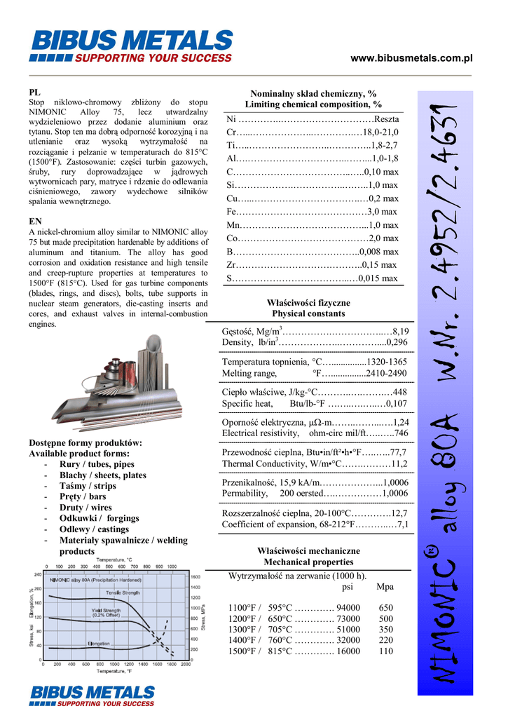 PL Stop niklowo-chromowy zbli ony do stopu NIMONIC Alloy 75, lecz utwardzalny wydzieleniowo przez dodanie aluminium oraz tytanu. Stop ten ma dobr odporno korozyjn i na utlenianie oraz wysok wytrzyma na rozci ganie i pe zanie w temperaturach do 815°C (1500°F). Zastosowanie: cz ci turbin gazowych, ruby, rury doprowadzaj ce w j drowych wytwornicach pary, matryce i rdzenie do odlewania ci nieniowego, zawory wydechowe silników spalania wewn trznego. EN A nickel-chromium alloy similar to NIMONIC alloy 75 but made precipitation hardenable by additions of aluminum and titanium. The alloy has good corrosion and oxidation resistance and high tensile and creep-rupture properties at temperatures to 1500°F (815°C). Used for gas turbine components (blades, rings, and discs), bolts, tube supports in nuclear steam generators, die-casting inserts and cores, and exhaust valves in internal-combustion engines. Nominalny sk ad chemiczny, % Limiting chemical composition, % Ni …………..…………………………Reszta Cr…...………………..………….…18,0-21,0 Ti…..……………………..…………..1,8-2,7 Al….…………………………..……...1,0-1,8 C………………………………..…..0,10 max Si……………….……………..……..1,0 max Cu…...…………………………….…0,2 max Fe……………………………………3,0 max Mn…………………………………...1,0 max Co……………………………………2,0 max B…………………………………..0,008 max Zr…………………………………..0,15 max S………………………………..…0,015 max ciwo ci fizyczne Physical constants sto , Mg/m3…………….……………..…8,19 Density, lb/in3………………..…………....0,296 Temperatura topnienia, °C…...............1320-1365 Melting range, °F…...............2410-2490 Ciep o w ciwe, J/kg-°C………..….…….…448 Specific heat, Btu/lb-°F ……..….…..…0,107 Oporno elektryczna, µΩ-m……..……...….1,24 Electrical resistivity, ohm-circ mil/ft…..…..746 Przewodno cieplna, Btu•in/ft²•h•°F…..…..77,7 Thermal Conductivity, W/m•°C…….………11,2 Przenikalno , 15,9 kA/m………………...1,0006 Permability, 200 oersted….……………1,0006 Rozszerzalno cieplna, 20-100°C………….12,7 Coefficient of expansion, 68-212°F………..…7,1 ® Dost pne formy produktów: Available product forms: - Rury / tubes, pipes - Blachy / sheets, plates - Ta my / strips - Pr ty / bars - Druty / wires - Odkuwki / forgings - Odlewy / castings - Materia y spawalnicze / welding products ciwo ci mechaniczne Mechanical properties Wytrzyma na zerwanie (1000 h). psi Mpa 1100°F / 1200°F / 1300°F / 1400°F / 1500°F / 650 500 350 220 110 595°C …………. 94000 650°C …………. 73000 705°C …………. 51000 760°C …………. 32000 815°C …………. 16000 NIMONIC alloy 80A W.Nr. 2.4952/2.4631 www.bibusmetals.com.pl