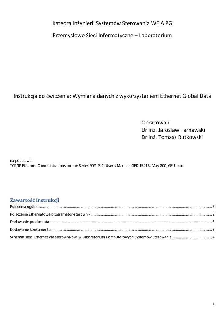 Katedra Inżynierii Systemów Sterowania WEiA PG Przemysłowe Sieci Informatyczne – Laboratorium Instrukcja do dwiczenia: Wymiana danych z wykorzystaniem Ethernet Global Data Opracowali: Dr inż. Jarosław Tarnawski Dr inż. Tomasz Rutkowski na podstawie: TCP/IP Ethernet Communications for the Series 90™ PLC, User's Manual, GFK-1541B, May 200, GE Fanuc Zawartość instrukcji Polecenia ogólne: ....................................................................................................................................................................... 2 Połączenie Ethernetowe programator-sterownik...................................................................................................................... 2 Dodawanie producenta .............................................................................................................................................................. 3 Dodawanie konsumenta ............................................................................................................................................................ 3 Schemat sieci Ethernet dla sterowników w Laboratorium Komputerowych Systemów Sterowania ....................................... 4 1 Polecenia ogólne: 1. 2. 3. 4. Podzielid grupę realizujących dwiczenie na dwie trzy części. Korzystając z zamieszczonego na koocu instrukcji schematu rozpocznij pracę we właściwym miejscu laboratorium. Skonfiguruj sterowniki i przygotuj do pracy Odnajdź Ethernetowy port komunikacyjny w sterowniku i przejdź do edycji parametrów konfiguracyjnych Uwaga w sterowniku PACS RX3i będzie to zewnętrzny, osobny moduł komunikacyjny, a w sterowniku 90-30 będzie to port w jednostce centralnej 364. 5. W przypadku konfigurowania sterownika 90-30 w zakładce Ethernet w polu Adapter Name wpisz dowolną nazwę (pole nie może zostad puste) 6. 7. 8. 9. Przypisz numery IP do sterowników zgodnie ze schematem z instrukcji Załaduj konfigurację do sterownika Uruchom konsolę na komputerze programatorze: START-> Uruchom-> wpisz w polu edycyjnym cmd -> naciśnij OK Wydaj polecenie ping a następnie numer IP, który wpisałeś do sterownika np. ping 192.168.1.201 i naciśnij Enter 10. Sprawdź połączenie. Jeśli nie pakiety nie są przesyłane przeprowadź ponownie proces konfiguracji. 11. Następnie wykonaj ping do pozostałych sterowników, które będą brały udział w wymianie danych 12. Odłącz się od sterownika (przejdź w tryb off-line) Połączenie Ethernetowe programator-sterownik 13. Po prawidłowej odpowiedzi możesz zmienid połączenie pomiędzy sterownikiem i programatorem z połączenia szeregowego na połączenie Ethernetowi. W tym celu naprowadź kursor na nazwę podsystemu w drzewie projektu (domyślna nazwa Target1) i w oknie Inspector zmieo ustawienie na pozycji Physical Port z COM1 na Ethernet a w polu adres wpisz adres IP, który wpisałeś w konfiguracji sterownika 14. Możesz przetestowad nowe połączenie, po zakooczeniu testów odłącz się od sterownika (tyb off-line) 2 15. Następnie naciśnij prawy klawisz myszki na nazwie podsystemu (domyślnie Target1) i wybierz opcję Add Component, a następnie Ethernet Global Data 16. Po naprowadzeniu kursorem na element Ethernet Global Data wpisz w polu Local Producer ID numer podany na schemacie np. 0.0.0.1 i naciśnij Enter. Programator sam wypełni pole Local Producer ID (number) 17. Uwaga należy rozróżniad ID producenta i numer IP . To dwa różne numery! 18. W pierwszej fazie zaprojektuj w obrębie grupy jedną wymianę – np. pomiędzy PLC1 jako producentem i PLC2 jako konsumentem Dodawanie producenta 19. 20. 21. 22. naprowadź kursor na nazwę Produced Exchanges i naciśnij prawy klawisz myszki, a następnie wybierz opcję New Następnie naprowadź kursor na utworzoną wymianę i naciśnij lewy klawisz myszki Wprowadź kolejny numer wymiany ExchangeID (zaczynamy od 1, każda wymiana musi mied swój unikalny numer, Producent i konsument muszą mied ten sam numer w obrębie jednej wymiany) Destination Type: wybierz IP Adress lub Unicast (zależnie od wersji programu i sterownika) W polu Destination wpisz adres IP sterownika, do którego wysyłasz dane 23. Następnie naciśnij dwukrotnie lewy klawisz myszki na dodanej wymianie i otworzy się okno, w którym należy wpisad adres zmiennej do wysłania. Wpisz adres związany z symulatorem wejśd, aby mied bezpośredni wpływ na wysyłane dane. 24. Załaduj nową konfigurację do sterownika, poczekaj aż koledzy skonfigurują sterownik Konsumenta. Sprawdź poprawnośd wysyłanych danych Dodawanie konsumenta Naprowadź kursor na nazwę Consumed Exchanges i naciśnij prawy klawisz myszki a następnie wybierz opcję New 25. Następnie naprowadź kursor na utworzoną wymianę i naciśnij lewy klawisz myszki 26. Wprowadź nazwę producenta tj. sterownika, który będzie przysyłał dane 3 27. Wprowadź ten sam numer wymiany ExchangeID, który wpisano przy definiowaniu producenta dla tej wymiany 28. Następnie naciśnij dwukrotnie lewy klawisz myszki na dodanej wymianie i otworzy się okno w którym należy wpisad, gdzie odbierzemy przysyłane dane. Wpisz adres związany z wyjściami dyskretnymi, aby od razu obejrzed stan przysyłanych danych. 29. Załaduj nową konfigurację do sterownika, poczekaj aż koledzy skonfigurują sterownik producenta. Sprawdź poprawnośd odbieranych danych 30. Posługując się opisaną metodą zaprojektuj wymianę danych pomiędzy trzema sterownikami. Każdy z nich ma byd zarówno producentem jak i konsumentem. Wykonaj czynności właściwe dla grupy, do której przynależysz, a następnie po zakooczeniu pracy w grupach: 1. Zaprojektuj przesyłanie zmiennych rejestrowych %R z wykorzystaniem bloków Word In, Word Out i typem danych Zmienna analogowa 2. Spróbuj podnieśd prędkośd przesyłania danych 3. Zaprojektuj aplikację dla sterownika, która umożliwi oszacowanie czasu potrzebnego na transmisję danych od PLC1 do PLC2 i z powrot