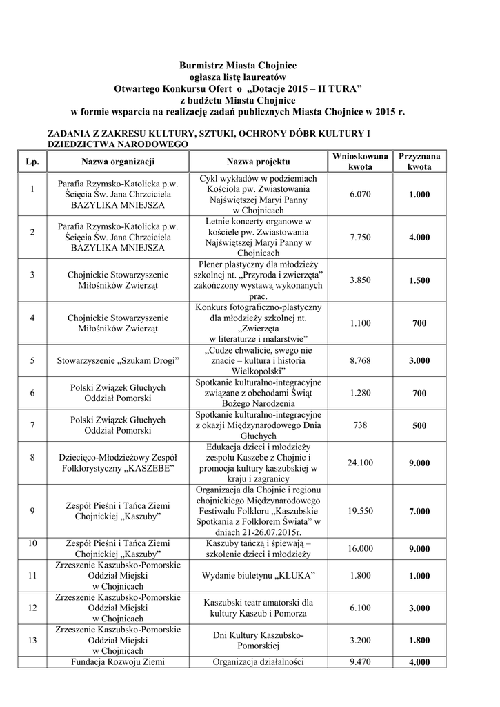 Burmistrz Miasta Chojnice ogłasza listę laureatów Otwartego Konkursu Ofert o „Dotacje 2015 – II TURA” z budżetu Miasta Chojnice w formie wsparcia na realizację zadań publicznych Miasta Chojnice w 2015 r. ZADANIA Z ZAKRESU KULTURY, SZTUKI, OCHRONY DÓBR KULTURY I DZIEDZICTWA NARODOWEGO Wnioskowana Lp. Nazwa organizacji Nazwa projektu kwota Cykl wykładów w podziemiach Parafia Rzymsko-Katolicka p.w. 1 Kościoła pw. Zwiastowania Ścięcia Św. Jana Chrzciciela 6.070 Najświętszej Maryi Panny BAZYLIKA MNIEJSZA w Chojnicach Letnie koncerty organowe w Parafia Rzymsko-Katolicka p.w. 2 kościele pw. Zwiastowania Ścięcia Św. Jana Chrzciciela 7.750 Najświętszej Maryi Panny w BAZYLIKA MNIEJSZA Chojnicach Plener plastyczny dla młodzieży 3 Chojnickie Stowarzyszenie szkolnej nt. „Przyroda i zwierzęta” 3.850 Miłośników Zwierząt zakończony wystawą wykonanych prac. Konkurs fotograficzno-plastyczny 4 Chojnickie Stowarzyszenie dla młodzieży szkolnej nt. 1.100 Miłośników Zwierząt „Zwierzęta w literaturze i malarstwie” „Cudze chwalicie, swego nie 5 Stowarzyszenie „Szukam Drogi” znacie – kultura i historia 8.768 Wielkopolski” Spotkanie kulturalno-integracyjne Polski Związek Głuchych 6 związane z obchodami Świąt 1.280 Oddział Pomorski Bożego Narodzenia Spotkanie kulturalno-integracyjne Polski Związek Głuchych 7 z okazji Międzynarodowego Dnia 738 Oddział Pomorski Głuchych Edukacja dzieci i młodzieży 8 Dziecięco-Młodzieżowy Zespół zespołu Kaszebe z Chojnic i 24.100 Folklorystyczny „KASZEBE” promocja kultury kaszubskiej w kraju i zagranicy Organizacja dla Chojnic i regionu chojnickiego Międzynarodowego Zespół Pieśni i Tańca Ziemi 9 Festiwalu Folkloru „Kaszubskie 19.550 Chojnickiej „Kaszuby” Spotkania z Folklorem Świata” w dniach 21-26.07.2015r. 10 Zespół Pieśni i Tańca Ziemi Kaszuby tańczą i śpiewają – 16.000 Chojnickiej „Kaszuby” szkolenie dzieci i młodzieży Zrzeszenie Kaszubsko-Pomorskie 11 Oddział Miejski Wydanie biuletynu „KLUKA” 1.800 w Chojnicach Zrzeszenie Kaszubsko-Pomorskie Kaszubski teatr amatorski dla 12 Oddział Miejski 6.100 kultury Kaszub i Pomorza w Chojnicach Zrzeszenie Kaszubsko-Pomorskie Dni Kultury Kaszubsko13 Oddział Miejski 3.200 Pomorskiej w Chojnicach Fundacja Rozwoju Ziemi Organizacja działalności 9.470 Przyznana kwota 1.000 4.000 1.500 700 3.000 700 500 9.000 7.000 9.000 1.000 3.000 1.800 4.000 14 Chojnickiej i Człuchowskiej 15 Fundacja „Szarża Pod Krojantami” 16 Towarzystwo Przyjaciół Muzeum Historyczno-Etnograficznego w Chojnicach 17 Chojnickie Towarzystwo Polsko-Francuskie hobbystycznych grup wolontariuszy w Samorządnym Centrum Młodzieżowym w drugim półroczu 2015r. Organizacja inscenizacji Szarży 18 Pułku Ułanów Pomorskich pod Krojantami z 1 września 1939r. Ochrona dziedzictwa archeologicznego – łużycki skarb z epoki brązu XXI Dni Kultury Francuskiej 10.000 6.000 10.000 3.000 4.000 1.500 ZADANIA Z ZAKRESU WSPIERANIA I UPOWSZECHNIANIA KULTURY FIZYCZNEJ I SPORTU Lp. Nazwa organizacji 1 RED DEVILS FUTSAL CLUB 2 Chojnickie Stowarzyszenie AIKIDO 3 4 5 6 7 Uczniowski Klub Sportowy „RUGBY TUR CHOJNICE” przy Technikum im. Stefana Bieszka Liga Obrony Kraju Zarząd Miejski w Chojnicach Uczniowski Klub Sportowy „KET” Chojnicki Klub Żeglarski Chojnicki Klub Żeglarski 8 Chojnicki Klub Żeglarski 9 Chojnicki Klub Sportowy „KOLEJARZ” Nazwa projektu a)Organizacja szkolenia dzieci i młodzieży w tym uzdolnionej sportowo b)Organizacja przygotowań i uczestnictwa w regionalnych, ogólnopolskich i międzynarodowych imprezach sportowych c)Promocja sportu dzieci i młodzieży d)Organizacja imprez sportowych każdego szczebla (szkolne, międzyszkolne, ogólnomiejskie, regionalne, ogólnokrajowe, międzynarodowe) Organizacja cyklu seminariów szkoleniowych aikido i kenjutsu dla dzieci i młodzieży miasta Chojnice Szkolenie dzieci i młodzieży w rugby w kategoriach wiekowych 10-19 lat Zawody strzeleckie oraz organizacja szkolenia strzeleckiego dla młodzieży szkolnej Organizacja przygotowań i uczestnictwa w regionalnych i ogólnopolskich imprezach sportowych Szkolenie sportowe młodzieży i osób niepełnosprawnych intelektualnie Organizacja imprez żeglarskich rangi ogólnopolskiej Organizacja szkolenia dzieci i młodzieży uzdolnionej sportowo wraz z udziałem w regatach krajowych i zagranicznych Organizacja szkolenia dzieci i młodzieży w tym uzdolnionej sportowo w dziedzinie piłka nożna Wnioskowa na kwota Przyznana kwota 30.000 11.000 3.600 1.000 20.000 7.000 10.700 5.000 6.000 2.000 10.000 6.000 15.000 5.000 80.000 35.000 29.900 7.000 10 Uczniowski Klub Sportowy „OGÓLNIAK” 11 Uczniowski Klub Sportowy „OGÓLNIAK” 12 Klub Sportowy „BOXING TEAM” Chojnice 13 14 15 Miejski Klub Sportowy „Chojniczanka 1930” Miejski Klub Sportowy „Chojniczanka 1930” Klub Sportowy „BOXING TEAM” Chojnice Organizacja szkolenia dzieci i młodzieży w zakresie piłki siatkowej Organizacja szkolenia dzieci i młodzieży w zakresie piłki koszykowej Organizacja Turnieju Bokserskiego /gali/ - Chojnicki Boxing Show. Organizowanie zawodów i imprez sportowych Wspieranie szkolenia dzieci i młodzieży w zakresie lekkoatletyki Wspieranie szkolenia dzieci i młodzieży w zakresie piłki nożnej Udział w zawodach w ramach współzawodnictwa sportowego Mistrzostwa Polski Dubletów w Petanque o Puchar Burmistrza Chojnic (strefa północna) Organizacja i udział w rozgrywkach klubowych o Mistrzostwo III Ligi w Petanque 3.960 1.000 2.940 1.000 13.400 8.000 21.000 8.000 272.850 42.000 12.696,80 4.000 6.250 1.500 24.050 5.000 16 Chojnickie Towarzystwo PolskoFrancuskie 17 Chojnickie Towarzystwo PolskoFrancuskie 18 Chojnickie Towarzystwo PolskoFrancuskie Indywidualne Mistrrzostwa Polski w Petanque (strefa północna) 4.350 1.000 19 Uczniowski Klub Sportowy „ÓSEMKA” Chojnice Organizacja cyklu turniejów szachowych i tenisa stołowego oraz ogólnopolskiego wielobo