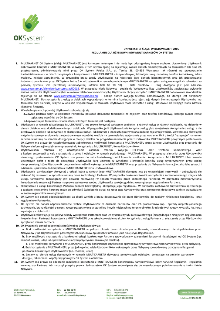 nNr sprwUmowa o świadczenie usług OK System Polska Zał. nr 1 do Umowy REGULAMIN DLA UŻYTKOWNIKÓW MULTIKARNETÓW OK SYSTEM Zał. nr 1 do Umowy REGULAMIN DLA UŻYTKOWNIKÓW MULTIKARNETÓW OK SYSTEM UNIWERSYTET ŚLĄSKI W KATOWICACH 2015 REGULAMIN DLA UŻYTKOWNIKÓW MULTIKARNETÓW OK SYSTEM 1. MULTIKARNET OK System (dalej: MULTIKARNET) jest karnetem imiennym i nie może być udostępniany innym osobom. Uprawniony Użytkownik dobrowolnie korzysta z MULTIKARNETU, w związku z tym wyraża zgodę na rejestrację swoich danych biometrycznych na terminalach OK oraz ich przetwarzanie, administrowanie nimi przez OK System Polska S.A., ul. Tamka 38, 00-355 Warszawa, jak również na przetwarzanie i administrowanie - w celach związanych z korzystaniem z MULTIKARNETU – innymi danymi, takimi jak: imię, nazwisko, telefon komórkowy, adres mailowy, miejsce zatrudnienia. W przypadku braku zgody Użytkownika na rejestrację jego danych biometrycznych oraz ich przetwarzanie i administrowanie nimi przez OK System Polska S.A. – Użytkownik w ramach posiadanego MULTIKARNETU korzysta z usług we wszystkich obiektach za pomocą systemu sms (bezpłatnej automatycznej infolinii 800 80 10 10). Lista obiektów i usług dostępna jest pod adresem www.oksystem.pl/klienci/uniwersytetslaski2015. W przypadku kiedy Nabywca podaje do Wykonawcy listę Użytkowników zawierającą wyłącznie imiona i nazwiska Użytkowników (bez numerów telefonów komórkowych), Użytkownik chcący korzystać z MULTIKARNETU dobrowolnie samodzielnie rejestruje się na stronie www.oksystem.pl/rejestracja/klienci i podaje numer swojego telefonu komórkowego, do którego jest przypisany MULTIKARNET. Do skorzystania z usług w obiektach wyposażonych w terminal konieczna jest rejestracja danych biometrycznych Użytkownika na terminalu przy pierwszej wizycie w obiekcie wyposażonym w terminal. Użytkownik może korzystać z usług stosownie do swojego stanu zdrowia i kondycji fizycznej. 2. W celach opisanych powyżej Użytkownik zobowiązuje się: a. Zawsze podczas wizyt w obiektach Partnerów posiadać dokument tożsamości ze zdjęciem oraz telefon komórkowy, którego numer został zgłoszony wcześniej do OK System. b. Logować się na terminalu – w obiektach, w których terminal jest dostępny. 3. Użytkownik w ramach zakupionego MULTIKARNETU ma prawo korzystać wyłącznie osobiście z różnych usług w różnych obiektach, raz dziennie w danym obiekcie, oraz dodatkowo w innych obiektach.. W przypadku, jeśli Użytkownik nie korzysta z usług i/lub zarejestruje skorzystanie z usługi a nie przebywa w obiekcie lub rezygnuje ze skorzystania z usługi, lub korzysta z innej usługi niż wybrana podczas rejestracji wejścia, wówczas ma obowiązek natychmiastowego anulowania zarejestrowanego wcześniej wejścia na terminalu lub opcjonalnie przez wysłanie SMS o treści ”rezygnuje” na numer serwera wskazany na standzie dostępnym w recepcji obiektu. W przypadku naruszenia przez Użytkownika MULTIKARNETU powyższych postanowień OK System ma prawo do natychmiastowego zablokowania możliwości korzystania z MULTIKARNETU przez danego Użytkownika oraz przesłania do Nabywcy informacji o odebraniu uprawnień do korzystania z MULTIKARNETU temu Użytkownikowi. 4. Użytkownikom zabrania się udostępniania osobom trzecim swojego OK-PINu, oraz telefonu komórkowego wraz z kodem autoryzacji w celu skorzystania z usług i obiektów w ramach posiadanego MULTIKARNETU. W przypadku złamania przez Użytkownika niniejszego postanowienia OK System ma prawo do natychmiastowego zablokowania możliwości korzystania z MULTIKARNETU bez zwrotu uiszczonych opłat a także do obciążenia Użytkownika karą umowną w wysokości 3-krotności kosztów usług wykorzystanych przez osobę nieuprawnioną, której Użytkownik bezprawnie umożliwił wykorzystanie MULTIKARNETU, oraz przesłania do Nabywcy informacji o zaistniałej sytuacji i odebraniu uprawnień do korzystania z MULTIKARNETU temu Użytkownikowi. 5. Użytkownik zamierzający skorzystać z usługi, która w ramach jego MULTIKARNETU dostępna jest po wcześniejszej rezerwacji - zobowiązuje się dokonać tej rezerwacji w sposób wskazany przez konkretnego Partnera. W przypadku braku możliwości skorzystania z zarezerwowanego miejsca lub usługi, Użytkownik zobowiązany jest odwołać rezerwację (w sposób wskazany przez konkretnego Partnera). W przypadku niewykorzystania i nieodwołania rezerwacji Partner ma prawo zastosować wobec Użytkownika sankcje zgodnie z wewnętrznym regulaminem Partnera. 6. Skorzystanie z usługi konkretnego Partnera oznacza bezwzględną akceptację jego regulaminu. W przypadku zachowania Użytkownika sprzecznego z zapisami regulaminu Partnera może on odmówić świadczenia usługi na rzecz tego Użytkownika oraz zastosować dodatkowe sankcje przewidziane w swoim regulaminie wewnętrznym. 7. OK System nie ponosi odpowiedzialności za skutki wynikłe z braku dostosowania się przez Użytkownika do zapisów niniejszego Regulaminu oraz regulaminów Partnerów. 8. OK System nie ponosi odpowiedzialności wobec Użytkowników za działania Partnerów oraz ich pracowników (np. epizody nieprofesjonalnego zachowania, braku dbałości o sprzęt, rzeczy pozostawione w szatni lub innych miejscach na terenie obiektu, kradzieże tych rzeczy, wypadki, itp.) oraz wynikające z nich skutki. 9. Użytkownik zobowiązuje się pokryć szkody wyrządzone Partnerom oraz OK System z tytułu nieprawidłowego (niezgodnego z niniejszym Regulaminem i regulaminem Partnera) korzystania z MULTIKARNETU oraz szkody powstałe na skutek korzystania z usług Partnera tj. zniszczenie przez Użytkownika sprzętu lub mienia Partnera. 10. OK System nie ponosi odpowiedzialności wobec Użytkowników za: a. Brak możliwości korzystania z MULTIKARNETU w pełnym okresie czasu określonym w Umowie, spowodowanym nie dopełnieniem przez Nabywców i/lub Użytkowników poszczególnych warunków opisanych w umow