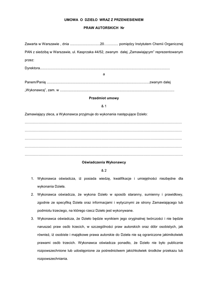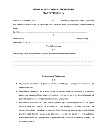 UMOWA O DZIEŁO WRAZ Z PRZENIESIENIEM PRAW AUTORSKICH Nr Zawarta w Warszawie , dnia ...............................20........... pomiędzy Instytutem Chemii Organicznej PAN z siedzibą w Warszawie, ul. Kasprzaka 44/52, zwanym dalej „Zamawiającym” reprezentowanym przez: Dyrektora...................................................................................................................................... a Panem/Panią ..........................................................................................................zwanym dalej „Wykonawcą”, zam. w ...................................................................................................................... Przedmiot umowy &1 Zamawiający zleca, a Wykonawca przyjmuje do wykonania następujące Dzieło: . Oświadczenia Wykonawcy &2 1. Wykonawca oświadcza, iż posiada wiedzę, kwalifikacje i umiejętności niezbędne dla wykonania Dzieła. 2. Wykonawca oświadcza, że wykona Dzieło w sposób staranny, sumienny i prawidłowy, zgodnie ze specyfiką Dzieła oraz informacjami i wytycznymi ze strony Zamawiającego lub podmiotu trzeciego, na którego rzecz Dzieło jest wykonywane. 3. Wykonawca oświadcza, że Dzieło będzie wynikiem jego oryginalnej twórczości i nie będzie naruszać praw osób trzecich, w szczególności praw autorskich oraz dóbr osobistych, jak również, iż osobiste i majątkowe prawa autorskie do Dzieła nie są ograniczone jakimikolwiek prawami osób trzecich. Wykonawca oświadcza ponadto, że Dzieło nie było publicznie rozpowszechnione lub udostępnione za pośrednictwem jakichkolwiek środków przekazu lub rozpowszechniania. 4. W razie stwierdzenia nieprawidłowości oświadczeń, o których mowa w ust.3 powyżej, lub też wad prawnych Dzieła, Zamawiający będzie uprawniony do odstąpienia od umowy lub żądania zwrotu wypłaconego wynagrodzenia wraz z odsetkami w wysokości ustawowej od dnia zapłaty do dnia zwrotu wynagrodzenia. W każdym wypadku określonym w niniejszym ustępie, Zamawiający będzie także uprawniony do dochodzenia naprawienia szkody w pełnym zakresie . 5. Dzieło ma charakter indywidualny, stanowi pracę naukowo-badawczą lub jej część i jest przedmiotem prawa autorskiego. Wykonywanie Dzieła &3 1. Wykonawca wykona Dzieło osobiście i samodzielnie bez nadzoru ze strony Zamawiającego na rzecz Projektu ... . Wykonawca nie może powierzyć wykonania Dzieła osobie trzeciej. Zamawiający może zastrzec, że Wykonawca w celu stworzenia Dzieła będzie zobowiązany do porozumienia się lub współpracy z innymi wykonawcami. 2. Wykonawca jest zobowiązany zapewnić Zamawiającemu dostęp do wykonywanego Dzieła na każdym etapie jego wykonywania. 3. Na żądanie Zamawiającego, Wykonawca jest zobowiązany do przedstawienia informacji dotyczących postępu prac nad Dziełem. Niezależnie od tego, Wykonawca zobowiązany jest do niezwłocznego poinformowania Zamawiającego, jeżeli zachodzą jakiekolwiek okoliczności mogące mieć wpływ na terminowe wykonanie Dzieła. 4. Zamawiający zobowiązany jest udostępnić Wykonawcy materiały, opracowania, dokumenty niezbędne dla wykonania Dzieła. 5. Wykonawca zobowiązuje się do przedstawienia Dzieła Zamawiającemu w formie Termin wykonania Dzieła &4 1. Wykonanie Dzieła nastąpi w terminie. 2. Zamawiający poinformuje niezwłocznie Wykonawcę o zastrzeżeniach, co do otrzymanego Dzieła. Jeżeli tego nie zrobi, uznaje się ,że Dzieło zostało wykonane bez zastrzeżeń. Przeniesienie praw autorskich &5 1. Autor Dzieła zobowiązuje się przenieść na Zamawiającego całość praw autorskich do Dzieła, bez żadnych ograniczeń czasowych i terytorialnych, na wszelkich znanych w chwili zawarcia niniejszej umowy polach eksploatacji. 2. Autor Dzieła upoważnia również Zamawiającego do rozporządzania oraz korzystania z utworów stanowiących opracowanie Dzieła. Wskazane upoważnienie może być przenoszone na osoby trzecie bez konieczności uzyskiwania odrębnej zgody. Wynagrodzenie &6 1. Z tytułu wykonania niniejszej umowy , Zamawiający wypłaci Wykonawcy wynagrodzenie w wysokości..(słownie zł. pomniejszone o należne obciążenia publicznoprawne wynikające z obowiązujących przepisów prawa. 2 Wynagrodzenie, o którym mowa w ust.1 powyżej obejmuje w szczególności wynagrodzenie z tytułu: a) wykonania Dzieła, b) przeniesienia praw autorskich, c) udzielenia zgody, o której mowa w & 5 ust.2 powyżej, d) nabycie praw do nośników, na których Dzieło utrwalono. 3. Wynagrodzenie Wykonawcy płatne będzie w terminie 14 dni od dnia przyjęcia Dzieła przez Zamawiającego bez zastrzeżeń. Wynagrodzenie płatne będzie na podstawie prawidłowo wystawionego i dostarczonego Zamawiającemu rachunku, przelewem na konto wskazane w rachunku. 4. Wynagrodzenie Wykonawcy może być płatne w ratach po wykonaniu pewnego etapu Zamówionego Dzieła na podstawie prawidłowo wystawionego rachunku. 5. Odbioru pracy dokona Kierownik Zadania Projektu .. . 6. W ramach realizacji przedmiotu niniejszej umowy Wykonawcy przysługiwać będzie zwrot kosztów jego udziału w konferencjach, konsultacjach i delegacjach (koszt podróży, zakwaterowania itp.) płatnych ze środków Projektu „” Postanowienia końcowe &7 1 W sprawach nieuregulowanych niniejszą umową mają zastosowanie przepisy obowiązującego prawa, w szczególności kodeksu cywilnego oraz ustawy o prawie autorskim i prawach pokrewnych. 2 Wszelkie spory powstałe na gruncie niniejszej umowy rozpoznawane będą przez sąd powszechny właściwy ze względu na siedzibę Zamawiającego. 3 Wszelkie zmiany umowy wymagają formy pisemnej pod rygorem nieważności. 4 Dane osobowe Wykonawcy są objęte ochroną prawną na podstawie przepisów Ustawy z dnia 29 sierpnia 1997r. o ochronie danych osobowych (Dz.U. Nr 133/97, poz. 883 z późn zm.) 5 Umowa została zawarta na podstawie dokonanego przez Zamawiającego wyboru Wykonawcy zgodnie z ustawą z dnia 29.01.2004r. P