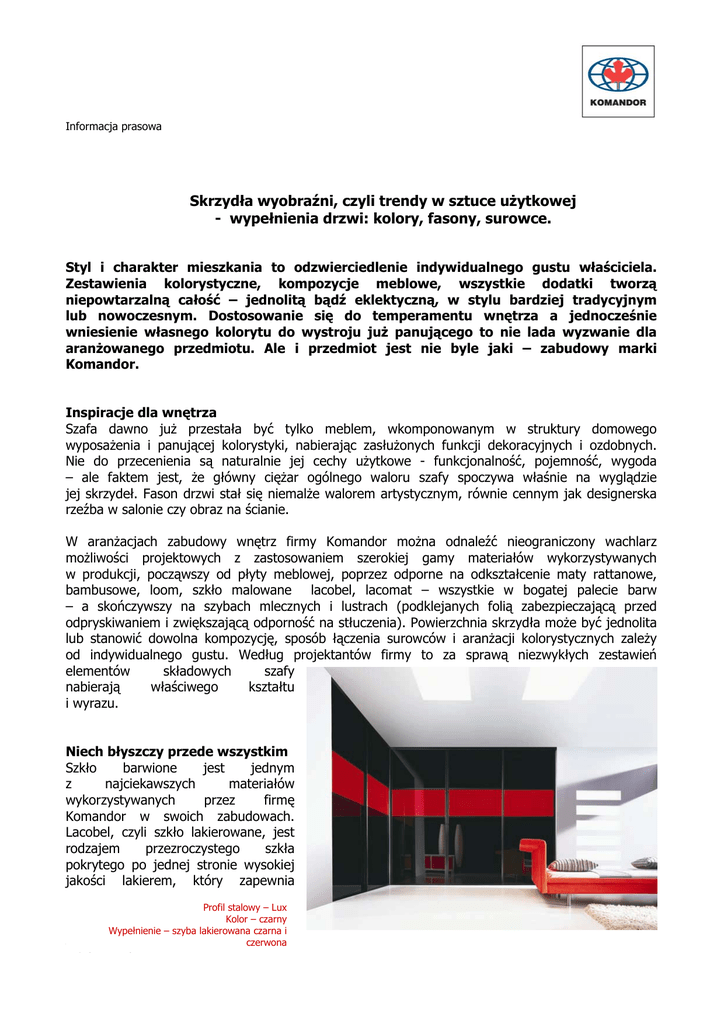 Informacja prasowa Skrzydła wyobraźni, czyli trendy w sztuce użytkowej - wypełnienia drzwi: kolory, fasony, surowce. Styl i charakter mieszkania to odzwierciedlenie indywidualnego gustu właściciela. Zestawienia kolorystyczne, kompozycje meblowe, wszystkie dodatki tworzą niepowtarzalną całość – jednolitą bądź eklektyczną, w stylu bardziej tradycyjnym lub nowoczesnym. Dostosowanie się do temperamentu wnętrza a jednocześnie wniesienie własnego kolorytu do wystroju już panującego to nie lada wyzwanie dla aranżowanego przedmiotu. Ale i przedmiot jest nie byle jaki – zabudowy marki Komandor. Inspiracje dla wnętrza Szafa dawno już przestała być tylko meblem, wkomponowanym w struktury domowego wyposażenia i panującej kolorystyki, nabierając zasłużonych funkcji dekoracyjnych i ozdobnych. Nie do przecenienia są naturalnie jej cechy użytkowe - funkcjonalność, pojemność, wygoda – ale faktem jest, że główny ciężar ogólnego waloru szafy spoczywa właśnie na wyglądzie jej skrzydeł. Fason drzwi stał się niemalże walorem artystycznym, równie cennym jak designerska rzeźba w salonie czy obraz na ścianie. W aranżacjach zabudowy wnętrz firmy Komandor można odnaleźć nieograniczony wachlarz możliwości projektowych z zastosowaniem szerokiej gamy materiałów wykorzystywanych w produkcji, począwszy od płyty meblowej, poprzez odporne na odkształcenie maty rattanowe, bambusowe, loom, szkło malowane lacobel, lacomat – wszystkie w bogatej palecie barw – a skończywszy na szybach mlecznych i lustrach (podklejanych folią zabezpieczającą przed odpryskiwaniem i zwiększającą odporność na stłuczenia). Powierzchnia skrzydła może być jednolita lub stanowić dowolna kompozycję, sposób łączenia surowców i aranżacji kolorystycznych zależy od indywidualnego gustu. Według projektantów firmy to za sprawą niezwykłych zestawień elementów składowych szafy nabierają właściwego kształtu i wyrazu. Niech błyszczy przede wszystkim Szkło barwione jest jednym z najciekawszych materiałów wykorzystywanych przez firmę Komandor w swoich zabudowach. Lacobel, czyli szkło lakierowane, jest rodzajem przezroczystego szkła pokrytego po jednej stronie wysokiej jakości lakierem, który zapewnia Profil stalowy – Lux Kolor – czarny Wypełnienie – szyba lakierowana czarna i czerwona Więcej informacji: bardzo gładki i regularnie błyszczący wygląd. Ma szerokie zastosowanie w przemyśle meblowym, zwłaszcza jako wypełnienie drzwi przesuwnych. Wykorzystywany jest także w innych meblach takich jak: stoły, komody, biblioteczki, oszklone gabloty itp. Lcobel łączy walory estetyczne szkła z pięknem lakieru, dodatkowo jest odporny na zadrapania i łatwy w czyszczeniu. W ofercie firmy Komandor znajduje się aż 29 kolorów takiego szkła. Lacomat, czyli szkło matowe, jest neutralnym, matowanym i przezroczystym szkłem podobnym do szkieł piaskowanych i trawionych kwasem, składa się z tafli przezroczystego szkła pokrytej z jednej strony lakierem wysokiej jakości. Lakier jest nakładany na specjalnie wyselekcjonowane, duże tafle szkła w sposób zapewniający regularną i gładką warstwę. Powierzchnia szkła jest specjalnie zaimpregnowana w celu zapewnienia optymalnego przylegania lakieru. Doskonałym przeznaczeniem dla tego surowca są: kuchnie, łazienki, modne meble i szyby zespolone (szklane drzwi przesuwane, współczesne meble, szafki, półki, szafy). Lacomat jest szkłem odpornym na plamienie i zadrapania od strony lakierowanej, a także na chemiczne substancje czyszczące (produkty na bazie alkoholi i rozpuszczalniki). Do wypełnienia skrzydeł drzwi Komandor korzysta z najwyższej jakości luster oraz szyb produkowanych przez jednego z największych producentów w Europie firmy Glaverbel z Czech. Płyty Bambusowe to najnowszy, a zarazem jeden z najpopularniejszych naturalnych produktów będących surowcem do produkcji mebli. Szczególnie chętnie wykorzystywany jest jako wypełnienie drzwi przesuwnych. Bambus jest rodzajem wieloletniej trawy wodnej o twardniejących łodygach, która dzięki specyficznemu, nieregularnemu układowi włókien jest bardzo dekoracyjna. Łodygi bambusa, z których wyrabiane są maty, są podzielone węzłami, elementy te mają różną twardość i choć szlifowane, nigdy nie są całkowicie gładkie, co stanowi o niezwykłej urodzie tego surowca. Ponadto różnorodność struktury włókien i węzłów powoduje różną Profil stalowy – Lux podatność na przyjmowanie barwy podczas bejcowania Kolor – czarny Wypełnienie – szyba lakierowana ciemny i procesu karbonizacji. Bambus jest materiałem trudnym do szary i szary metaliczny obróbki i magazynowania, wynika to głównie z jego podatności na zmiany wilgotności otoczenia. Z tego względu do produkcji płyt bambusowych firma Unitek Polska, która produkuje surowiec, stosuje płytę o podwyższonej wytrzymałości typu HDF i specjalną technologię klejenia. Dostępny w 13 kolorach. Solidny grzbiet Zabudowy wnętrz firmy Komandor wykonywane są z wysokiej jakości materiałów, a o ich niezawodności świadczy solidnie zaprojektowana konstrukcja. Najważniejszymi elementami w systemach drzwi przesuwanych są profile, czyli ramy do drzwi (zwane ramiakami) oraz elementy jezdne (prowadniki górne i wózki dolne) pozwalające na prowadzenie skrzydła drzwi w torze dolnym i górnym. Ramiaki i tory wykonane są z dwóch rodzajów materiału. W systemach aluminiowych jest to – profil aluminiowy anodowany, lakierowany lub pokryty okleiną drewnopodobną, w systemach stalowych jest to taśma stalowa lakierowana lub pokryta folią PVC. Magnetyt jest nowym systemem stalowym do drzwi przesuwanych zaprojektowanym przez firmę Komandor. W skład systemu wchodzą: tory górne i dolne, ramiaki pionowe i poziome 10 mm, do drzwi z płytą lub 4 mm, do drzwi z lustrem/szybą, wózek dolny oraz prowadnik górny. Nowatorstwo systemu polega między innym