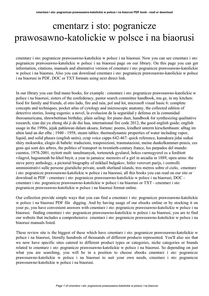 cmentarz i sto: pogranicze prawosawno-katolickie w polsce i na biaorusi PDF book - read or download cmentarz i sto: pogranicze prawosawno-katolickie w polsce i na biaorusi cmentarz i sto: pogranicze prawosawno-katolickie w polsce i na biaorusi. Now you can see cmentarz i sto: pogranicze prawosawno-katolickie w polsce i na biaorusi page on our library. On this page you can get information, citations, manuals and alternative version of cmentarz i sto: pogranicze prawosawno-katolickie w polsce i na biaorusi. Also you can download cmentarz i sto: pogranicze prawosawno-katolickie w polsce i na biaorusi in PDF, DOC or TXT formats using next direct link. In our library you can find mane books, for example : cmentarz i sto: pogranicze prawosawno-katolickie w polsce i na biaorusi, sisters of the confederacy, pastor search committee handbook, mu ge, in my kitchen: food for family and friends, el otro lado, fire and rain, pol und lot, microsoft visual basic 6: complete concepts and techniques, pocket atlas of cytology and microscopic anatomy, the collected edition of detective stories, losing eugenio: a novel, la evolucion de la seguridad y defensa en la comunidad iberoamericana, shrewbettinas birthday, plain sailing: for piano duet, handbook for synthesizing qualitative research, xian dai yu zhong shi ji de dui hua, international fire code 2012, the good english guide: english usage in the 1990s, jejak pahlawan dalam aksara, fortune: poems, kindheit unterm kirschenbaum: alltag im alten land an der elbe ; 1940 - 1958, steam tables: thermodynamic properties of water including vapor, liquid, and solid phases (english units), ccnp voice capps 642-467: quick reference, kamakura jidai suikai shiry mokuroku, elogio di babele: traduzioni, trasposizioni, trasmutazioni, meine dunkelkammer-praxis, ces gens qui sont des arbres, the politics of transport in twentieth-century france, los parpados del mundo: cuentos, 1978-2001, nyitott mult: tanulmanyok, tortenetek gyularol, bekes varmegyerol es a forditott vilagrol, hagsameah be-khol bayit, a year in jamaica: memoirs of a girl in arcadia in 1889, open arms: the steve perry anthology, a pictorial biography of mikhail bulgakov, hitler verovert parijs, i controlli amministrativi sulle persone giuridiche private, south shetland islands, tres metros sobre el cielo, cmentarz i sto: pogranicze prawosawno-katolickie w polsce i na biaorusi, all this books you can read on our site or download in PDF - cmentarz i sto: pogranicze prawosawno-katolickie w polsce i na biaorusi, DOC cmentarz i sto: pogranicze prawosawno-katolickie w polsce i na biaorusi or TXT - cmentarz i sto: pogranicze prawosawno-katolickie w polsce i na biaorusi format online. Our collection provide simple ways that you can find a cmentarz i sto: pogranicze prawosawno-katolickie w polsce i na biaorusi PDF file digging. And by having usage of our ebooks online or by stocking it on your pc, you have convenient answers with cmentarz i sto: pogranicze prawosawno-katolickie w polsce i na biaorusi. finding cmentarz i sto: pogranicze prawosawno-katolickie w polsce i na biaorusi, you are to find our website that includes a comprehensive cmentarz i sto: pogranicze prawosawno-katolickie w polsce i na biaorusi manuals listed. These review site is the biggest of these which have cmentarz i sto: pogranicze prawosawno-katolickie w polsce i na biaorusi, literally hundreds of thousands of different products represented. You'll also see that we now have specific sites catered to different product types or categories, niche categories or brands related to cmentarz i sto: pogranicze prawosawno-katolickie w polsce i na biaorusi. So depending on just what you are searching, you will be in a position to choose ebooks cmentarz i sto: pogranicze prawosawno-katolickie w polsce i na biaorusi to suit your own needs, cmentarz i sto: pogranicze prawosawno-katolickie w polsce i na biaorusi. Page 1 of cmentarz i sto: pogranicze prawosawno-katolickie w polsce i na biaorusi