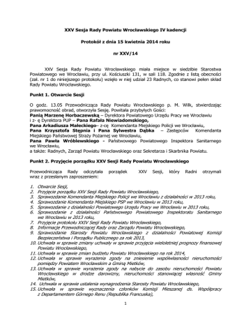 XXV Sesja Rady Powiatu Wrocławskiego IV kadencji Protokół z dnia 15 kwietnia 2014 roku nr XXV/14 XXV Sesja Rady Powiatu Wrocławskiego miała miejsce w siedzibie Starostwa Powiatowego we Wrocławiu, przy ul. Kościuszki 131, w sali 118. Zgodnie z listą obecności (zał. nr 1 do niniejszego protokołu) wzięło w niej udział 23 Radnych, co stanowi pełen skład Rady Powiatu Wrocławskiego. Punkt 1. Otwarcie Sesji O godz. 13.05 Przewodnicząca Rady Powiatu Wrocławskiego p. M. Wilk, stwierdzając prawomocność obrad, otworzyła Sesję. Powitała przybyłych Gości: Panią Marzenę Horbaczewską – Dyrektora Powiatowego Urzędu Pracy we Wrocławiu i z- ę Dyrektora PUP – Pana Rafała Niewiadomskiego, Pana Arkadiusza Małeckiego– z-cę Komendanta Miejskiego Policji we Wrocławiu, Pana Krzysztofa Stępnia i Pana Sylwestra Dąbka – Zastępców Komendanta Miejskiego Państwowej Straży Pożarnej we Wrocławiu, Pana Pawła Wróblewskiego - Państwowego Powiatowego Inspektora Sanitarnego we Wrocławiu, a także: Radnych, Zarząd Powiatu Wrocławskiego oraz Sekretarza i Skarbnika Powiatu. Punkt 2. Przyjęcie porządku XXV Sesji Rady Powiatu Wrocławskiego Przewodnicząca Rady odczytała wraz z przesłanym zaproszeniem: porządek 1. 2. 3. 4. 5. 6. XXV Sesji, który Radni otrzymali Otwarcie Sesji, Przyjęcie porządku XXV Sesji Rady Powiatu Wrocławskiego, Sprawozdanie Komendanta Miejskiego Policji we Wrocławiu z działalności w 2013 roku, Sprawozdanie Komendanta Miejskiego PSP we Wrocławiu w 2013 roku, Sprawozdanie z działalności Powiatowego Urzędu Pracy we Wrocławiu w 2013 roku, Sprawozdanie z działalności Państwowego Powiatowego Inspektoratu Sanitarnego we Wrocławiu w 2013 roku, 7. Przyjęcie protokołu XXIV Sesji Rady Powiatu Wrocławskiego, 8. Informacje Przewodniczącej Rady oraz Zarządu Powiatu Wrocławskiego, 9. Sprawozdanie Starosty Powiatu Wrocławskiego z działalności Powiatowej Komisji Bezpieczeństwa i Porządku Publicznego za rok 2013, 10. Uchwała w sprawie zmiany uchwały w sprawie przyjęcia wieloletniej prognozy finansowej Powiatu Wrocławskiego, 11. Uchwała w sprawie zmian budżetu Powiatu Wrocławskiego na rok 2014, 12. Uchwała w sprawie wyrażenia zgody na zniesienie współwłasności nieruchomości pomiędzy Powiatem Wrocławskim a Gminą Mietków, 13. Uchwała w sprawie wyrażenia zgody na nabycie do zasobu nieruchomości Powiatu Wrocławskiego w drodze darowizny, nieruchomości stanowiącej własność Gminy Mietków, 14. Uchwała w sprawie ustalenia wynagrodzenia Starosty Powiatu Wrocławskiego, 15. Uchwała w sprawie wyznaczenia członków Komisji Mieszanej ds. Współpracy z Departamentem Górnego Renu (Republika Francuska), 1 16. Uchwała zmieniająca uchwałę Nr XXIX/251/10 Rady Powiatu Wrocławskiego z dnia 21 października 2010 r. w sprawie uchwalenia Statutu Powiatu Wrocławskiego, 17. Uchwała w sprawie określenia zadań i wysokości środków Państwowego Funduszu Rehabilitacji Osób Niepełnosprawnych przeznaczonych dla Powiatu Wrocławskiego na realizację zadań w ramach rehabilitacji zawodowej i społecznej w roku 2014, 18. Przedstawienie „Oceny Zasobów Pomocy Społecznej w Powiecie Wrocławskim”, 19. Sprawozdania z prac komisji stałych Rady Powiatu Wrocławskiego w 2013 roku, 20. Interpelacje i zapytania Radnych, 21. Wnioski i oświadczenia, 22. Zamknięcie XXV Sesji Rady Powiatu Wrocławskiego. Porządek XXV Sesji został przyjęty jednogłośnie. Punkt 3,4,5,6. Zostały przedstawione sprawozdania: Sprawozdanie Komendanta Miejskiego Państwowej Straży Pożarnej we Wrocławiu w 2013 roku – przedstawił mł. bryg. mgr inż. Krzysztof Stępień – z-ca Komendanta Miejskiego PSP we Wrocławiu; Sprawozdanie Komendanta Miejskiego Policji we Wrocławiu z działalności w 2013 roku - przedstawił podinsp. Arkadiusz Małecki – z-ca Komendanta Miejskiego Policji we Wrocławiu; Sprawozdanie z działalności Powiatowego Urzędu Pracy we Wrocławiu w 2013 roku – przedstawiła p. Marzena Horbaczewska – dyrektor PUP we Wrocławiu; Sprawozdanie z działalności Państwowego Powiatowego Inspektoratu Sanitarnego we Wrocławiu w 2013 roku – przedstawił p. Paweł Wróblewski Państwowy Powiatowy Inspektor Sanitarny we Wrocławiu. Pani Przewodnicząca Rady i Pan Starosta złożyli podziękowania w imieniu Rady i Zarządu Powiatu Wrocławskiego za współpracę w 2013 roku. O godz. 14.05 Przewodnicząca Rady ogłosiła 10 min. przerwę. Po przerwie, o godz.14.15 wznowiono obrady. Na salę obrad nie powrócili Radni: A. Szawan, E. Skiba, K. Dworak i D. Galant. Punkt 7. Przyjęcie protokołu XXIV Sesji Rady Powiatu Wrocławskiego Protokół z XXIV Sesji Rady Powiatu Wrocławskiego z dn. 30 stycznia 2014 r. został przyjęty jednogłośnie. Punkt 8. Informacje Przewodniczącej Rady oraz Zarządu Powiatu Wrocławskiego Przewodnicząca Rady poinformowała, że na stolikach przed Radnymi zostały wyłożone płyty z nagraniem 7 sprawozdań z działalności służb, inspekcji i straży za 2013 rok, w tym: Sprawozdania z pracy PCPR we Wrocławiu wraz z wykazem potrzeb w zakresie pomocy społecznej. Płyta zawiera również Sprawozdanie z realizacji Programu Współpracy Powiatu Wrocławskiego z organizacjami pozarządowymi i innymi podmiotami prowadzącymi działalność pożytku publicznego w 2013 roku, a także Sprawozdanie z efektów pracy 2 organizatora rodzinnej pieczy zastępczej w roku 2013. Sprawozdania te zostały złożone na mocy odrębnych przepisów. Pani Przewodnicząca przypomniała, że w dniu dzisiejszym zostały przedstawione sprawozdania: z działalności Komendy Miejskiej Policji we Wrocławiu, Komendy Miejskiej Państwowej Straży Pożarnej we Wrocławiu, Powiatowego Urzędu Pracy i Państwowego Powiatowego Inspektora Sanitarnego we Wrocławiu. Zapowiedziała, że w razie pytań odnośnie pozostałych sprawozdań, poprosi o głosy w punkcie: Wnioski i oświadczenia. Następnie Pani Przewodnicząca poinformowała, że w