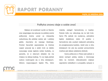 RAPORT PORANNY PIĄTEK, 22 WRZEŚNIA 2006 Polityka znowu daje o sobie znać Słabsze od oczekiwań wyniki ze Stanów management miałoby zastąpić Samoobronę w koalicji. oraz zaogniająca się sytaucja na polskiej scenie Pytanie tylko czy zdecydują się na taki krok. politycznej Samo PSL jednak nie wystarczy, potrzebne można uznać za mieszankę wybuchową dla polskiej waluty jak i polskiej będzie giełdy. lokalnego. Samoobrony aby uzyskać większość potrzebną Premier Kaczyński zapowiedział, że Andrzej do przegłosowania budżetu. Jeżeli wiec w dniu Lepper posunął się o jeden krok za daleko dzisiejszym nie uda się uzyskać porozumienia wysuwając swoje żądania wobec budżetu, co możliwe jest dalsze osłabienie złotówki. Zacznijmy do naszego dodatkowo około 10 posłów z sprawiło, że w obecnym składzie nie ma Scena polityczna w Polsce jest jednak w miejsca na dalszą koalicję. To czy będą jednak stanie wytrącić polską walutę z równowagi wybory rozstrzygnie się w dniu dzisiejszym. tylko Główny zagrożenie widziałbym w przypadku sytuacji w rozgrywającym będzie PSL, które na moment. Zdecydowanie większe 1 Telefon: +48 (22) 860 65 10 [email protected] Ul.Stawki2 00-193 Warszawa Przedstawione, w raporcie, poglądy, oceny i wnioski są wyrazem osobistych poglądów autorów i nie mają charakteru rekomendacji autora lub serwisu www.fmcm.pl do nabycia lub zbycia albo powstrzymania się od dokonania transakcji w odniesieniu do jakichkolwiek walut lub papierów wartościowych. Poglądy te jak i inne treści raportów nie stanowią" lub "doradztwa" w rozumieniu ustawy z dnia 21 sierpnia 1997r. Prawo o publicznym obrocie papierami wartościowymi (Dz. U. Nr 118, poz. 754, z późn. zm.) Wyłączną odpowiedzialność za decyzje inwestycyjne, podjęte lub zaniechane na podstawie raportu lub z wykorzystaniem wniosków w nim zawartych, ponosi inwestor. Autorzy serwisu są również właścicielem majątkowych praw autorskich do raportów. W szczególności zabronione jest kopiowanie, przedrukowywanie, udostępnianie osobom trzecim i rozpowszechnianie raportów w całości lub we fragmentach bez zgody autorów serwisu. P IĄT EK, 22 WRZ EŚ N I A 2 0 06 Wczorajsze wyniki (oczekiwano 18, gdzie maksymalna wartość to makro dałe kolejne oznaki, że gospodarka 100, a minimalna -100). Kurs EURUSD wzrósł z największego światowego mocarstwa przeżywa 1,2720 w okolice 1,28. Stanach Zjednoczonych. znaczne kłopoty. Poniżej oczekiwań wyszły Tak więc w dzisiejszym dane z rynku pracy (wzrost nowych podań o najważniejsze zasiłki do 318 000, oczekiwano 310 000). O politycznej a także dalszy przebieg sytuacji na 0,2% wyprzedzający EURUSD. Wczorajsza wyprzedaż dolara może koniunktury (Leading Indicators – oczekiwano okazać się jednak chwilowa. W przypadku spadku o 0,1%. Jednak największe ruchy wyprzedaży nastąpiły dopiero wieczorem po publikacji kapitał może płynąć do Stanów, które to przez indeksu koniunktury w Rejonie Filadelfii, który wielu uważane są jako bezpieczne miejsce w spadł po raz pierwszy od 3 lat poniżej 0 do -0,4 gorszych cyklach koniunkturalnych.. spadł wskaźnik będą dniu na wydarzenia rynkach na scenie rozwijających się Tomasz Porada Godzina publikacji Wskaźnik Kraj Wartość oczekiwana Poprzednia wartość 14:00 Inflacja netto Polska 1,30% 1,30% 2 management Telefon: +48 (22) 860 65 10 [email protected] Ul.Stawki2 00-193 Warszawa