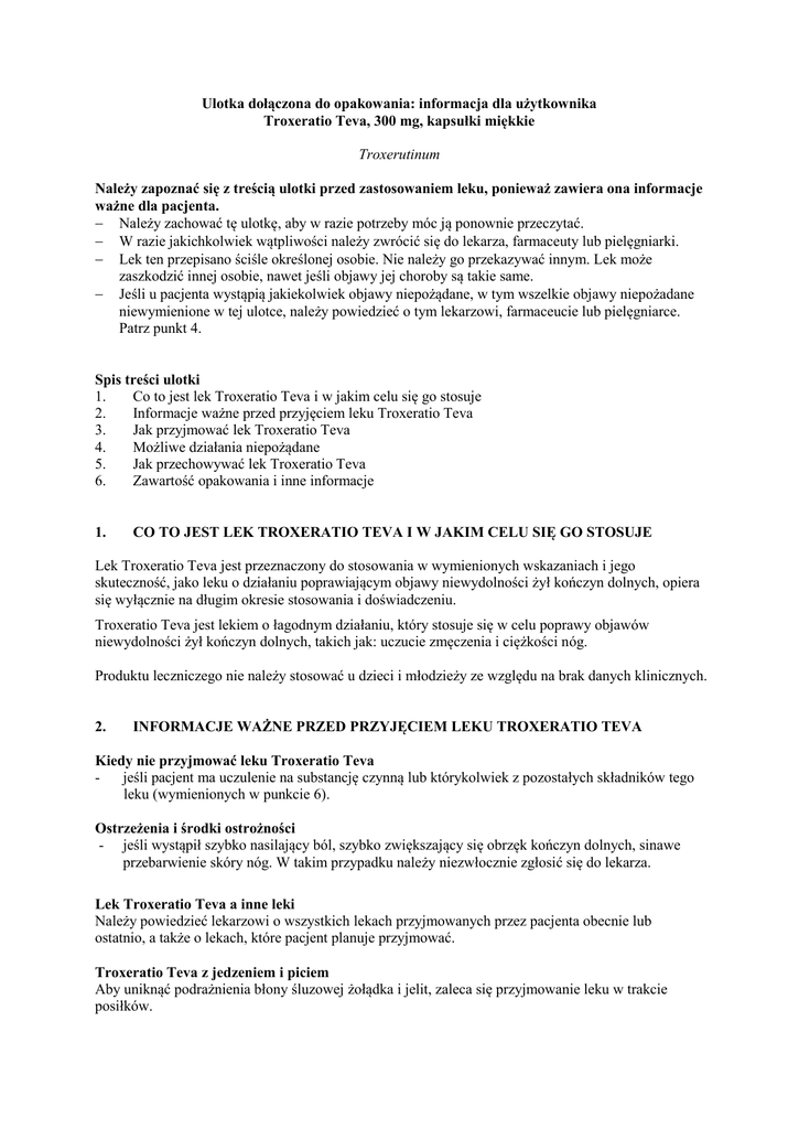 Ulotka dołączona do opakowania: informacja dla użytkownika Troxeratio Teva, 300 mg, kapsułki miękkie Troxerutinum Należy zapoznać się z treścią ulotki przed zastosowaniem leku, ponieważ zawiera ona informacje ważne dla pacjenta. Należy zachować tę ulotkę, aby w razie potrzeby móc ją ponownie przeczytać. W razie jakichkolwiek wątpliwości należy zwrócić się do lekarza, farmaceuty lub pielęgniarki. Lek ten przepisano ściśle określonej osobie. Nie należy go przekazywać innym. Lek może zaszkodzić innej osobie, nawet jeśli objawy jej choroby są takie same. Jeśli u pacjenta wystąpią jakiekolwiek objawy niepożądane, w tym wszelkie objawy niepożadane niewymienione w tej ulotce, należy powiedzieć o tym lekarzowi, farmaceucie lub pielęgniarce. Patrz punkt 4. Spis treści ulotki 1. Co to jest lek Troxeratio Teva i w jakim celu się go stosuje 2. Informacje ważne przed przyjęciem leku Troxeratio Teva 3. Jak przyjmować lek Troxeratio Teva 4. Możliwe działania niepożądane 5. Jak przechowywać lek Troxeratio Teva 6. Zawartość opakowania i inne informacje 1. CO TO JEST LEK TROXERATIO TEVA I W JAKIM CELU SIĘ GO STOSUJE Lek Troxeratio Teva jest przeznaczony do stosowania w wymienionych wskazaniach i jego skuteczność, jako leku o działaniu poprawiającym objawy niewydolności żył kończyn dolnych, opiera się wyłącznie na długim okresie stosowania i doświadczeniu. Troxeratio Teva jest lekiem o łagodnym działaniu, który stosuje się w celu poprawy objawów niewydolności żył kończyn dolnych, takich jak: uczucie zmęczenia i ciężkości nóg. Produktu leczniczego nie należy stosować u dzieci i młodzieży ze względu na brak danych klinicznych. 2. INFORMACJE WAŻNE PRZED PRZYJĘCIEM LEKU TROXERATIO TEVA Kiedy nie przyjmować leku Troxeratio Teva jeśli pacjent ma uczulenie na substancję czynną lub którykolwiek z pozostałych składników tego leku (wymienionych w punkcie 6). Ostrzeżenia i środki ostrożności - jeśli wystąpił szybko nasilający ból, szybko zwiększający się obrzęk kończyn dolnych, sinawe przebarwienie skóry nóg. W takim przypadku należy niezwłocznie zgłosić się do lekarza. Lek Troxeratio Teva a inne leki Należy powiedzieć lekarzowi o wszystkich lekach przyjmowanych przez pacjenta obecnie lub ostatnio, a także o lekach, które pacjent planuje przyjmować. Troxeratio Teva z jedzeniem i piciem Aby uniknąć podrażnienia błony śluzowej żołądka i jelit, zaleca się przyjmowanie leku w trakcie posiłków. Ciąża i karmienie piersią Przed zastosowaniem każdego leku należy poradzić się lekarza lub farmaceuty. Ciąża Nie należy stosować leku Troxeratio Teva w okresie ciąży. Karmienie piersią Nie zaleca się stosowania leku Troxeratio Teva u kobiet karmiących piersią. Prowadzenie pojazdów i obsługiwanie maszyn Lek Troxeratio Teva nie ma wpływu na zdolność prowadzenia pojazdów i obsługiwanie maszyn. Ważne informacje o niektórych składnikach leku Troxeratio Teva Jeśli lekarz poinformował o nietolerancji niektórych cukrów, należy skonsultować się z lekarzem przed rozpoczęciem stosowania tego leku. 3. JAK PRZYJMOWAĆ LEK TROXERATIO TEVA W przypadku wątpliwości dotyczący stosowania leku Troxeratio Teva należy skontaktować się z lekarzem lub farmaceutą. Zazwyczaj stosowana dawka leku Troxeratio Teva, to 1 kapsułka miękka (300 mg trokserutyny) raz na dobę. Czas leczenia zależy od rodzaju zaburzeń, ich nasilenia i przebiegu. Lek w zalecanej dawce może być stosowany długotrwale. Kapsułki miękkie należy przyjmować w całości, popijając odpowiednią ilością płynu (np. szklanka wody). Przyjęcie większej niż zalecana dawki leku Troxeratio Teva Nie zgłoszono żadnego przypadku przedawkowania. Pominięcie przyjęcia leku Troxeratio Teva Nie należy stosować dawki podwójnej w celu uzupełnienia pominiętej kapsułki. W razie wątpliwości związanych ze stosowaniem leku należy zwrócić się do lekarza lub farmaceuty. 4. MOŻLIWE DZIAŁANIA NIEPOŻĄDANE Jak każdy lek, lek Troxeratio Teva może powodować działania niepożądane, chociaż nie u każdego one wystąpią. Prawdopodobieństwo wystąpienia działań niepożądanych jest następujące: Bardzo częste: u więcej niż 1 na 10 pacjentów Częste: u mniej niż 1 na 10 pacjentów, ale u więcej niż 1 na 100 pacjentów Niezbyt częste: u mniej niż 1 na 100, ale u więcej niż 1 na 1000 pacjentów Rzadkie: u mniej niż 1 na 1000 pacjentów, ale u więcej niż 1 na 10 000 pacjentów Bardzo rzadkie: u mniej niż 1 na 10 000 pacjentów, w tym pojedyncze przypadki Rzadko mogą wystąpić: skórne reakcje alergiczne, nagłe zaczerwienienie twarzy, biegunka, zaparcia, bóle głowy. Jeśli wystąpią jakiekolwiek objawy niepożądane, w tym wszelkie objawy niepożądane niewymienione w ulotce, należy powiedzieć o tym lekarzowi, farmaceucie lub pielęgniarce. Działania niepożądane można zgłaszać bezpośrednio do Departamentu Monitorowania Niepożądanych Działań Produktów Leczniczych Urzędu Rejestracji Produktów Leczniczych, Wyrobów Medycznych i Produktów Biobójczych Al. Jerozolimskie 181C, 02-222 Warszawa Tel: + 48 22 49 21 301 Fax: + 48 22 49 21 309 e-mail: [email protected]. Działania niepożądane można zglaszać rownież podmiotowi odpowiedzialnemu. Dzięki zgłaszaniu działań niepożądanych można będzie zgromadzić więcej informacji na temat bezpieczeństwa stosowania leku. 5. JAK PRZECHOWYWAĆ LEK TROXERATIO TEVA Przechowywać w miejscu niedostępnym i niewidocznym dla dzieci. Przechowywać w temperaturze poniżej 25ºC. Chronić od wilgoci. Nie stosować leku Troxeratio Teva po upływie terminu ważności zamieszczonego na opakowaniu. Termin ważności oznacza ostatni dzień danego miesiąca. Leków nie należy wyrzucać do kanalizacji ani domowych pojemników na odpadki. Należy zapytać farmaceutę co zrobić z lekami, których się już nie potrzebuje. Takie postępowanie 