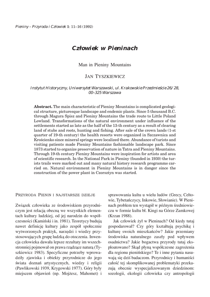 Pieniny – Przyroda i Człowiek 1: 11–16 (1992) Człowiek w Pieninach Man in Pieniny Mountains JAN TYSZKIEWICZ Instytut Historyczny, Uniwersytet Warszawski, ul. Krakowskie Przedmieście 26/28, 00–325 Warszawa Abstract. The main characteristic of Pieniny Mountains is complicated geological structure, picturesque landscape and endemic plants. Since 5 thousand B.C. through Magura Spisz and Pieniny Mountains the trade route to Little Poland Lowland. Transformations of the natural environment under influence of the settlements started as late as the half of the 13-th century as a result of clearing land of stubs and roots, hunting and fishing. After sale of the crown lands (1-st quarter of 19-th century) the health resorts were organized in Szczawnica and Krościenko since mineral springs were localized there. Abundance of turists and visiting patients made Pieniny Mountains fashionable landscape park. Since 1873 started to organize preservation of nature in Tatra and Pieniny Mountains. Through 19-th century Pieniny Mountains were inspiration for artists and area of scientific research. In the National Park in Pieniny (founded in 1930) the turists trails were marked out and many natural history research programms carried on. Natural environment in Pieniny Mountains is in danger since the construction of the power plant in Czorsztyn was started. PRZYRODA PIENIN I NAJSTARSZE DZIEJE Zwia˛zek człowieka ze środowiskiem przyrodniczym jest relacja˛ obecna˛ we wszystkich elementach kultury ludzkiej, od jej narodzin do współczesności (Kamiński i in. 1981). Teoretycy buduja˛ nawet definicje˛ kultury jako zespół społecznie wytworzonych praktyk, narze˛dzi i wiedzy przystosowuja˛cych grupe˛ ludzka˛ do otoczenia. Inwencja człowieka dawała lepsze rezultaty im wszechstronniej pojmował on prawa rza˛dza˛ce natura˛ (Tyszkiewicz 1983). Specyficzne potrzeby wprowadziły zjawiska i obiekty przyrodnicze do jego świata doznań artystycznych, wiedzy i religii (Pawlikowski 1939, Krygowski 1977). Góry były miejscem objawień (np. Mojżesz, Mahomet) i sprawowania kultu u wielu ludów (Grecy, Celtowie, Tybetańczycy, Inkowie, Słowianie). W Pieninach problem ten wysta˛pił w późnym średniowieczu w formie kultu bł. Kingi na Górze Zamkowej (Krzan 1988). Jak człowiek żył w Pieninach? Od kiedy tutaj gospodarował? Czy góry kształtuja˛ psychike˛ i kulture˛ swoich mieszkańców? Jakie przemiany środowiska naturalnego zaszły pod wpływem osadnictwa? Jakie bogactwa przyrody tutaj eksploatowano? Ska˛d płyna˛ współczesne zagrożenia dla regionu pienińskiego? Te i inne pytania nasuwaja˛ sie˛ dziś badaczom. Przyrodnicy i humaniści całość tej skomplikowanej problematyki przekazuja˛ obecnie wyspecjalizowanym dziedzinom: sozologii, ekologii człowieka czy antropologii 12 J. Tyszkiewicz – Człowiek w Pieninach kulturowej. Ale moga˛ one zastosować nowe metody tylko dlatego, że od półtora wieku trwa praca uczonych różnych specjalności w Pieninach. Bez naukowej rejestracji dawnego i obecnego stanu środowiska żadne studia relacji człowiek – środowisko nie sa˛ do pomyślenia. Sta˛d płynie duże znaczenie badań historycznych w najszerszym rozumieniu, prowadzonych przez palinologów czy leśników, archeologów czy etnografów. Chodzi tu o odkrywanie nowych faktów lub ich ła˛czenie z różnego typu zapisów (źródła przyrodnicze, pisane, wykopaliska, zabytki, nazwy) (Tyszkiewicz 1981). Mały teren Pienin kryje nadal wiele tajemnic o dawnej przyrodzie i człowieku. Ślady pobytu ludzi w Pieninach sie˛gaja˛ starszej epoki kamienia (Parczewski 1974) i pochodza˛ mie˛dzy innymi z Jaskini Aksamitka w Haligovcach (paleolit górny, 35 tys. lat p.n.e.). Badania geologiczne, archeologiczne i paleobotaniczne pozwoliły poznać najważniejsze cechy środowiska przyrodniczego plejstocenu Tatr i Pienin (Obidowicz 1986–1990). Podczas ocieplenia w tzw. Alleröd (optimum: 10800–10000 p.n.e.) las iglasty (limba, sosna, świerk) z domieszka˛ odporniejszych gatunków liściastych wkroczył na wysokość ok. 1000–1100 m n.p.m. W dolinach rozkrzewiły sie˛ leszczyny, wia˛z, lipa, olsza i da˛b (Środoń 1982). Wówczas przybyła ludność kultury magdaleńskiej i gospodarowała tutaj do 7000–6000 p.n.e. Jej obozowiska, gdzie robiono narze˛dzia z miejscowego radiolarytu, znajdowały sie˛ w Sromowcach Wyżnych – Ka˛tach, u wylotu Macelowego Potoku, a kilka mniejszych w dolinie rz. Łapszanki (Rydlewski 1989). Urozmaicona rzeźba terenu, wilgotność, nasłonecznienie, gleby, stwarzały w Pieninach duża˛ różnorodność siedliskowo-ekologiczna˛. Ludność paleolityczna okresowo znajdowała w Pieninach ostoje˛, przemierzaja˛c wielkie odległości i wymieniaja˛c mie˛dzy soba˛ potrzebny surowiec krzemienny. W Sromowcach Wyżnych prócz narze˛dzi z radiolarytu i rogowca pienińskiego (97.86%) znaleziono wytwory z krzemienia bałtyckiego, czekoladowego, jurajskiego podkrakowskiego oraz kredowego z Wołynia. Radiolarytowe zaś wyroby stwierdzono w okolicach Krakowa. Później Pieniny i Magura Spiska znalazły sie˛ na szlaku z południa na północ, biegna˛cego wzdłuż Popradu, Spiszem, Podhalem i z biegiem Dunajca. Rolnicza ludność kultury ceramiki wste˛gowej rytej (4500–4000 p.n.e.) z zachodniej Słowacji, przez Spisz (Žehra) sprowadzała krzemień jurajski (Sa˛spów k. Krakowa) i czekoladowy (Tomaszów k. Radomia). Komunikacji wodnej służył zapewne Poprad i Dunajec, skoro materiały kultury bukowogórskiej znaleziono na Spiszu słowackim, pod Starym Sa˛czem i wokół Krakowa (Lech 1988, Kaczanowski 1990). Inne nieliczne zabytki neolityczne (4500–1800 p.n.e.) i z epoki bra˛zu (1800–700 p.n.e.) gromadza˛ sie˛ również na wskazanym szlaku, w okre˛gu Spišska Nova Ves, we Frydmanie, Krościenku, Szlachtowej, Tylmanowej i Maszkowicach nad Dunajcem (Kołodziejski i in. 1982, Valde-Nowak 1989). W Spišskych Tomašovcach odnaleziono pojedyncz