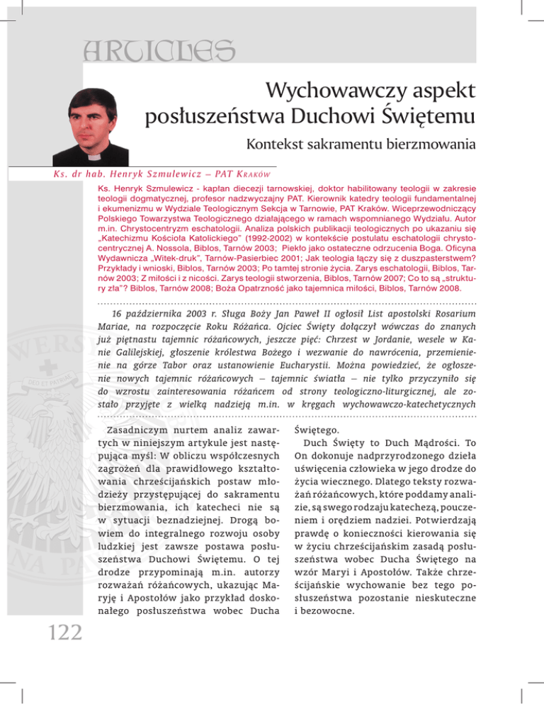 ARTICLES Wychowawczy aspekt posłuszeństwa Duchowi Świętemu Kontekst sakramentu bierzmowania K s . dr hab. Henr yk Szmule w ic z – PAT K r a k ó w Ks. Henryk Szmulewicz - kapłan diecezji tarnowskiej, doktor habilitowany teologii w zakresie teologii dogmatycznej, profesor nadzwyczajny PAT. Kierownik katedry teologii fundamentalnej i ekumenizmu w Wydziale Teologicznym Sekcja w Tarnowie, PAT Kraków. Wiceprzewodniczący Polskiego Towarzystwa Teologicznego działającego w ramach wspomnianego Wydziału. Autor m.in. Chrystocentryzm eschatologii. Analiza polskich publikacji teologicznych po ukazaniu się „Katechizmu Kościoła Katolickiego” (1992-2002) w kontekście postulatu eschatologii chrystocentrycznej A. Nossola, Biblos, Tarnów 2003; Piekło jako ostateczne odrzucenia Boga. Oficyna Wydawnicza „Witek-druk”, Tarnów-Pasierbiec 2001; Jak teologia łączy się z duszpasterstwem? Przykłady i wnioski, Biblos, Tarnów 2003; Po tamtej stronie życia. Zarys eschatologii, Biblos, Tarnów 2003; Z miłości i z nicości. Zarys teologii stworzenia, Biblos, Tarnów 2007; Co to są „struktury zła”? Biblos, Tarnów 2008; Boża Opatrzność jako tajemnica miłości, Biblos, Tarnów 2008. 16 października 2003 r. Sługa Boży Jan Paweł II ogłosił List apostolski Rosarium Mariae, na rozpoczęcie Roku Różańca. Ojciec Święty dołączył wówczas do znanych już piętnastu tajemnic różańcowych, jeszcze pięć: Chrzest w Jordanie, wesele w Kanie Galilejskiej, głoszenie królestwa Bożego i wezwanie do nawrócenia, przemienienie na górze Tabor oraz ustanowienie Eucharystii. Można powiedzieć, że ogłoszenie nowych tajemnic różańcowych – tajemnic światła – nie tylko przyczyniło się do wzrostu zainteresowania różańcem od strony teologiczno-liturgicznej, ale zostało przyjęte z wielką nadzieją m.in. w kręgach wychowawczo-katechetycznych Zasadniczym nurtem analiz zawartych w niniejszym artykule jest następująca myśl: W obliczu współczesnych zagrożeń dla prawidłowego kształtowania chrześcijańskich postaw młodzieży przystępującej do sakramentu bierzmowania, ich katecheci nie są w sytuacji beznadziejnej. Drogą bowiem do integralnego rozwoju osoby ludzkiej jest zawsze postawa posłuszeństwa Duchowi Świętemu. O tej drodze przypominają m.in. autorzy rozważań różańcowych, ukazując Maryję i Apostołów jako przykład doskonałego posłuszeństwa wobec Ducha 122 Świętego. Duch Święty to Duch Mądrości. To On dokonuje nadprzyrodzonego dzieła uświęcenia człowieka w jego drodze do życia wiecznego. Dlatego teksty rozważań różańcowych, które poddamy analizie, są swego rodzaju katechezą, pouczeniem i orędziem nadziei. Potwierdzają prawdę o konieczności kierowania się w życiu chrześcijańskim zasadą posłuszeństwa wobec Ducha Świętego na wzór Maryi i Apostołów. Także chrześcijańskie wychowanie bez tego posłuszeństwa pozostanie nieskuteczne i bezowocne. ARTYKUŁY Jedną z prawd, którą podejmują autorzy rozważań różańcowych jest właśnie droga posłuszeństwa wobec Ducha Świętego. Czynią to najczęściej w kontekście trzeciej tajemnicy części chwalebnej: „Zesłanie Ducha Świętego”. Szczególnie w świetle tej tajemnicy ukazuje się wyjątkowa rola Maryi jako Matki i wychowawczyni uczniów Chrystusowych. Podjęta w niniejszym studium analiza wybranych dwudziestu fragmentów rozważań różańcowych, odnoszących się do tajemnicy „Zesłania Ducha Świętego”, będzie próbą zaakcentowania roli posłuszeństwa Duchowi Świętemu w wybranych aspektach wychowania młodzieży w kontekście sakramentu bierzmowania. I. POGŁĘBIAJĄC OSOBISTĄ WIĘŹ Z JEZUSEM 1. NAWRÓCENIE Boży ogień ogarnął ziemię. Jego płomienie unoszą się nad Apostołami. Boży wicher napełnił okrąg ziemi. Ogień i wicher. Siła i moc. To Chrystus zesłał Ducha Świętego i odnowił oblicze ziemi. I dziś potrzeba światu Bożych mocy. Ale, by je otrzymać, trzeba poddać się działaniu Bożego wichru, rozpalić Bożym ogniem, przełamać barierę strachu, wyjść poza drzwi bezpiecznego na pozór wieczernika, którym może być utarty styl myślenia, sposób życia, wygodnictwo, bierne czekanie na to, że ktoś nas zbawi, zamiast autentycznej troski o zbawienie własne i innych1. Tajemnicze zjawiska towarzyszące zesłaniu Ducha Świętego mają swoją symboliczną wymowę. Ogień, wicher, cud mówienia językami – zaabsorbowały uwagę obserwatorów. Jednak istotne znaczenie miało to, co działo się na sposób niewidzialny: wewnętrzna przemiana. Uderzenie gwałtownego wichru obrazuje działanie Ducha Świętego w ciszy ludzkiego serca. Wiatr to siła, która potrafi wszędzie dotrzeć. Podobnie nieograniczone jest działanie Ducha Świętego, za pośrednictwem którego człowiek, jeśli będzie tej sile posłuszny, otrzymuje udział w zbawczej tajemnicy Chrystusa i dostępuje zbawienia. Duch Święty, który objawił się w postaci języków ognia, dokonał głębokiej przemiany przede wszystkim samych uczniów Chrystusa. Było to zgodne z obietnicą daną im przez: „On was wszystkiego nauczy i przypomni wam wszystko, co Ja wam powiedziałem” (J 14,26). Serca uczniów zostały rozgrzane i umocnione do walki z grzechem i wsparte do okazywania miłości. W symbolice biblijnej ogień oczyszcza duszę człowieka z jego grzechów i umacnia do świadczenia prawdy. Boża moc uczyniła z Apostołów i uczniów Jezusa wewnętrznie przemienionych głosicieli radości zmartwychwstania 2. Znaki wiatru i ognia oznaczały obecność Boga i Jego działania. Jeśli i dzisiaj to oczyszczające z brudu grzechu działanie ma rzeczywiście dotrzeć do serc młodzieży nieodzowne jest to, aby to działanie spotkało się z taką samą postawą, jak w Dniu Pięćdziesiątnicy reprezentowali uczniowie zgromadzeni w Wieczerniku: szczere nawrócenie serca w duchu posłuszeństwa Duchowi Świętemu. 2. ŚWIĘTOŚĆ Aby stać 