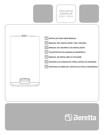 EXCLUSIVE GREEN HE C.S.I. - R.S.I. EN INSTALLER AND USER MANUAL ES MANUAL DEL INSTALADOR Y DEL USUARIO PT MANUAL DO USUÁRIO E DO INSTALADOR HU TELEPÍTŐI ÉS FELHASZNÁLÓI KÉZIKÖNYV RO MANUAL DE INSTALARE SI UTILIZARE SI NAVODILA ZA VGRADITEV, PRIKLJUČITEV IN UPORABO PL INSTRUKCJA OBSŁUGI I INSTALACJI KOTŁA GAZOWEGO EXCLUSIVE GREEN HE C.S.I. - EXCLUSIVE GREEN HE R.S.I. EN ES PT HU RO SI PL EXCLUSIVE GREEN boiler complies with basic requirements of the following Directives: Gas directive 2009/142/EEC; Yield directive 92/42/ EEC; Electromagnetic compatibility directive 2004/108/EEC; Low-voltage directive 2006/95/EEC; Regulation 677 for condensation boilers. Thus, it is EC-marked. La caldera EXCLUSIVE GREEN cumple con los requisitos básicos de las siguientes Directivas: Directiva Gas 2009/142/EEC; Directiva rendimiento 92/42/EEC; Directiva compatibilidad electromagnética 2004/108/EEC; Directiva baja tensión 2006/95/EEC; Regulación 677 para calderas de condensación. Por lo tanto, tiene el marcado CE. EN Installer’s-user’s manual................................................................................4 Boiler operating elements..........................................................................121 Hydraulic circuit.........................................................................................122 Electric diagrams.......................................................................................124 Circulator residual head.............................................................................131 ES Installer’s-user’s manual................................................................................4 Boiler operating elements..........................................................................121 Hydraulic circuit.........................................................................................122 Electric diagrams.......................................................................................124 PT Installer’s-user’s manual................................................................................4 Boiler operating elements..........................................................................121 Hydraulic circuit.........................................................................................122 Electric diagrams.......................................................................................124 HU Telepítői kézikönyv-felhasználói kézikönyv..................................................64 A kazán funkcionális alkatrészei................................................................121 Vízkeringetés.............................................................................................122 Villamos kapcsolási rajz............................................................................124 RO Manual instalator-utilizator...........................................................................84 Elemenetele functionale ale centralei........................................................121 Circuit hidraulic..........................................................................................122 Scheme electrice.......................................................................................124 Kotel EXCLUSIVE GREEN ustreza temeljnim zahtevam Naslednjih Uredb: Uredba o plinu 2009/142/CEE; Uredba o izkoristkih92/42/CEE; Uredba o elektromagnetni ustreznosti 2004/108/CEE; Uredba o nizki napetosti 2006/95/CEE; Uredba o kondenzacijskih kotlih 677. Torej nosi oznako CE. SI Navodila za vgraditelja-uporabo....................................................................4 Sestavni deli kotla......................................................................................105 Hidravlična napeljava.................................................................................106 Električna shema.......................................................................................108 Kocioł EXCLUSIVE GREEN HE spełnia podstawowe wymagania następujących dyrektyw : - Urządzenia spalające paliwa gazowe 2009/142/EEC; Sprawność energetyczna kotłów wodnych 92/42/EEC; Kompatybilność energetyczna 2004/108/EEC; Niskonapięciowe wyroby elektryczne 2006/95/EEC; Norma dotycząca kotłów kondensacyjnych 677; I w związku z powyższym posiada znak CE PL Instrukcja instalacji i użytkowania..................................................................4 Budowa kotła............................................................................................. 28 Obieg hydrauliczny.................................................................................... 29 Schematy elektryczne............................................................................... 31 A caldeira EXCLUSIVE GREEN é compatível com as especificações básicas das seguintes Directivas: Directiva de gás 2009/142/EEC; Directiva de rendimento 92/42/EEC; Directiva de compatibilidade electromagnética 2004/108/EEC; Directiva de baixa tensão 2006/95/EEC; Regulação 677 para caldeiras de condensação. Assim, é marcada com EC. Az EXCLUSIVE GREEN kazán teljesíti az alábbi irányelvek lényegi követelményeit: 2009/142/EGK sz. gáz irányelv; 92/42/EGK sz. irányelv a vízmelegítő kazánokról; 2004/108/EGK sz. irányelv az elektromágneses összeférhetőségről; 2006/95/EGK sz. irányelv a kisfeszültségű berendezésekről; Kondenzációs kazánokra vonatkozó 677 sz. szabvány. Így jogosan viseli a CE-jelet. Centrala EXCLUSIVE GREEN este fabricata in conformitate cu cerintele urmatoarelor Directive: Directiva gaz 2009/142/EEC; Directiva eficienta 92/42/EEC; Directiva compatibilitate electromagnetica 2004/108/EEC; Directiva voltaj redus 2006/95/EEC; Regulamentul 677 referitor la boilerele cu condensare. Prin urmare, este marcat cu simbolul CE. 0694 BU1240 RANGE RATED Esta caldera puede adaptarse a los requisitos de calefacción del sistema, es posible cambiar la potencia