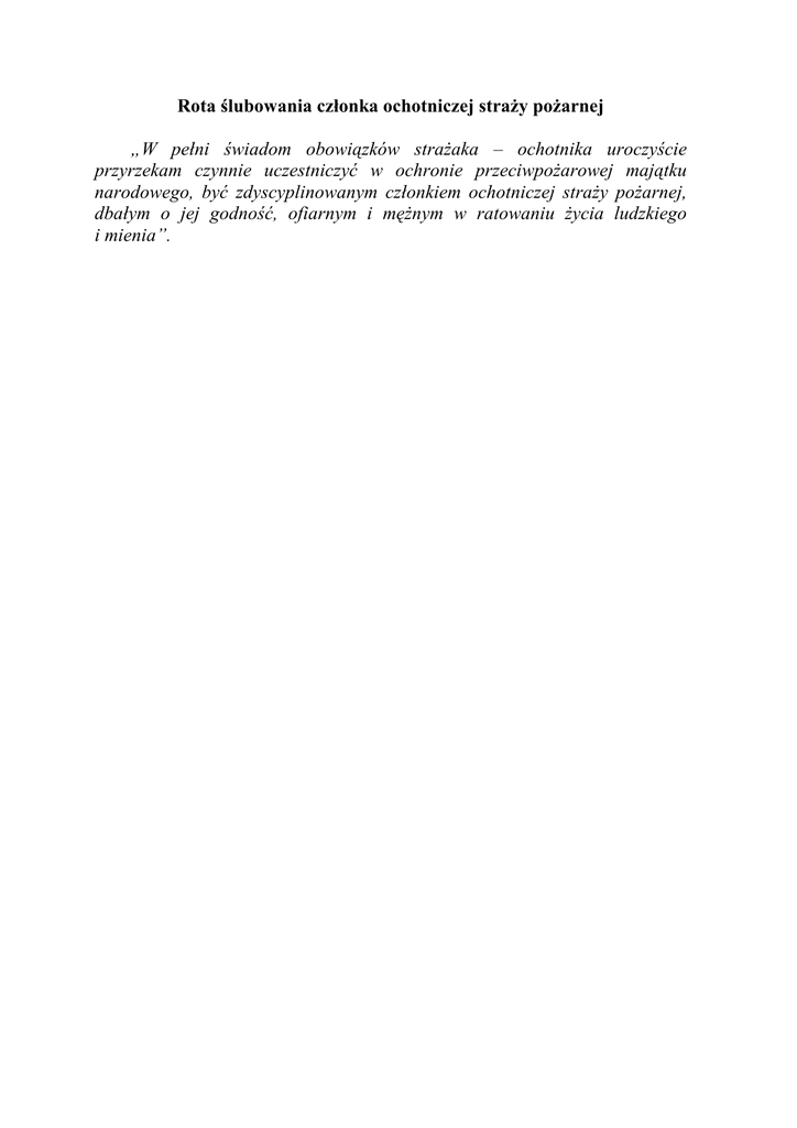 Rota ślubowania członka ochotniczej straŜy poŜarnej „W pełni świadom obowiązków straŜaka – ochotnika uroczyście przyrzekam czynnie uczestniczyć w ochronie przeciwpoŜarowej majątku narodowego, być zdyscyplinowanym członkiem ochotniczej straŜy poŜarnej, dbałym o jej godność, ofiarnym i męŜnym w ratowaniu Ŝycia ludzkiego i mienia”.