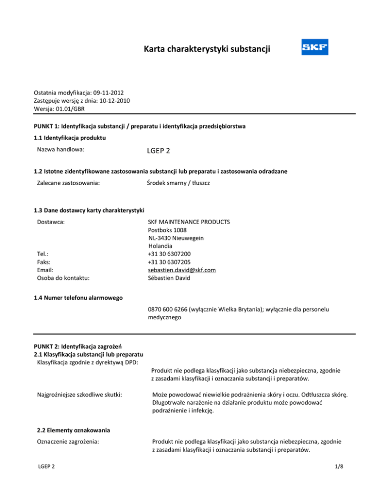 Karta charakterystyki substancji Ostatnia modyfikacja: 09-11-2012 Zastępuje wersję z dnia: 10-12-2010 Wersja: 01.01/GBR PUNKT 1: Identyfikacja substancji / preparatu i identyfikacja przedsiębiorstwa 1.1 Identyfikacja produktu Nazwa handlowa: LGEP 2 1.2 Istotne zidentyfikowane zastosowania substancji lub preparatu i zastosowania odradzane Zalecane zastosowania: Środek smarny / tłuszcz 1.3 Dane dostawcy karty charakterystyki Dostawca: Tel.: Faks: Email: Osoba do kontaktu: SKF MAINTENANCE PRODUCTS Postboks 1008 NL-3430 Nieuwegein Holandia +31 30 6307200 +31 30 6307205 [email protected] Sébastien David 1.4 Numer telefonu alarmowego 0870 600 6266 (wyłącznie Wielka Brytania); wyłącznie dla personelu medycznego PUNKT 2: Identyfikacja zagrożeń 2.1 Klasyfikacja substancji lub preparatu Klasyfikacja zgodnie z dyrektywą DPD: Produkt nie podlega klasyfikacji jako substancja niebezpieczna, zgodnie z zasadami klasyfikacji i oznaczania substancji i preparatów. Najgroźniejsze szkodliwe skutki: Może powodować niewielkie podrażnienia skóry i oczu. Odtłuszcza skórę. Długotrwałe narażenie na działanie produktu może powodować podrażnienie i infekcję. 2.2 Elementy oznakowania Oznaczenie zagrożenia: LGEP 2 Produkt nie podlega klasyfikacji jako substancja niebezpieczna, zgodnie z zasadami klasyfikacji i oznaczania substancji i preparatów. 1/8 Pozostałe oznaczenia: Karta charakterystyki substancji udostępniana jest zawodowym użytkownikom na życzenie. 2.3 Inne zagrożenia Nie dokonano oceny właściwości PBT i vPvB. PUNKT 3: Skład i informacje o składnikach 3.2 Preparaty Nr rejestracji - Nr CAS / WE Nazwa substancji Klasyfikacja DSD / CLP 68649-42-3 272-028-3 Kwas dwutiofosforowy, O, O-di-C1-14-alkilo estry, sole cynkowe Xi;R38-41 N; R51/53 działa drażniąco na skórę kat. 2; H315 działa szkodliwie na oczy kat. 1; H318 - - - Zagrożenie dla środowiska wodnego – toksyczność przewlekła kat. 2; H411 Stężenie (% wag.) < 2,5 - Uwaga - - - Pełna treść zwrotów R i zwrotów H została zawarta w punkcie 16. PUNKT 4: Środki pierwszej pomocy 4.1 Opis środków pierwszej pomocy Narażenie przez drogi oddechowe: Zaczerpnąć świeżego powietrza. W razie utrzymywania się dolegliwości skorzystać z pomocy medycznej. Narażenie przez przewód pokarmowy: Dokładnie wypłukać usta wodą i małymi łykami wypić 1-2 szklanki wody. W razie utrzymywania się dolegliwości skorzystać z pomocy medycznej. Narażenie przez kontakt ze skórą: Zdjąć nasączoną odzież. Przemyć skórę wodą z mydłem. W razie utrzymywania się dolegliwości skorzystać z pomocy medycznej. Narażenie przez kontakt z oczami: Przemywać oczy wodą (wskazane zastosowanie urządzenia do przemywania oczu) do chwili ustąpienia podrażnienia. W razie utrzymywania się dolegliwości skorzystać z pomocy medycznej. Pozostałe informacje: Przedstawić niniejszą kartę charakterystyki lub etykietę produktu osobie udzielającej pomocy medycznej. 4.2 Najważniejsze ostre i opóźnione objawy oraz skutki narażenia Może powodować niewielkie podrażnienie skóry i oczu. Odtłuszcza skórę. Długotrwałe narażenie na działanie produktu może powodować podrażnienie i infekcję. 4.3 Wskazania dotyczące natychmiastowej pomocy medycznej i szczególnego postępowania z poszkodowanym Leczyć objawowo. Nie jest wymagana natychmiastowa pomoc medyczna. LGEP 2 2/8 PUNKT 5: Postępowanie w przypadku pożaru 5.1 Środki gaśnicze Odpowiednie środki gaśnicze: Gasić proszkiem gaśniczym, pianą gaśniczą, dwutlenkiem węgla lub mgłą wodną. Nieobjęty pożarem skład substancji chłodzić wodą lub mgłą wodną. Niewłaściwe środki gaśnicze: Nie stosować bezpośredniego strumienia wody, gdyż może to prowadzić do rozprzestrzenienia ognia. 5.2 Szczególne zagrożenia związane z substancją lub preparatem Produkt nie jest łatwopalny, lecz jest wybuchowy. Podczas spalania może wydzielać produkty spalania zawierające tlenek węgla. 5.3 Informacje dla straży pożarnej Usunąć pojemniki z substancją ze strefy zagrożenia, jeżeli jest to możliwe bez narażenia na ryzyko. Unikać wdychania par i produktów spalania – zaczerpnąć świeżego powietrza. Zawsze używać aparatów powietrznych butlowych (SCBA) oraz rękawic chroniących przed czynnikami chemicznymi. PUNKT 6: Postępowanie w przypadku niezamierzonego uwolnienia do środowiska 6.1 Środki ochrony osobistej, sprzęt ochronny i postępowanie w sytuacjach awaryjnych Dla osób nienależących do personelu udzielającego pomocy: Założyć gogle ochronne, jeżeli istnieje ryzyko rozprysku substancji do oka. Założyć rękawice ochronne. Dla osób udzielających pomocy: Oprócz powyższych środków: zaleca się założenie odzieży ochronnej zgodnej z normą EN 469. 6.2 Środki ostrożności w zakresie ochrony środowiska Nie odprowadzać dużych ilości skoncentrowanej substancji ani osadu do kanalizacji. 6.3 Metody i materiały zapobiegające rozprzestrzenianiu się skażenia i służące do usuwania skażenia Zebrać i zabsorbować rozlany produkt przy użyciu piasku lub innej substancji chłonnej i złożyć w odpowiednim pojemniku na odpady. Szmatką wytrzeć mniejsze zanieczyszczenia produktem. 6.4 Odniesienia do pozostałych punktów Informacje na temat wyposażenia ochronnego zostały zawarte w punkcie 8. Informacje na temat składania odpadów zostały zawarte w punkcie 13. LGEP 2 3/8 PUNKT 7: Postępowanie z substancjami i preparatami oraz ich magazynowanie 7.1 Środki ostrożności dotyczące bezpiecznego postępowania Używać produktu w warunkach dobrej wentylacji, najlepiej z odprowadzaniem powietrza (wentylacja procesu roboczego). Zapewnić dostęp do bieżącej wody i urządzenia do przemywania oczu. Umyć ręce przed przerwą w pracy, przed korzystaniem z toalety i po zakończeniu pracy. 7.2 Warunki bezpiecznego przechowywania i informacje dotyczące wzajemnych niezgodności Przechowywać w bezpiecznym miejscu, niedostę