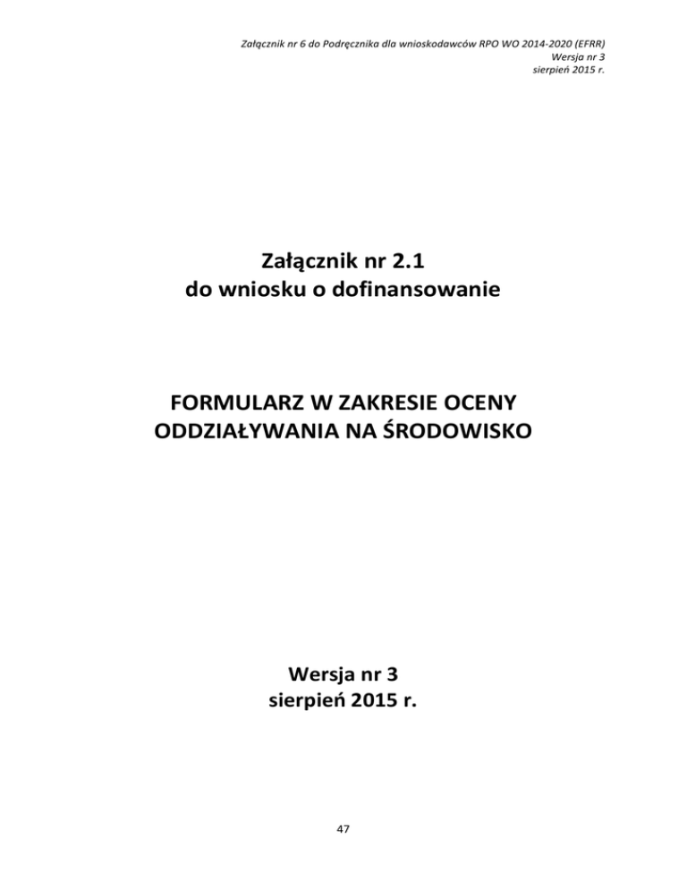 Załącznik nr 6 do Podręcznika dla wnioskodawców RPO WO 2014-2020 (EFRR) Wersja nr 3 sierpień 2015 r. Załącznik nr 2.1 do wniosku o dofinansowanie FORMULARZ W ZAKRESIE OCENY ODDZIAŁYWANIA NA ŚRODOWISKO Wersja nr 3 sierpień 2015 r. 47 Załącznik nr 6 do Podręcznika dla wnioskodawców RPO WO 2014-2020 (EFRR) Wersja nr 3 sierpień 2015 r. Nazwa i adres wnioskodawcy (miejsce i data) FORMULARZ W ZAKRESIE OCENY ODDZIAŁYWANIA NA ŚRODOWISKO A.1. Zgodność projektu z polityką ochrony środowiska: A.1.1. Należy opisać, w jaki sposób projekt przyczynia się do realizacji celów polityki ochrony środowiska, w tym w zakresie zmiany klimatu, oraz w jaki sposób uwzględniono przedmiotowe cele w danym projekcie (w szczególności należy rozważyć następujące kwestie: efektywną gospodarkę zasobami, zachowanie różnorodności biologicznej i usług ekosystemowych, zmniejszenie emisji gazów cieplarnianych, odporność na skutki zmiany klimatu itp.). A.1.2. Należy opisać, w jaki sposób projekt jest zgodny z zasadą ostrożności, zasadą działania zapobiegawczego oraz zasadą naprawiania szkody w pierwszym rzędzie u źródła i zasadą „zanieczyszczający płaci”. A.2. Stosowanie dyrektywy 2001/42/WE Parlamentu Europejskiego i Rady1 („dyrektywa SEA”) A.2.1. Czy projekt jest realizowany w wyniku planu lub programu, innego niż program operacyjny? □ TAK □ NIE A.2.2 Jeżeli w odpowiedzi na pytanie A.2.1 zaznaczono „TAK”, należy określić, czy dany plan lub program podlegał strategicznej ocenie oddziaływania na środowisko zgodnie z dyrektywą SEA □ TAK □ NIE − Jeżeli zaznaczono odpowiedź „NIE”, należy podać krótkie wyjaśnienie: − Jeżeli zaznaczono odpowiedź „TAK”, należy podać nietechniczne streszczenie2 prognozy oddziaływania na środowisko oraz informacji wymaganych w art. 9 ust. 1 lit. b) przedmiotowej dyrektywy (łącze internetowe albo kopię elektroniczną): 1 Dyrektywa 2001/42/WE Parlamentu Europejskiego i Rady z dnia 27 czerwca 2001 r. w sprawie oceny wpływu niektórych planów i programów na środowisko (Dz.U. L 197 z 21.7.2001, s. 30). 2 Przygotowane zgodnie z art. 5 i załącznikiem I do dyrektywy 2001/42/WE. 48 Załącznik nr 6 do Podręcznika dla wnioskodawców RPO WO 2014-2020 (EFRR) Wersja nr 3 sierpień 2015 r. A.3. Stosowanie dyrektywy 2011/92/WE Parlamentu Europejskiego i Rady3 („dyrektywa OOŚ”) A.3.1. W przypadku niespełnienia warunku wstępnego dotyczącego przepisów w dziedzinie ochrony środowiska (dyrektywa 2011/92/UE i dyrektywa 2001/42/WE), zgodnie z art. 19 rozporządzenia (UE) nr 1303/2013, należy przedstawić łącze internetowe do uzgodnionego planu działania A.3.2. Czy projekt wymieniono w następujących załącznikach do dyrektywy OOŚ4: — załączniku I do tej dyrektywy (należy przejść do pytania A.3.3); — załączniku II do tej dyrektywy (należy przejść do pytania A.3.4); — żadnym z powyższych załączników (należy przejść do pytania A.4) — należy przedstawić wyjaśnienie poniżej. A.3.3. Jeżeli projekt objęty jest załącznikiem I do dyrektywy OOŚ, należy załączyć następujące dokumenty i skorzystać z poniższego pola tekstowego w celu przedstawienia dodatkowych informacji i wyjaśnień5: a) nietechniczne streszczenie sprawozdania z OOŚ6; b) informacje na temat konsultacji z organami ds. ochrony środowiska, ze społeczeństwem oraz w stosownych przypadkach z innymi państwami członkowskimi przeprowadzonych zgodnie z art. 6 i 7 dyrektywy OOŚ; c) decyzję właściwego organu wydaną zgodnie z art. 8 i 9 dyrektywy OOŚ7, w tym informacje dotyczące sposobu podania jej do wiadomości publicznej. 3 Dyrektywa Parlamentu Europejskiego i Rady 2011/92/UE z dnia 13 grudnia 2011 r. w sprawie oceny skutków wywieranych przez niektóre przedsięwzięcia publiczne i prywatne na środowisko (Dz.U. L 26 z 28.1.2012, s. 1) 4 Jeżeli projekt składa się z szeregu robót/działań/usług, które są zaklasyfikowane do różnych grup, informacje należy podać oddzielnie dla poszczególnych zadań inwestycyjnych. 5 Dodatkowe informacje powinny obejmować głównie wybrane elementy procedury OOŚ istotne w odniesieniu do projektu (np. analizę danych, badania i oceny, dodatkowe konsultacje z właściwymi organami i społeczeństwem, określenie dodatkowych środków kompensujących/zmniejszających ryzyko, dodatkową decyzję dotyczącą preselekcji itp., gdy istnieje prawdopodobieństwo zidentyfikowania zmian w projekcie), którą należy przeprowadzić, w szczególności w ramach wieloetapowych procesów dotyczących zezwolenia na inwestycję. 6 Przygotowane zgodnie z art. 5 i załącznikiem IV do dyrektywy 2011/92/UE. 7 W przypadkach gdy procedurę OOŚ zakończono prawnie wiążącą decyzją przed wydaniem zezwolenia na inwestycję zgodnie z art. 8 i 9 dyrektywy 2011/92/UE, państwa członkowskie udostępniają pisemne zobowiązanie do terminowego działania w celu zapewnienia wydania zezwolenia na inwestycję najpóźniej przed rozpoczęciem prac. 49 Załącznik nr 6 do Podręcznika dla wnioskodawców RPO WO 2014-2020 (EFRR) Wersja nr 3 sierpień 2015 r. A.3.4. Jeżeli projekt objęty jest załącznikiem II do przedmiotowej dyrektywy, czy przeprowadzono ocenę oddziaływania na środowisko? □ TAK □ NIE — Jeżeli zaznaczono odpowiedź „TAK”, należy załączyć niezbędne dokumenty wskazane w pkt A.3.3. — Jeżeli zaznaczono odpowiedź „NIE”, należy podać następujące informacje: a) ustalenie wymagane w art. 4 ust. 4 dyrektywy OOŚ (znane jako „decyzja dotycząca preselekcji”); b) progi, kryteria lub przeprowadzone indywidualne badania przedsięwzięć, które doprowadziły do wniosku, że OOŚ nie była wymagana (nie ma konieczności przedstawienia przedmiotowych informacji, jeżeli zawarto je już w decyzji wspomnianej w pkt a) powyżej); c) wyjaśnienie powodów, dla których projekt nie ma znaczących skutków środowiskowych, biorąc pod uwa