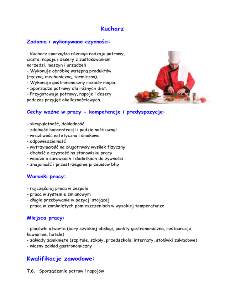 Kucharz Zadania i wykonywane czynności: - Kucharz sporządza różnego rodzaju potrawy, ciasta, napoje i desery z zastosowaniem narzędzi, maszyn i urządzeń - Wykonuje obróbkę wstępną produktów (ręczną, mechaniczną, termiczną). - Wykonuje gastronomiczny rozbiór mięsa. - Sporządza potrawy dla różnych diet. - Przygotowuje potrawy, napoje i desery podczas przyjęć okolicznościowych. Cechy ważne w pracy - kompetencje i predyspozycje: - skrupulatność, dokładność zdolność koncentracji i podzielność uwagi wrażliwość estetyczna i smakowa odpowiedzialność wytrzymałość na długotrwały wysiłek fizyczny dbałość o czystość na stanowisku pracy wiedza o surowcach i dodatkach do żywności znajomość i przestrzeganie przepisów bhp Warunki pracy: - najczęściej praca w zespole - praca w systemie zmianowym – długie przebywanie w pozycji stojącej - praca w zamkniętych pomieszczeniach w wysokiej temperaturze Miejsca pracy: - placówki otwarte (bary szybkiej obsługi, punkty gastronomiczne, restauracje, kawiarnie, hotele) - zakłady zamknięte (szpitale, szkoły, przedszkola, internaty, stołówki zakładowe) - własny zakład gastronomiczny Kwalifikacje zawodowe: T.6. Sporządzanie potraw i napojów